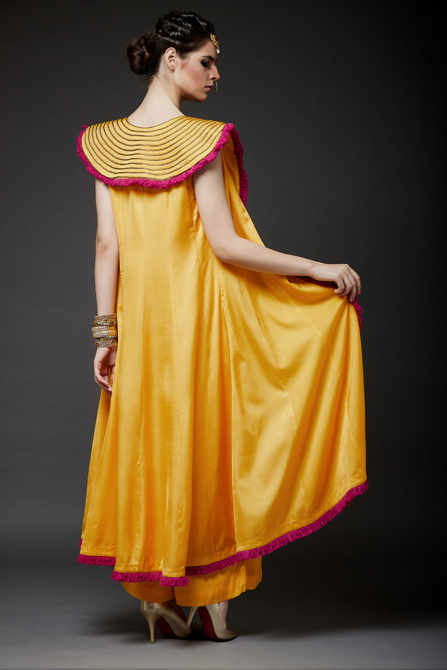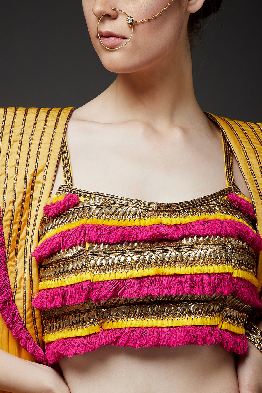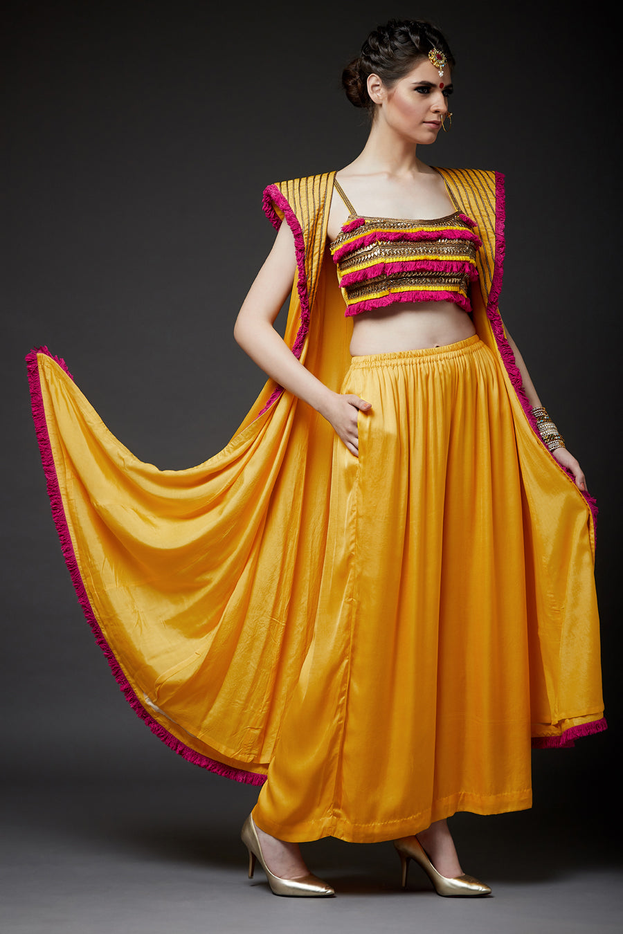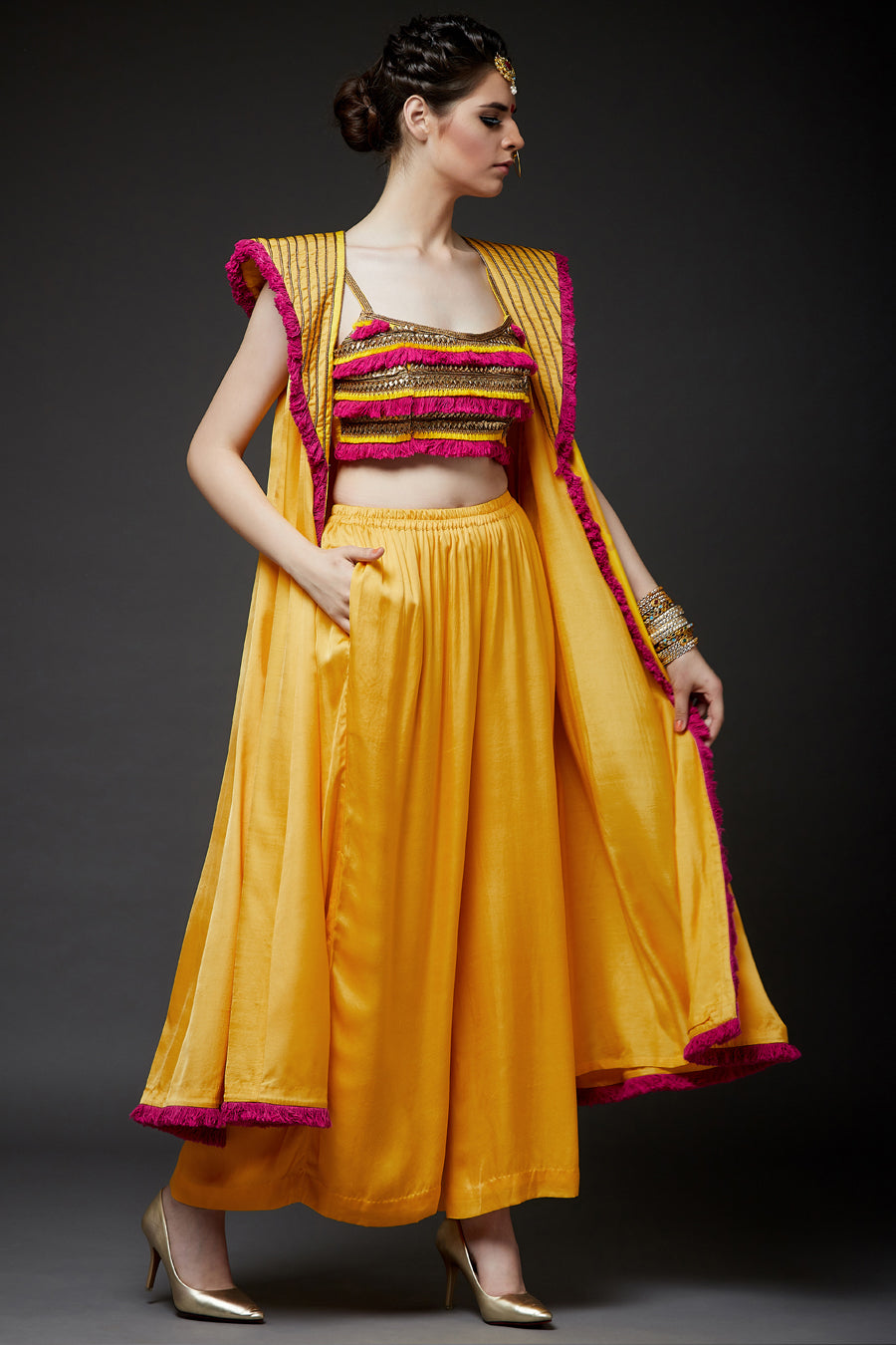 An embroidered crop top with a stylish yellow long embroidered jacket along with fuchsia lace on sides, paired with palazzo pants which is perfect for a sangeet or a mehendi function.