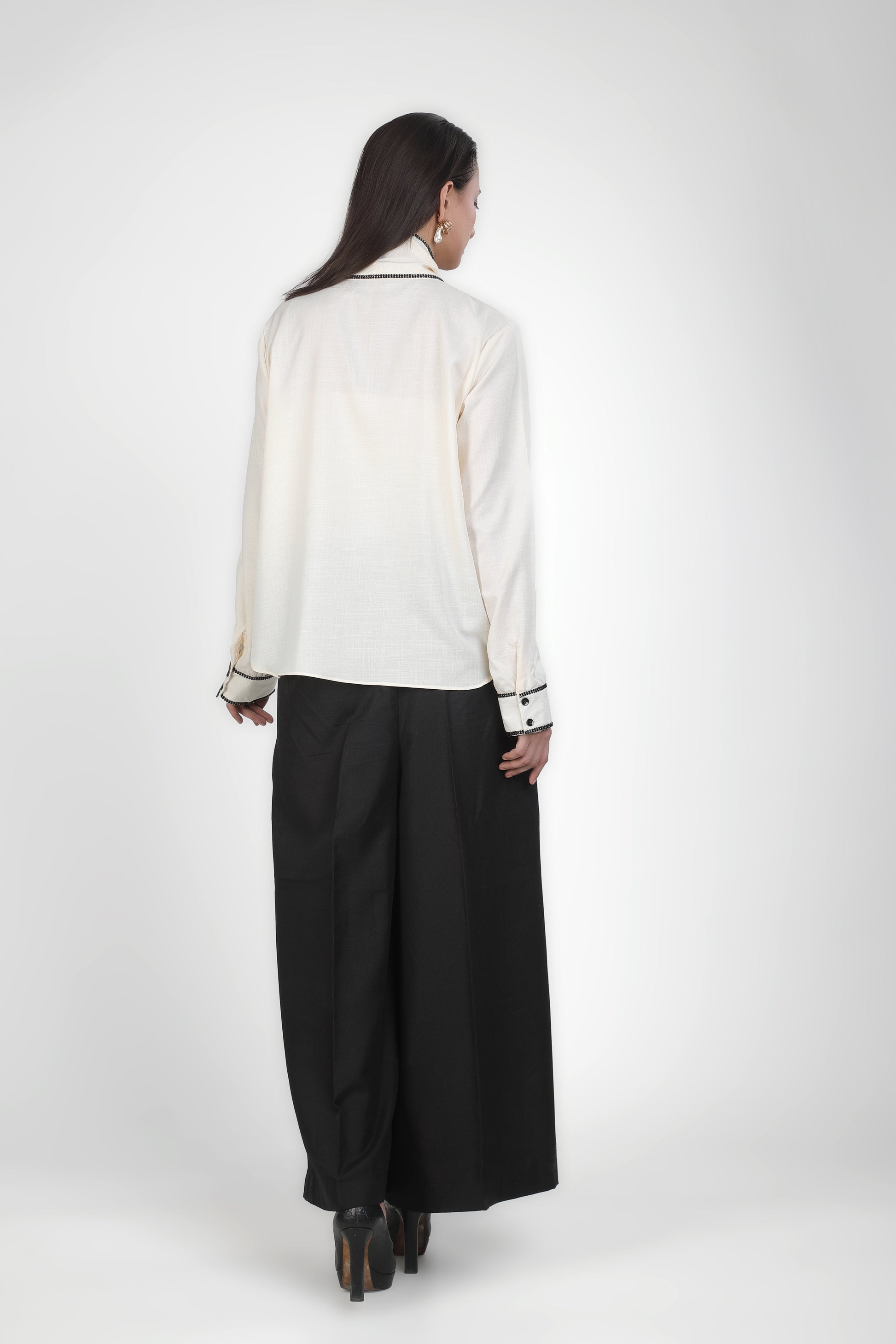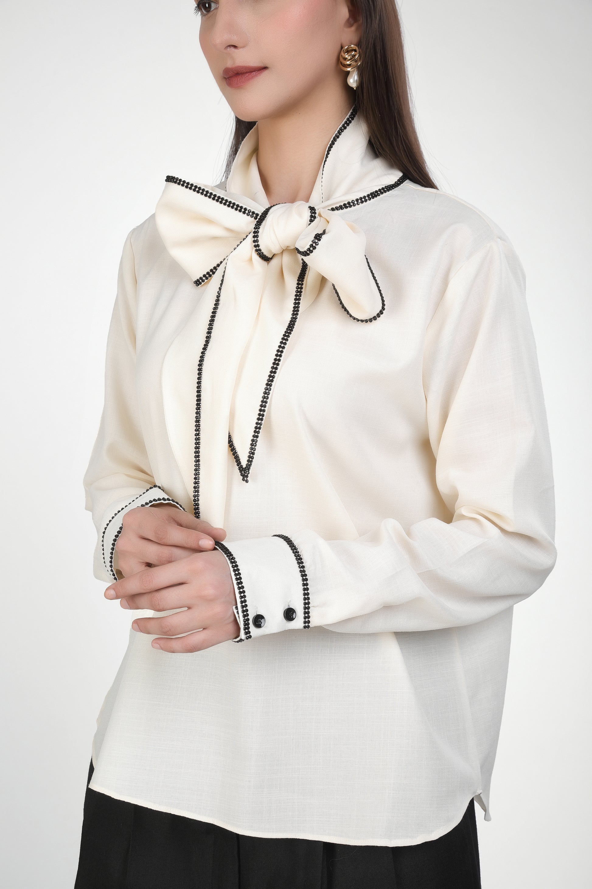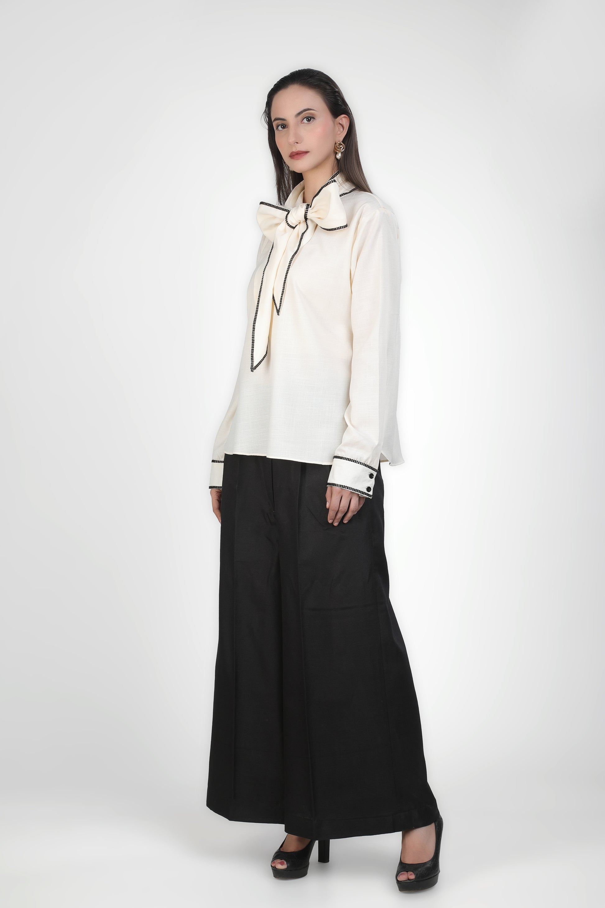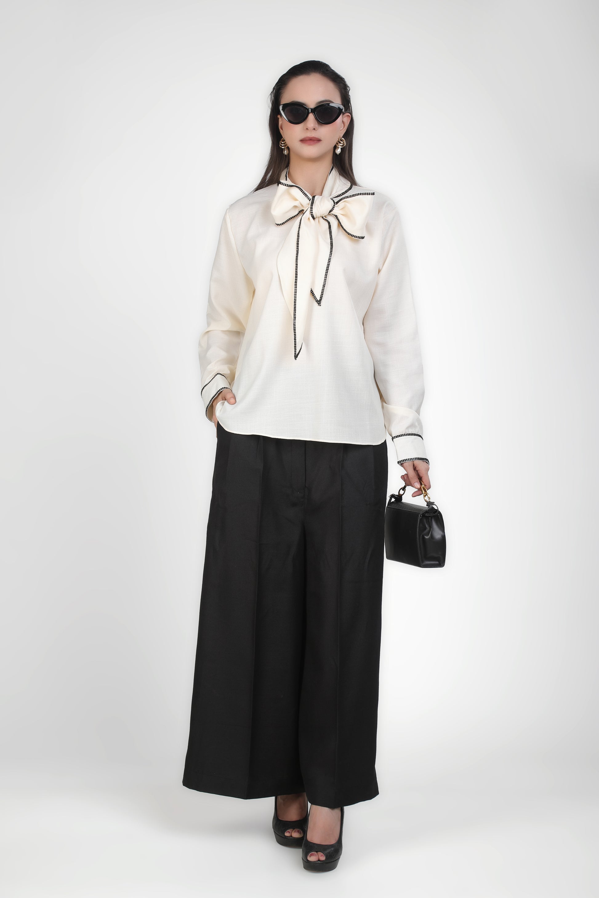 Featuring an ivory top with a black trimmed bow and matching cuffs details.