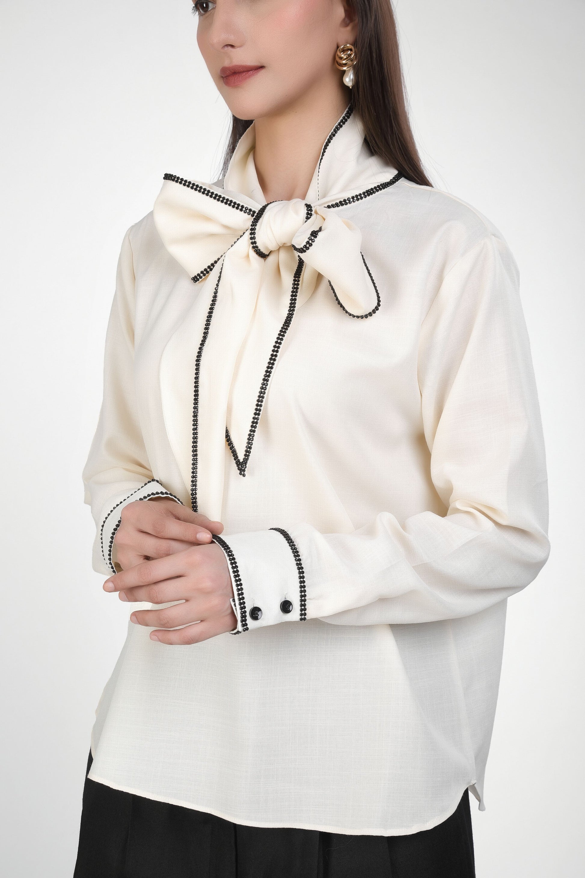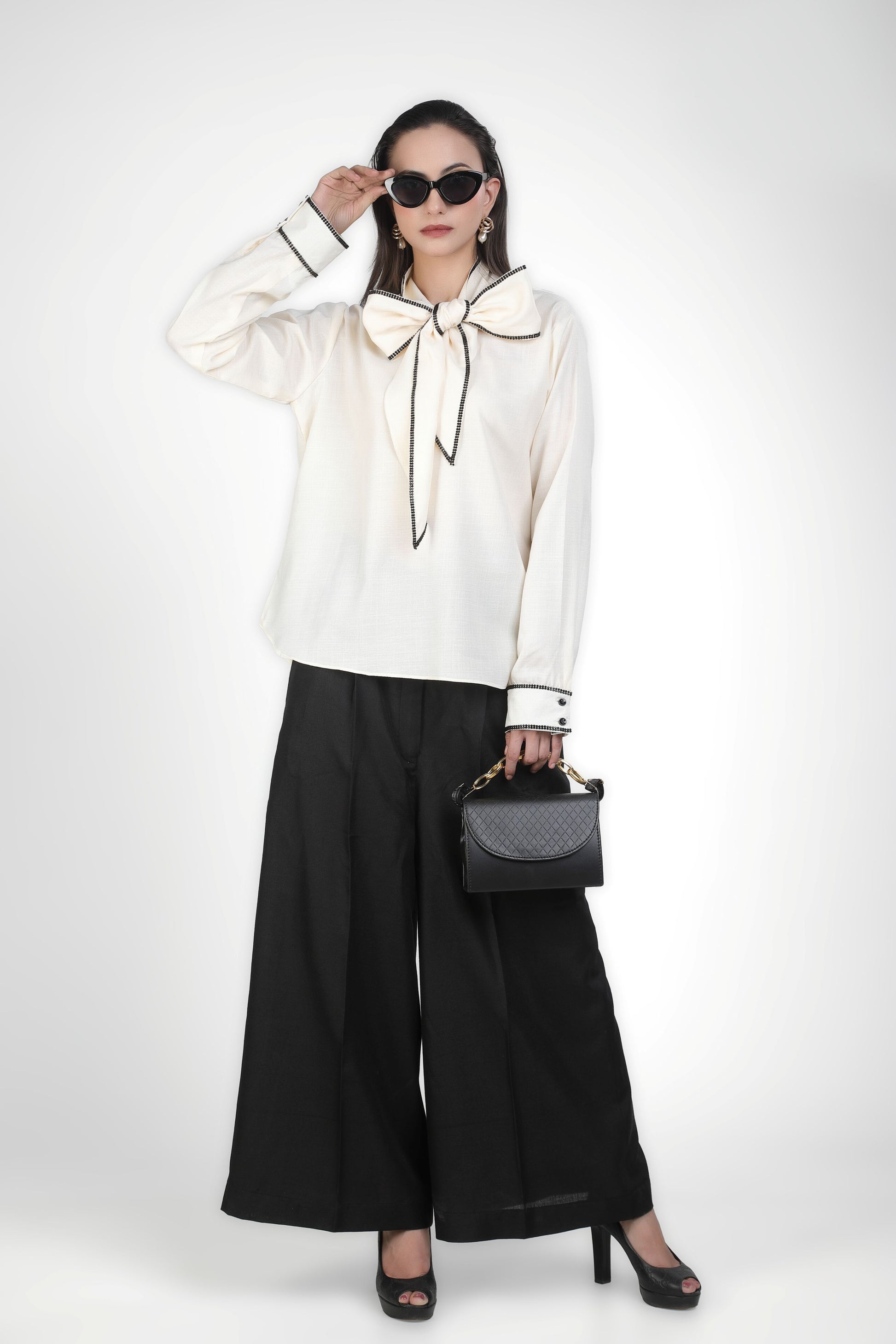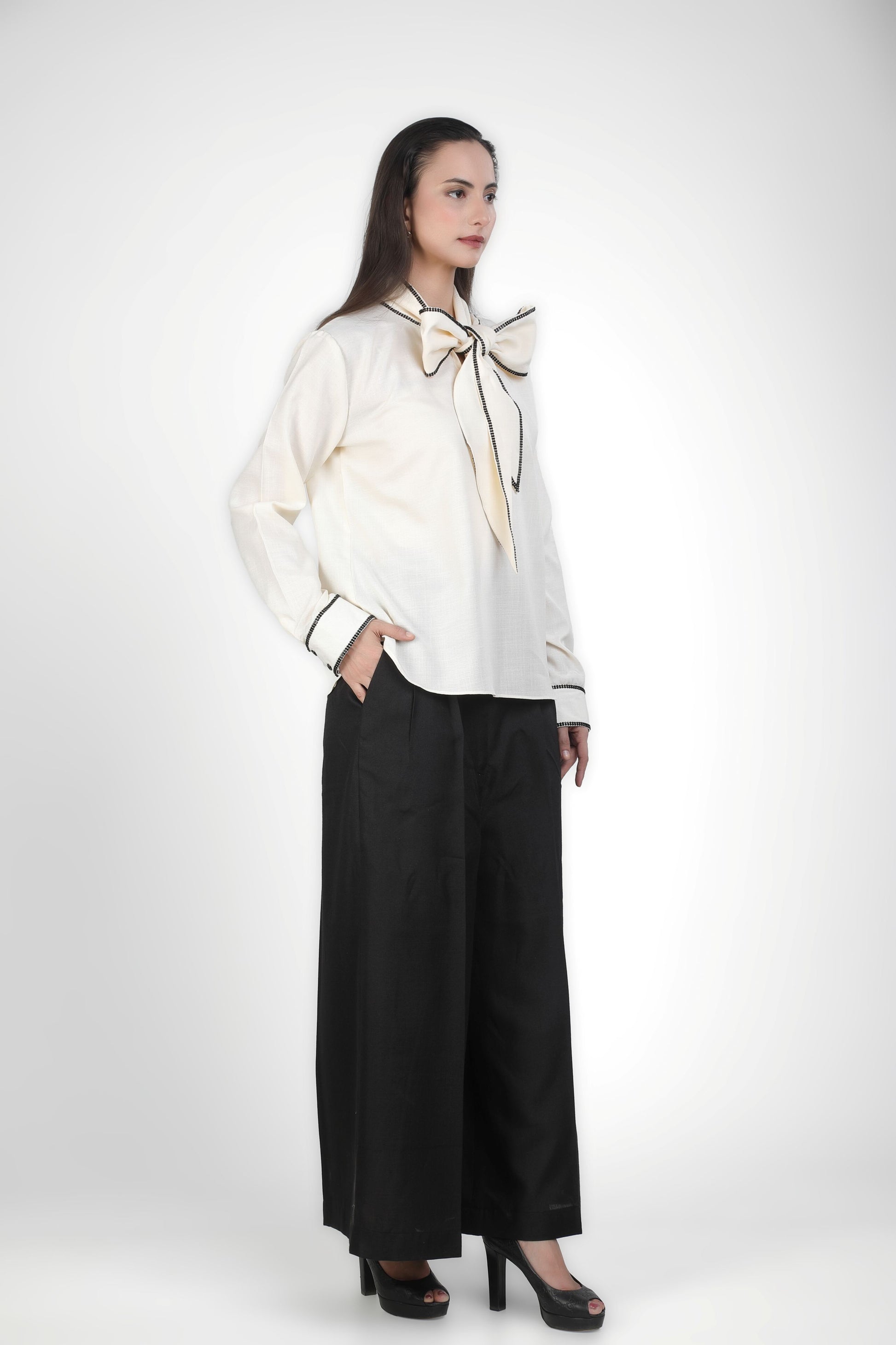 Featuring ivory bow style shirt, it is paired with black flared trousers based in soft linen blend.