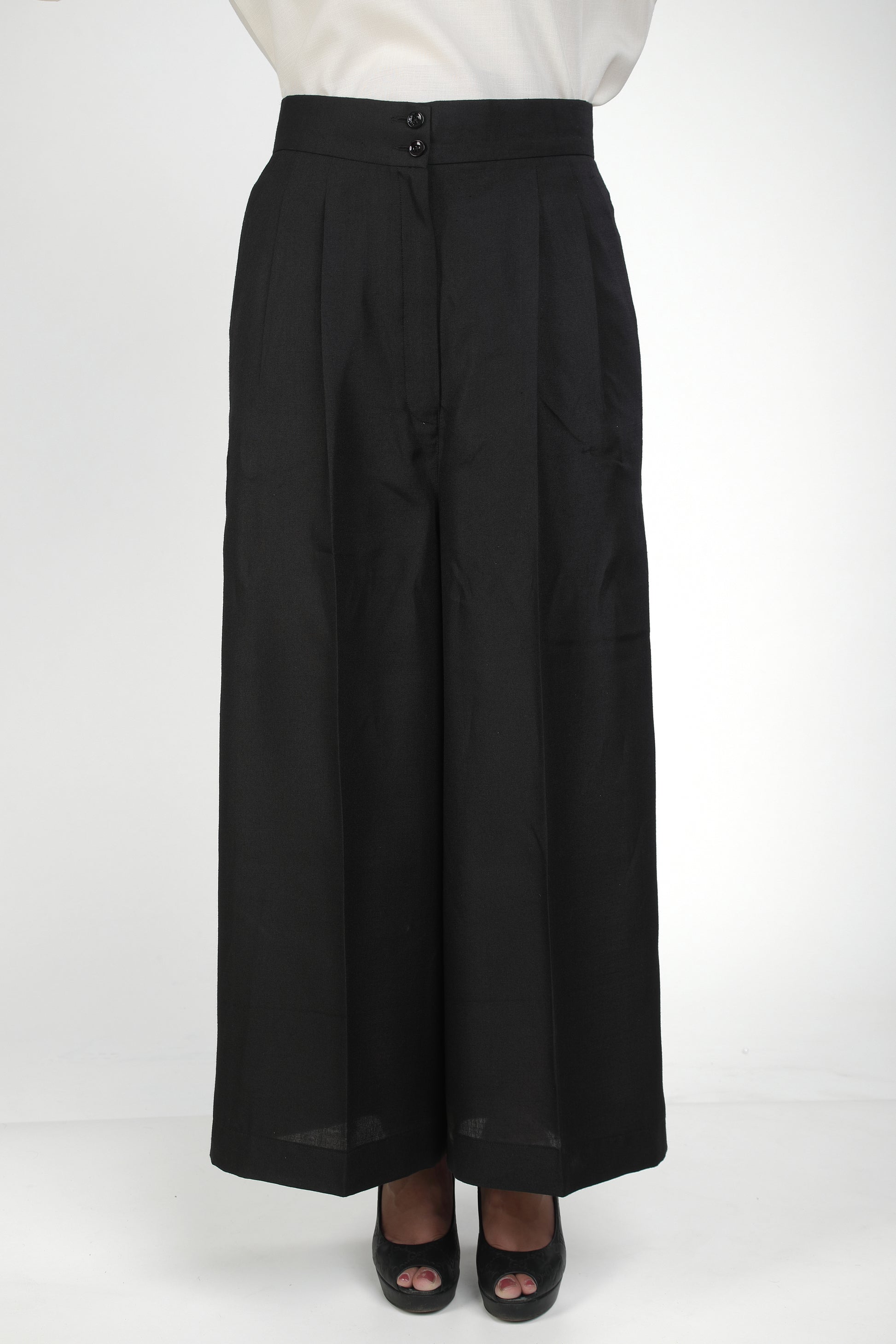 Featuring a black high-waisted wide-leg pants with front pleats and button closure.