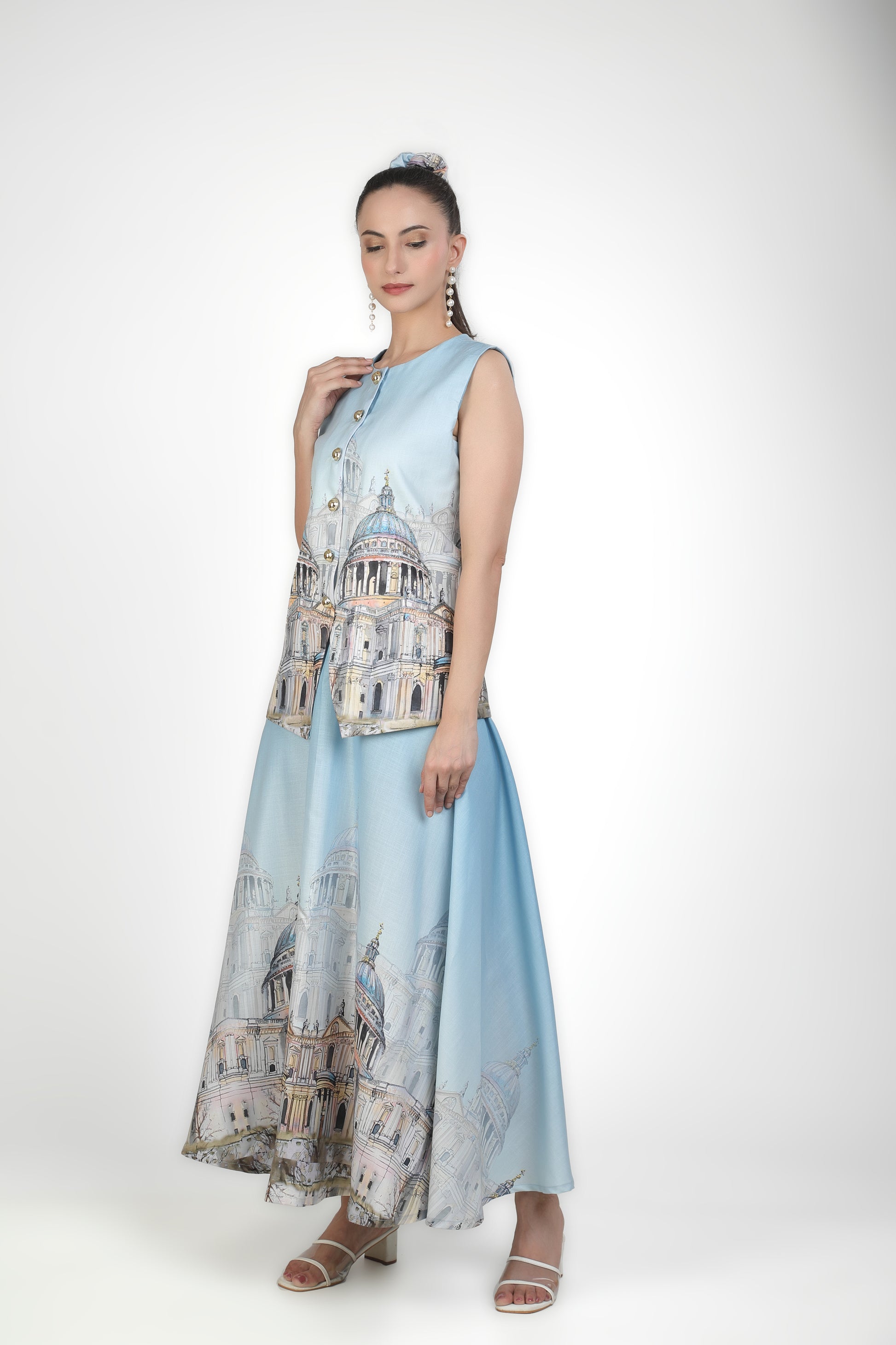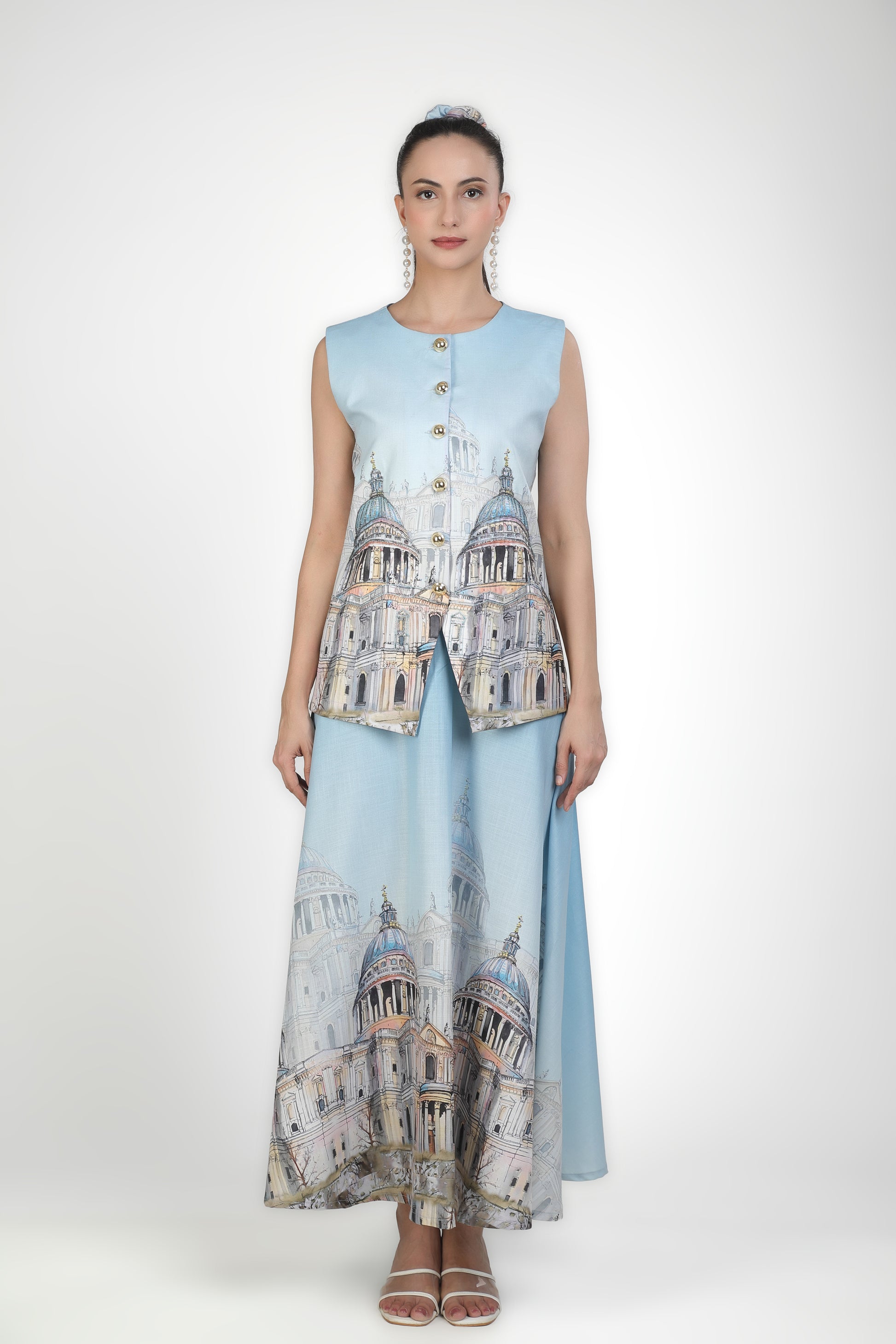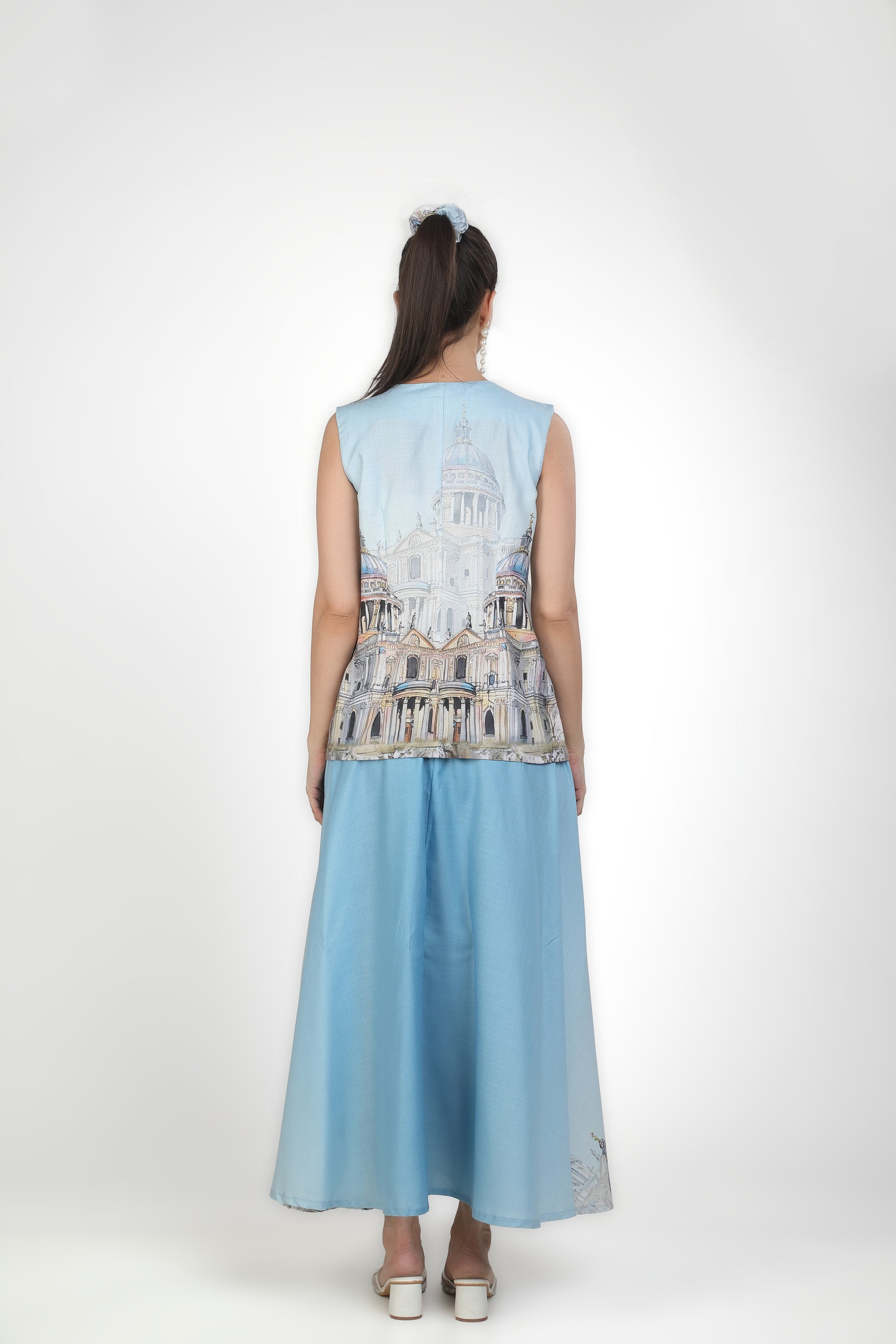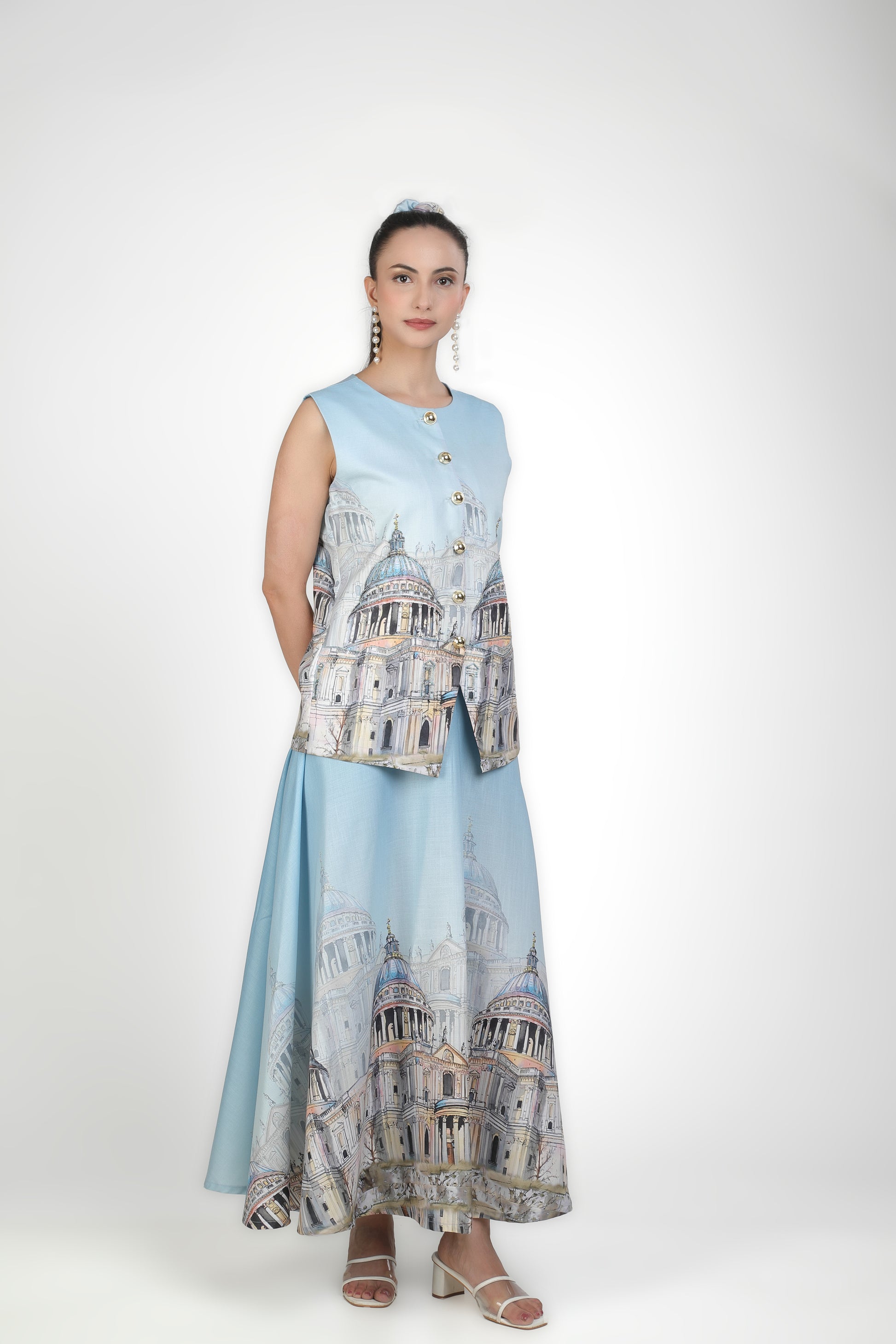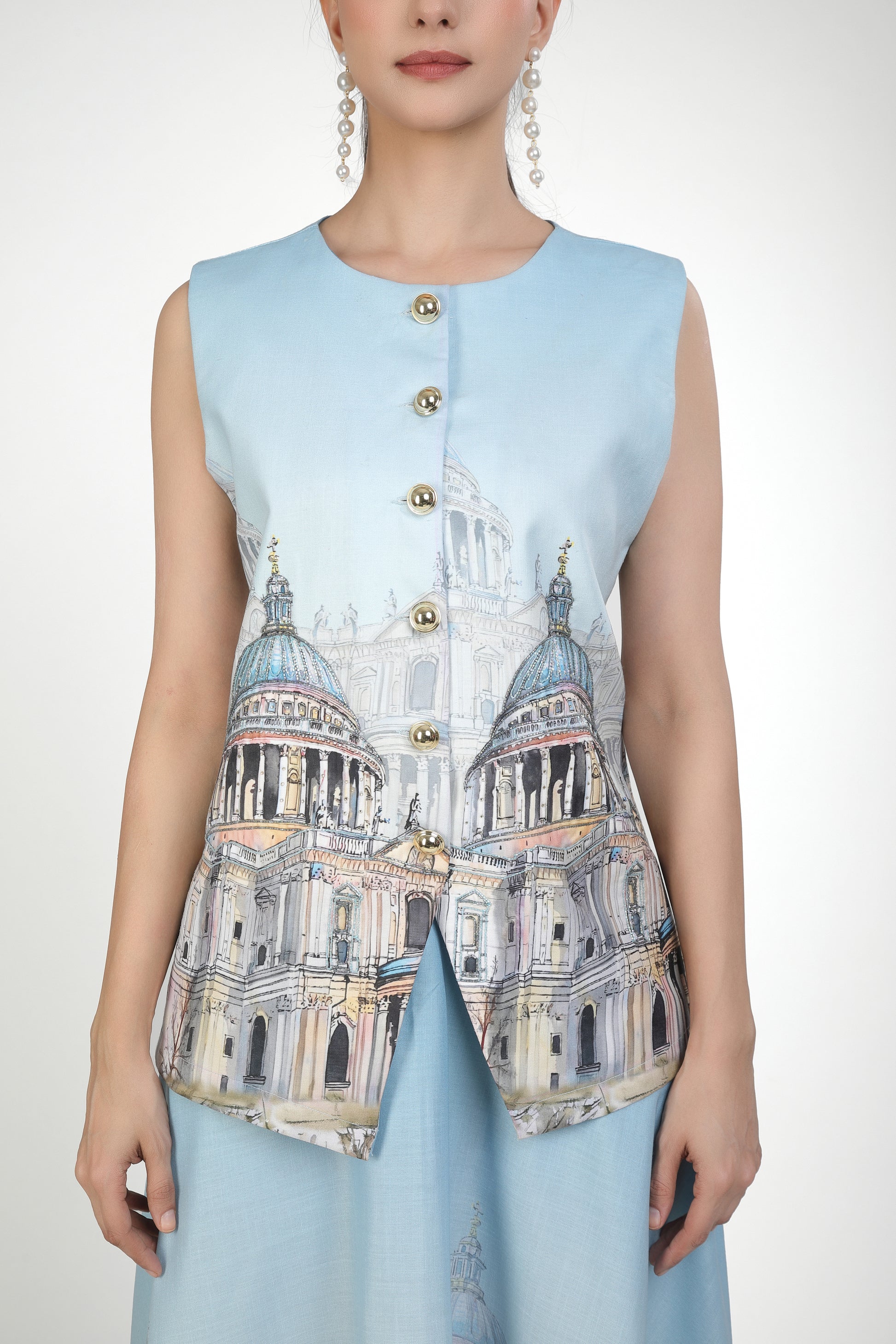Featuring soft blue front button style vest top with Renaissance-inspired Duomo Cathedral print. Paired with Skirt in soft linen.