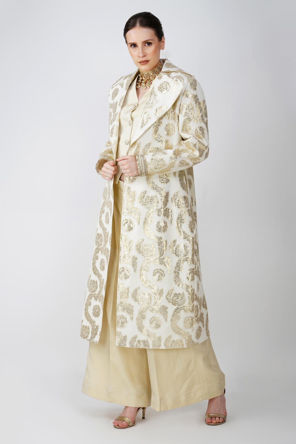 Beige Jacquard long jacet with waistcoat Ensemble (Set of 3)