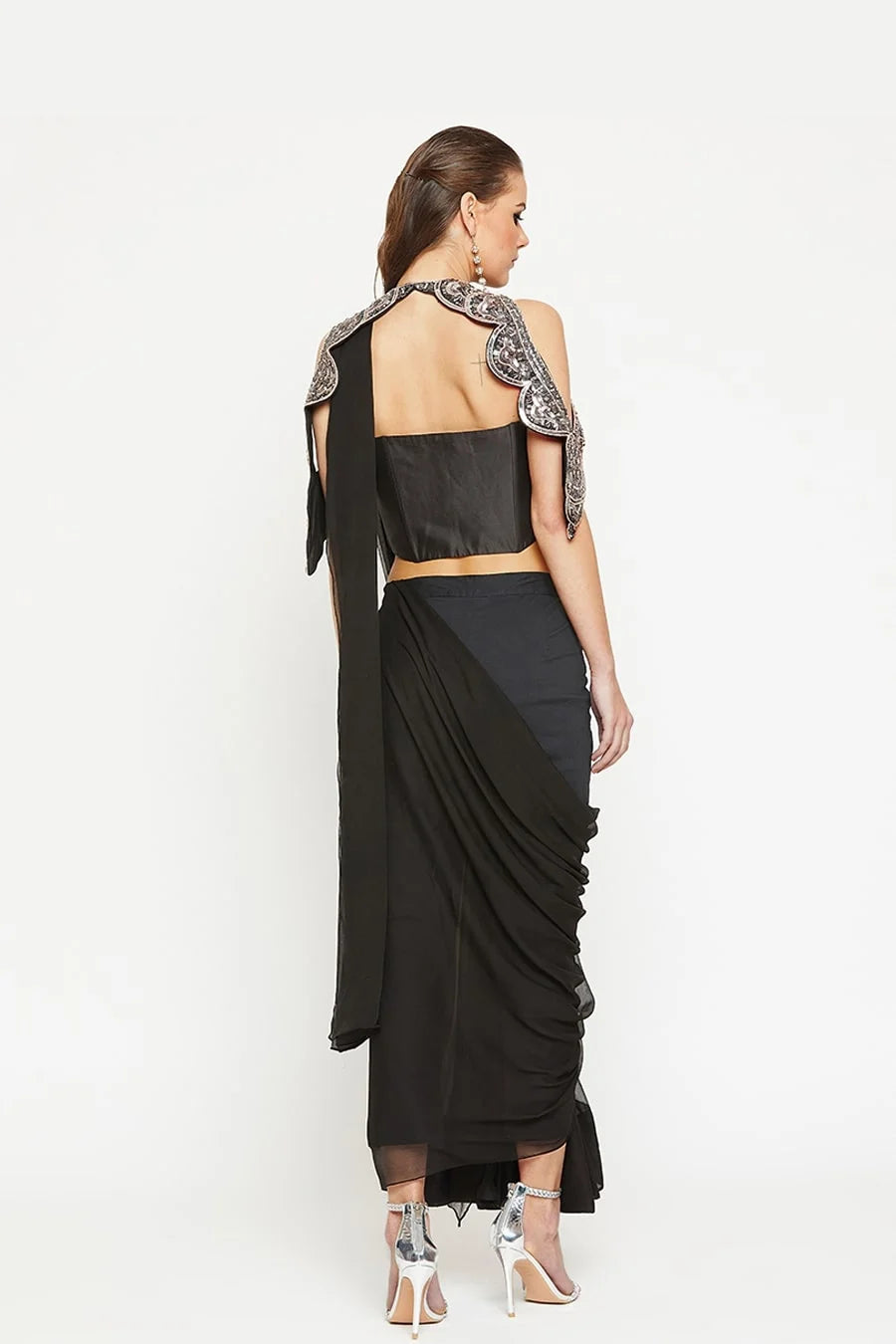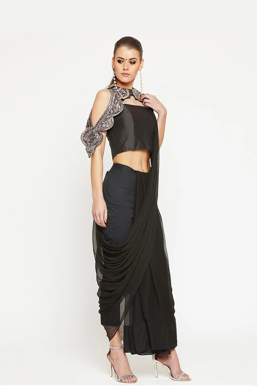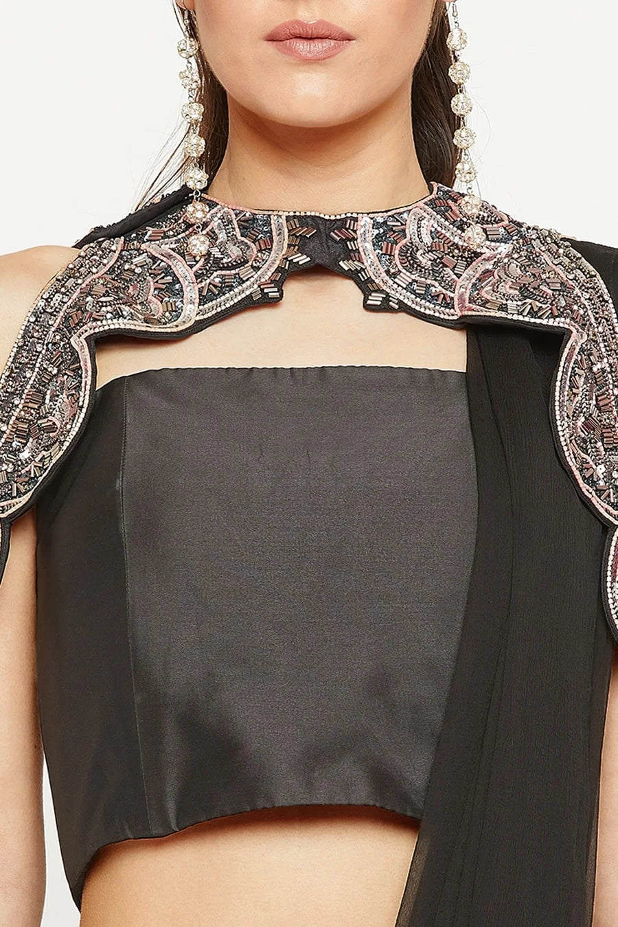 Black Saree with Detachable Collar. The Saree Comes with A Tube Style Blouse, A Detachable Collar. Embellished with Zircons, Beads, Sequins.
