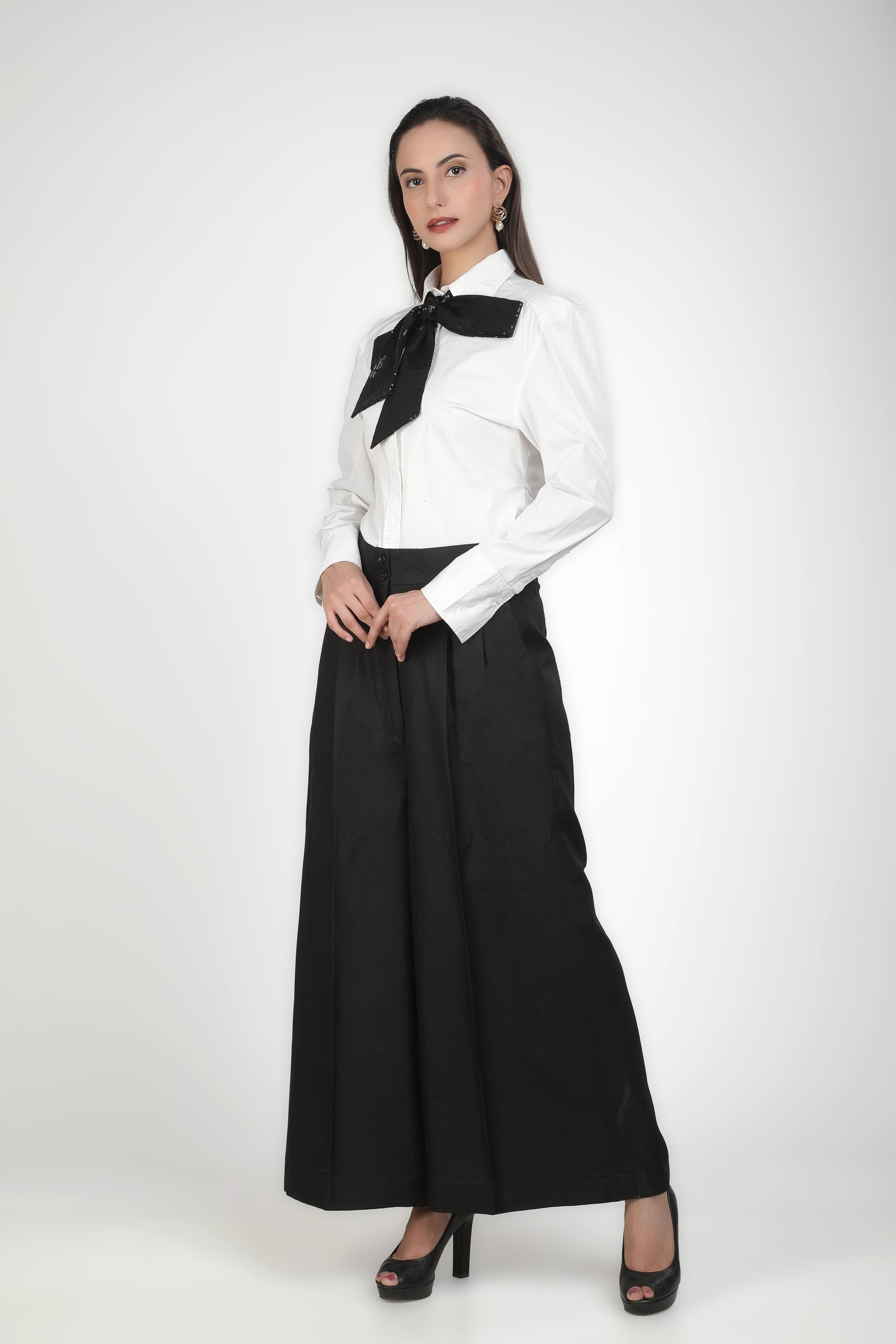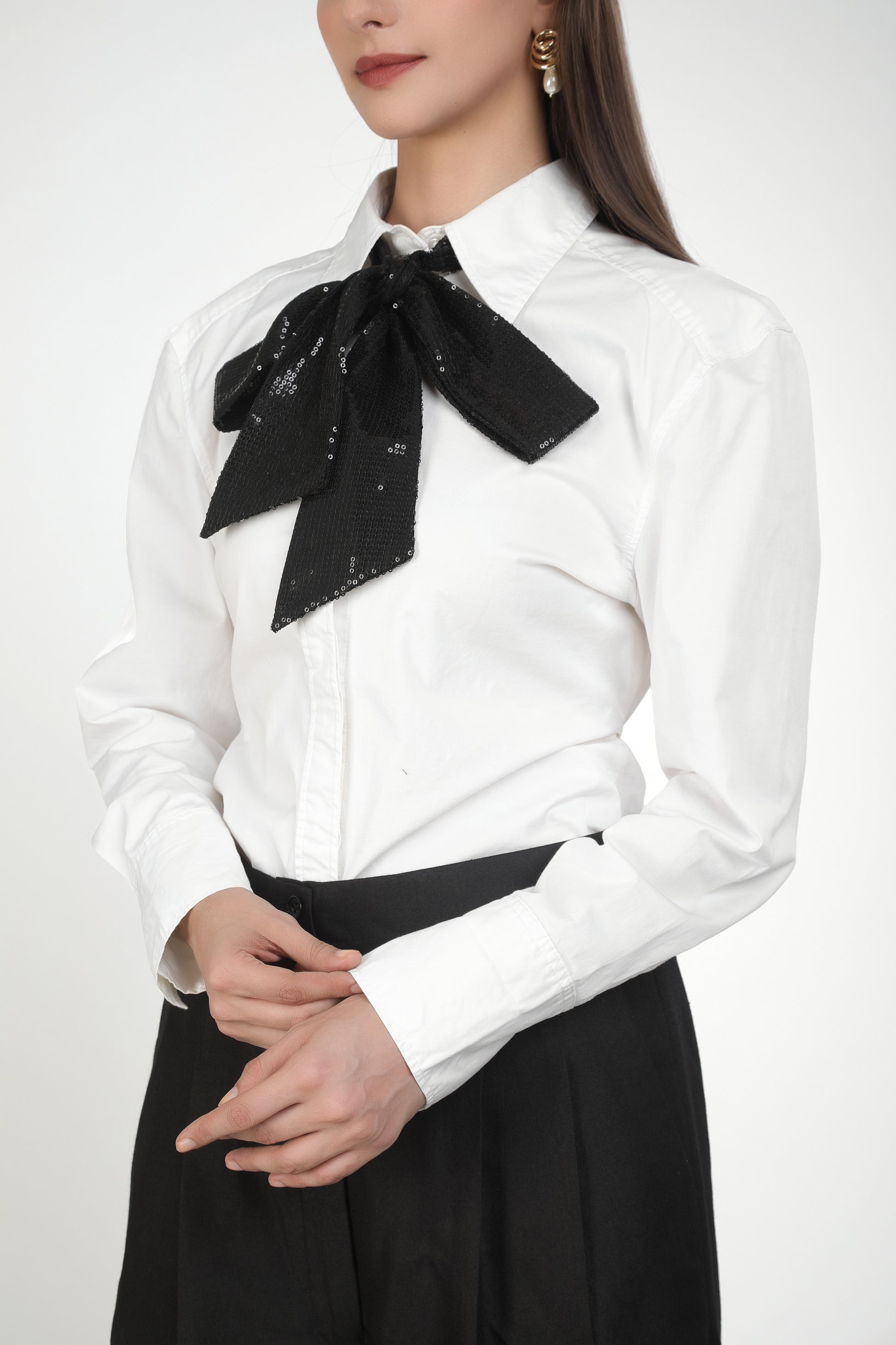 Featuring a white shirt based in white poplin. Paired with high waisted wide-leg black trousers based in linen base. Adored with sequin bow.