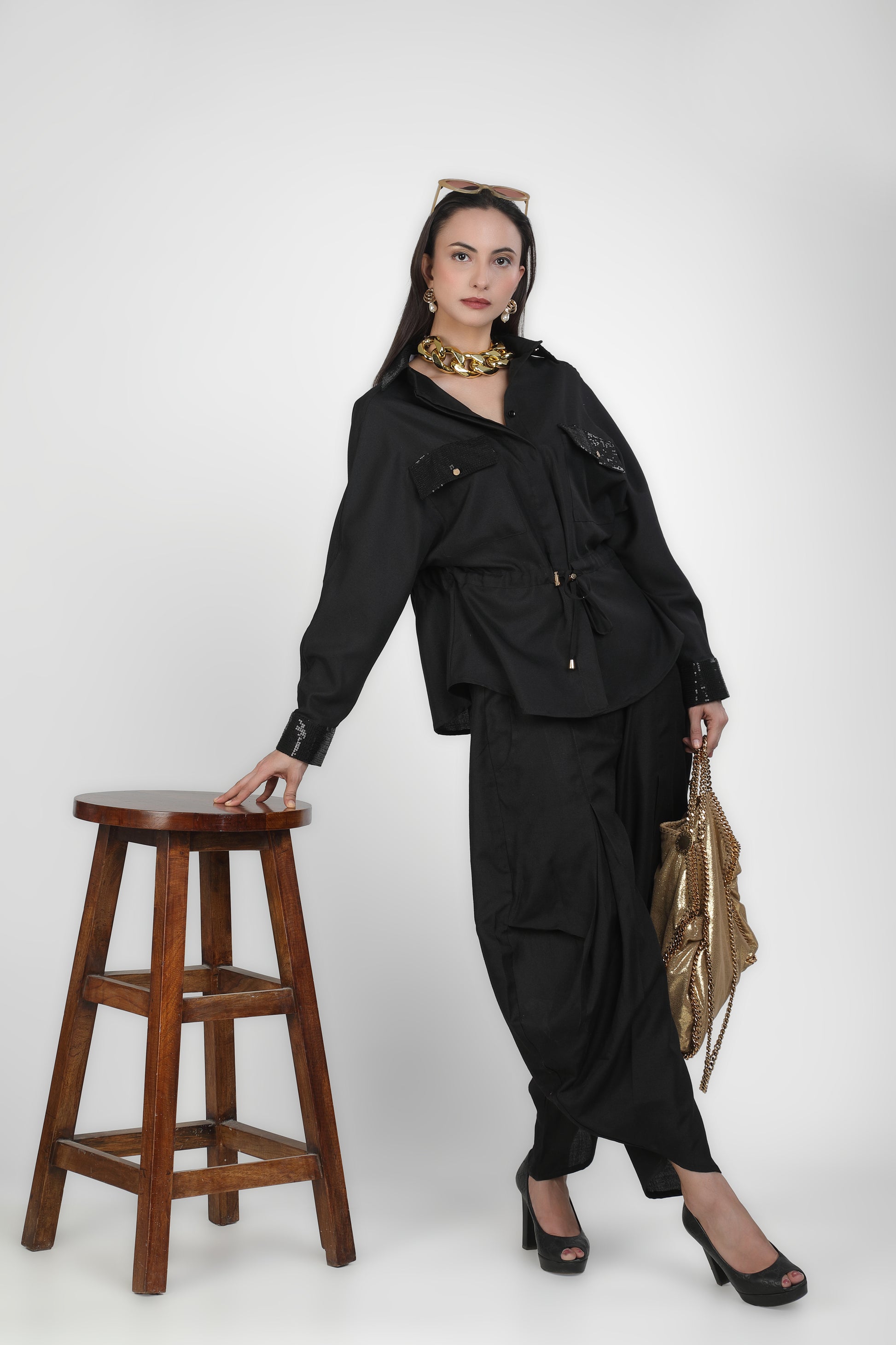 Featuring a black tulip dhoti pant with a relaxed, flowy fit.