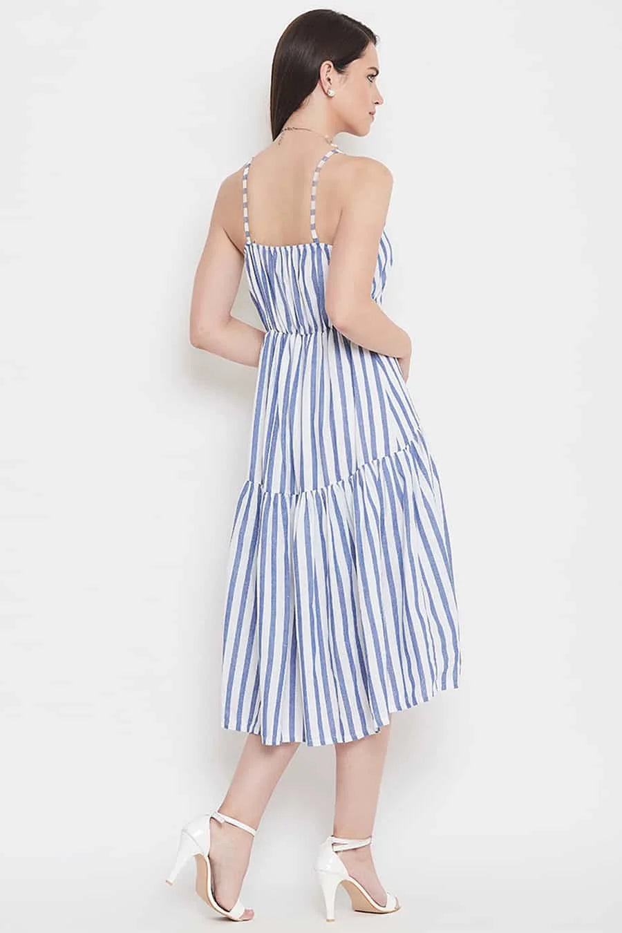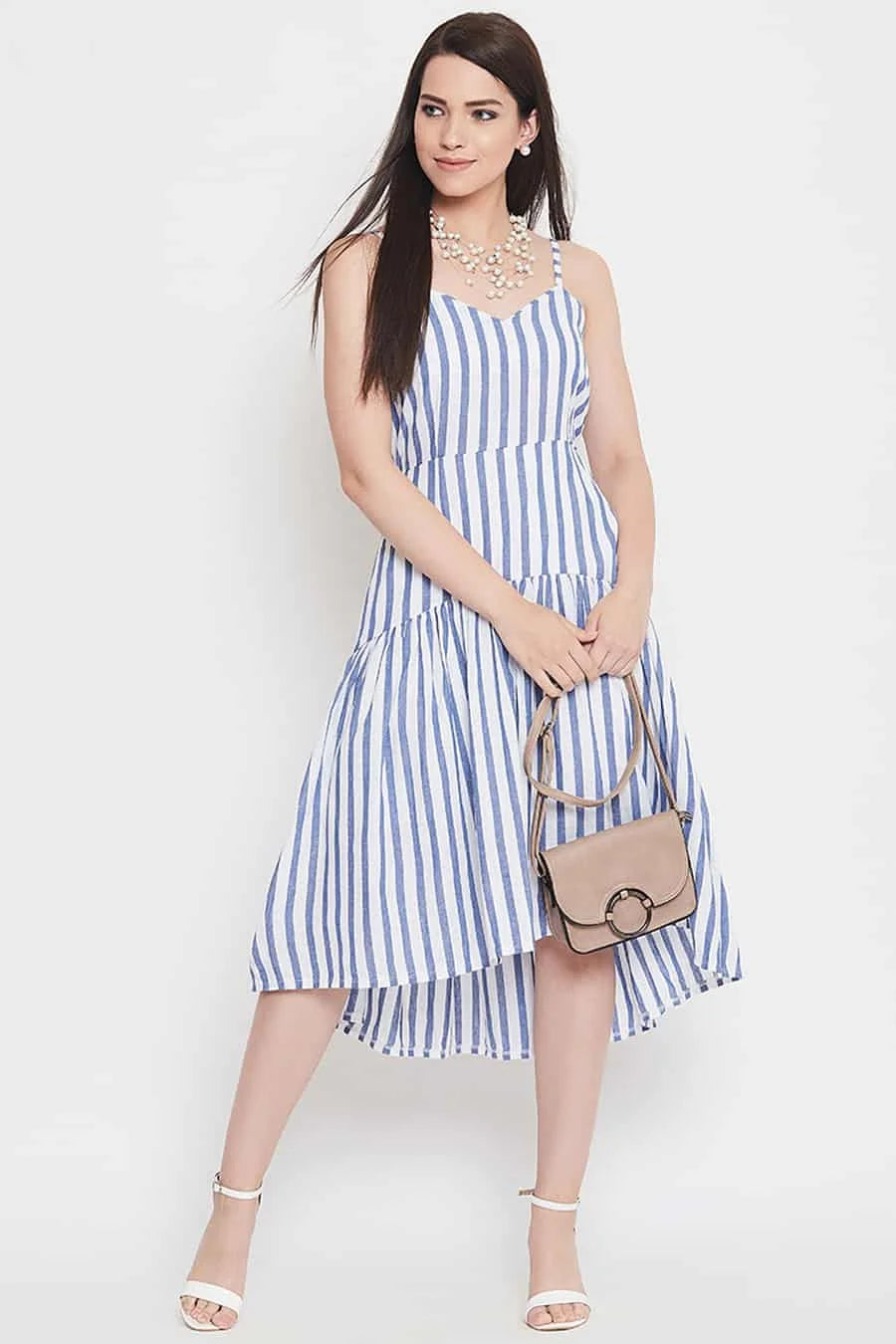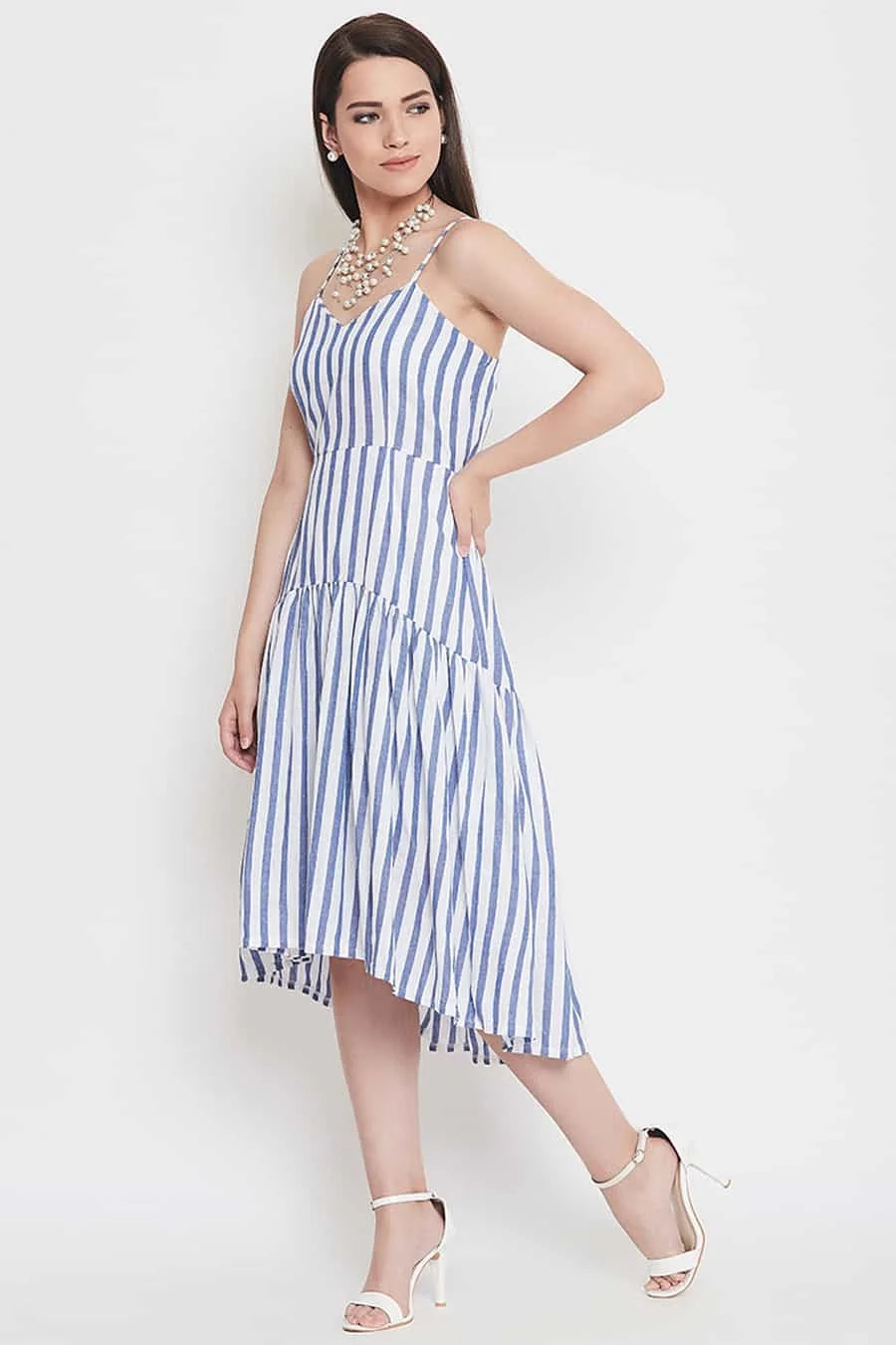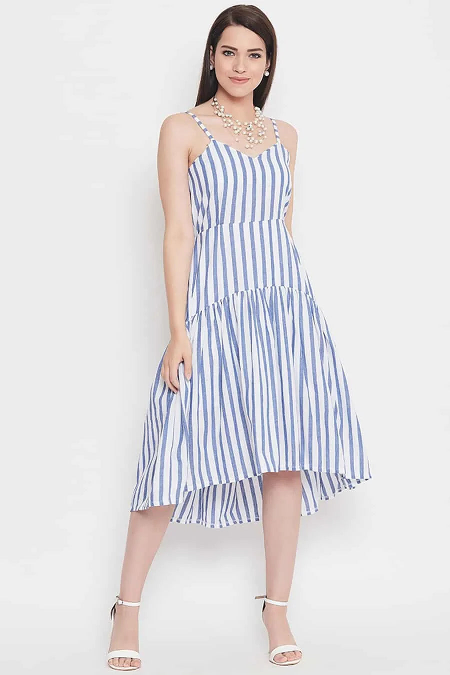 Blue and white striped high-low empire cotton dress, have shoulder straps, sleeveless, flared hem.