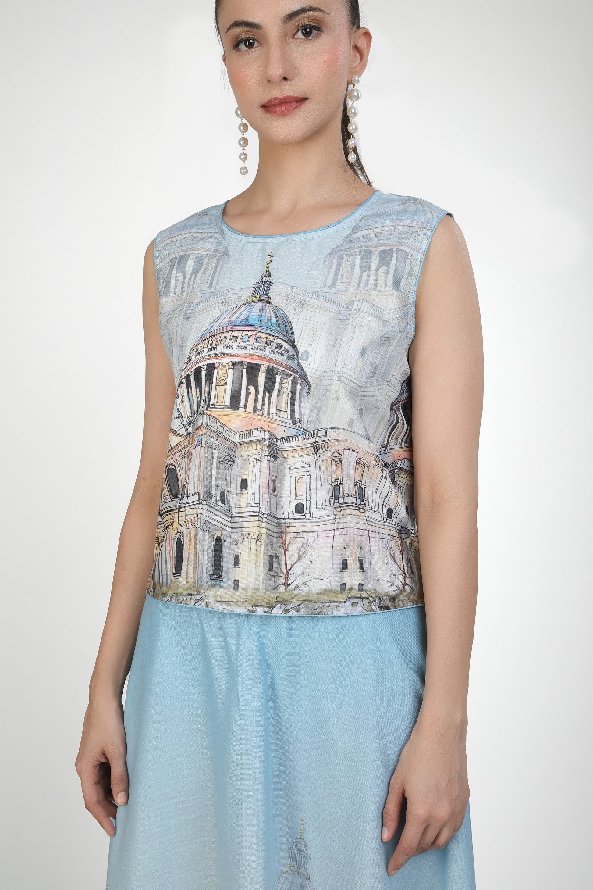 Featuring a pastel blue sleeveless top with architectural print of duomo cathedral.