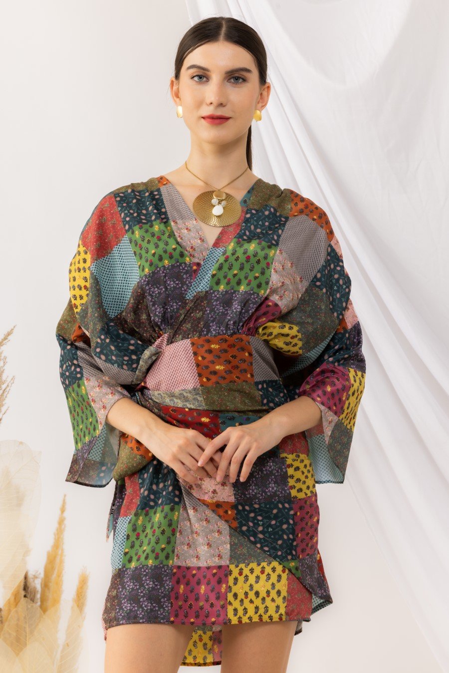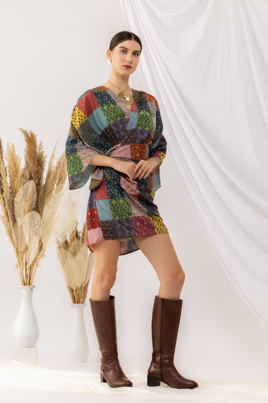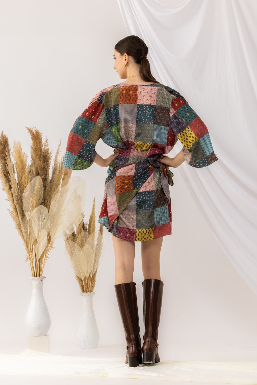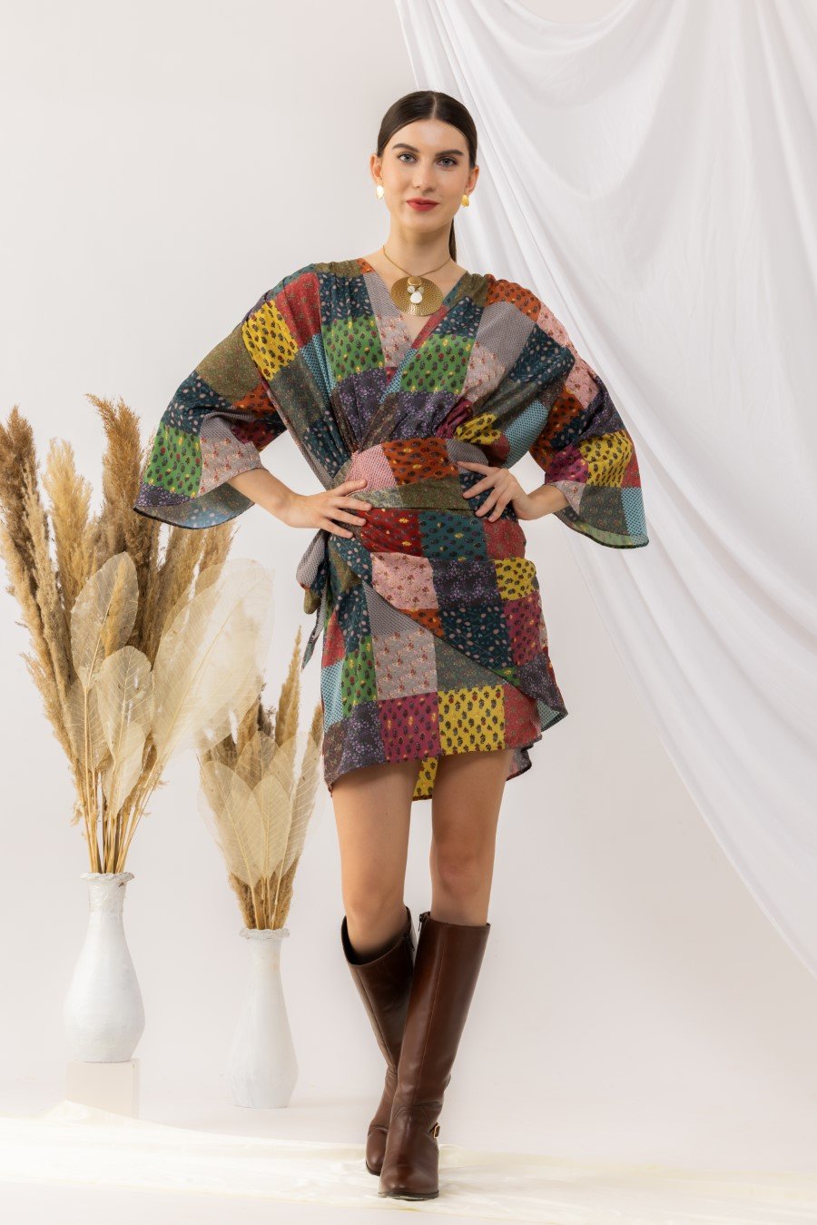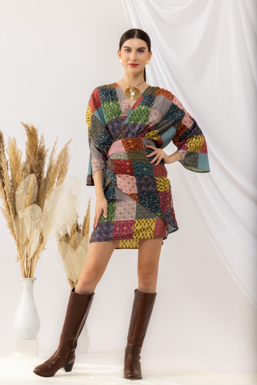 Bohemian digital printed wrap dress in american crepe. Wrap it comfortably around the waist . It has a surplice neckline and 3/4 flared sleeves. Size Available From XS To 3XL. Style Tip : Day to night smart dress that can be paired with your boots or high heels with a minimilistic jewellery to give that elegant look. Care Instructions :