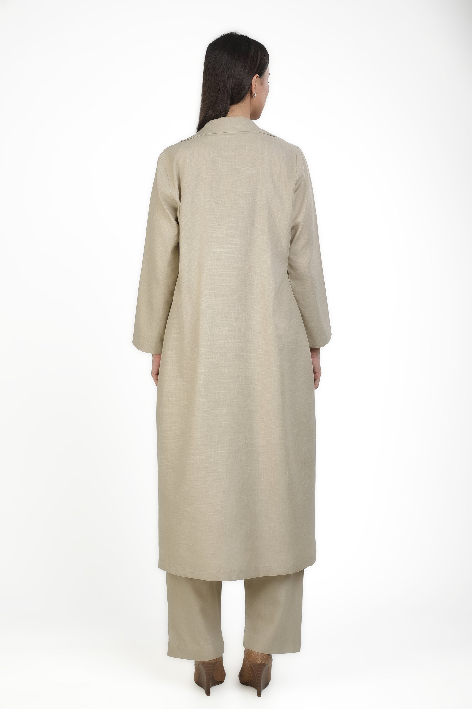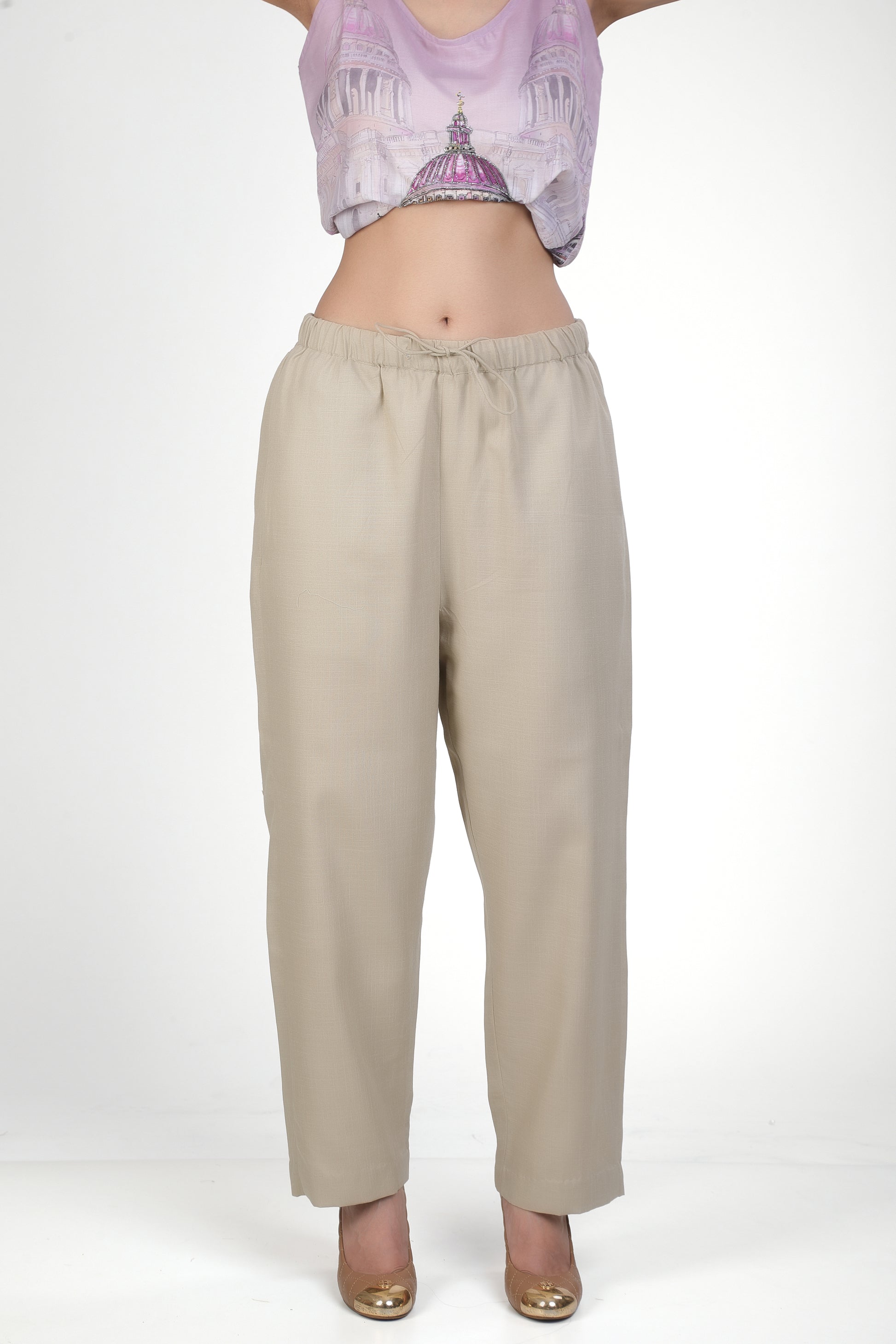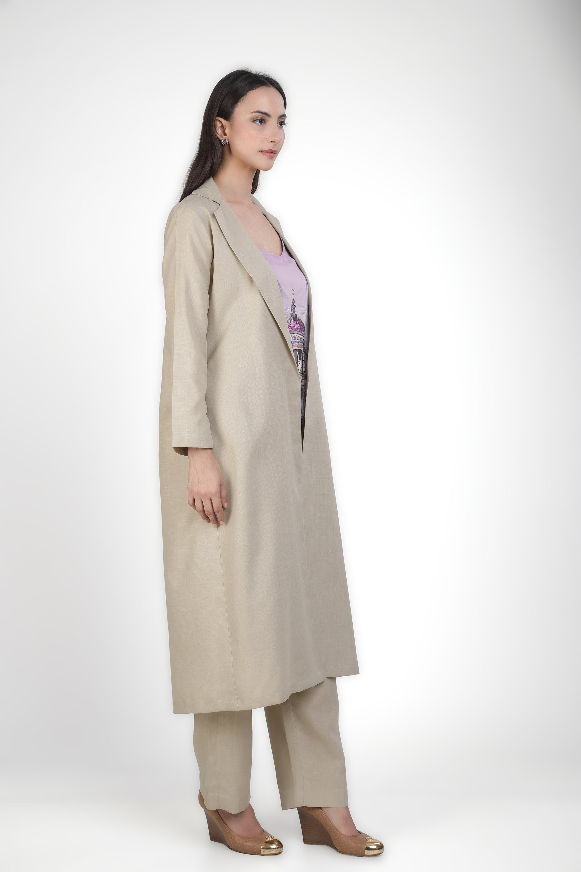 Featuring an overlay front open jacket that comes with pants and it is based in soft linen fabric. Showcased with spaghetti top with city scape print in soft linen base.