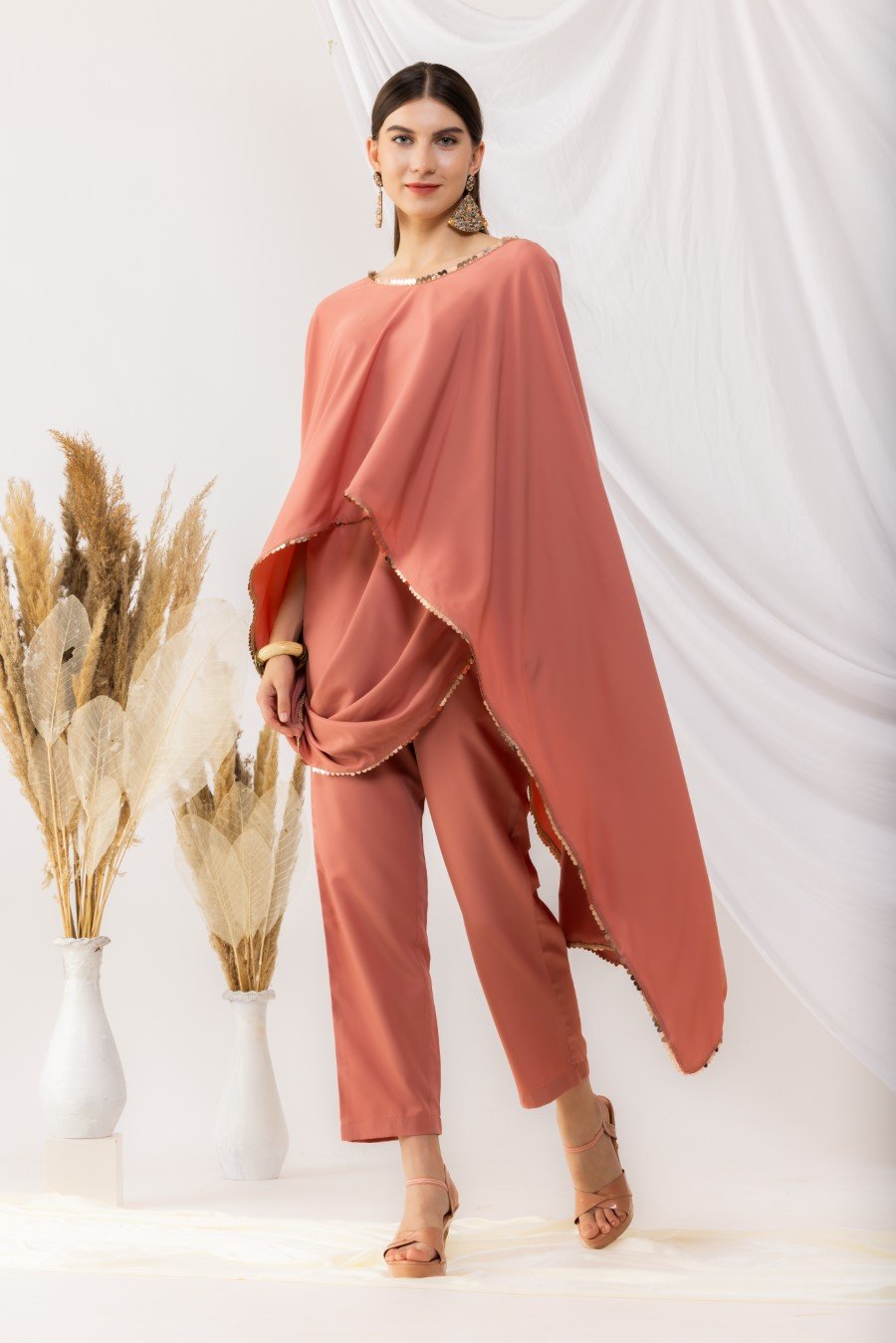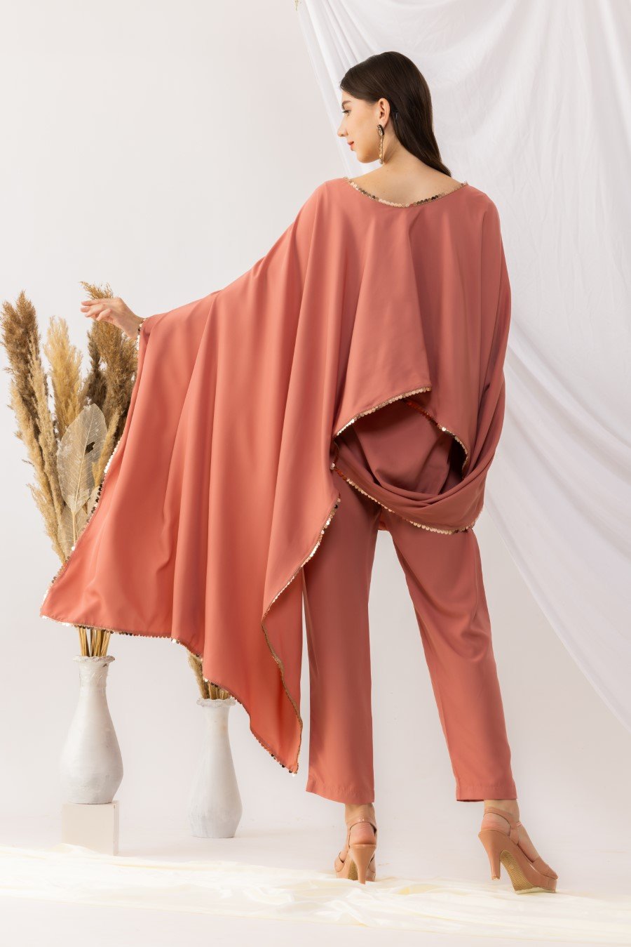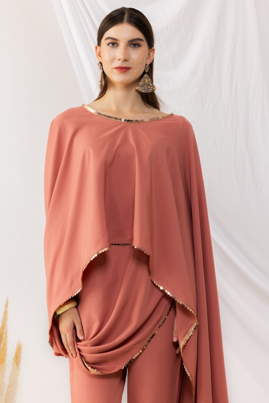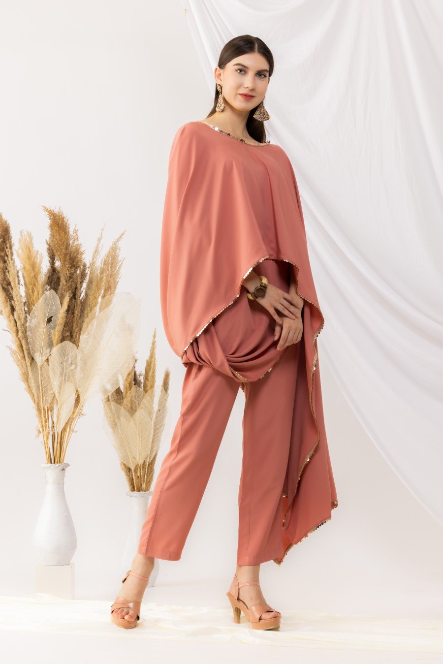 Coral rose cape bohemian style drape top with attached inner. It is pair up with ankle length pant with side pockets,side zip and fixed waist band. Highlighted sequin work. it is made up of american crepe. Size Available From XS To 3XL. Style Tip : Flaunt this look with a minilistic make-up and paired with statement jewellery. Can be paired with high heels and your favourite clutch. Care Instructions :