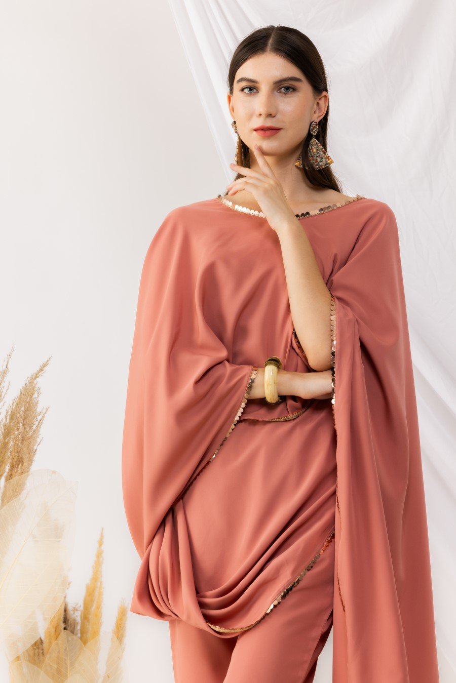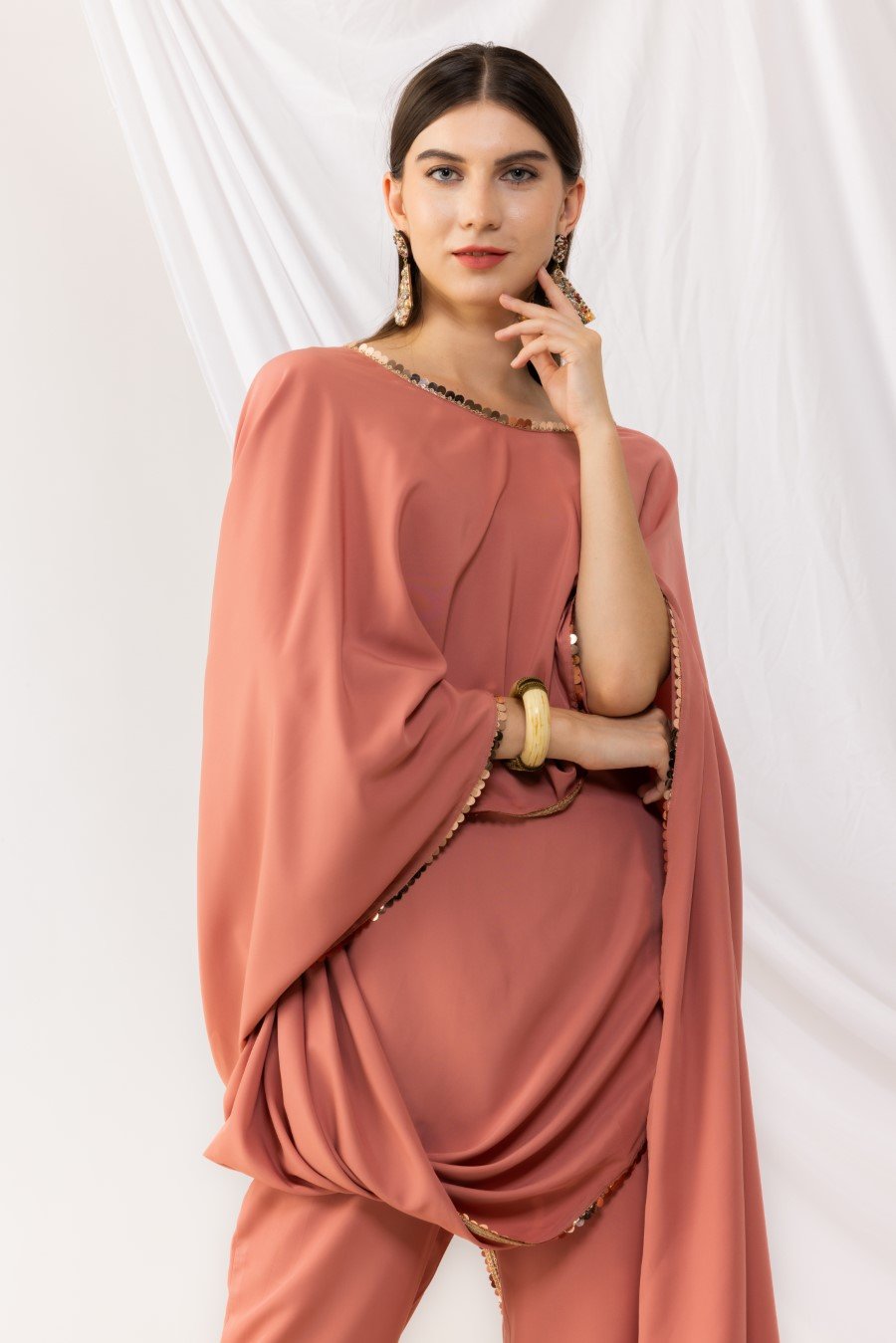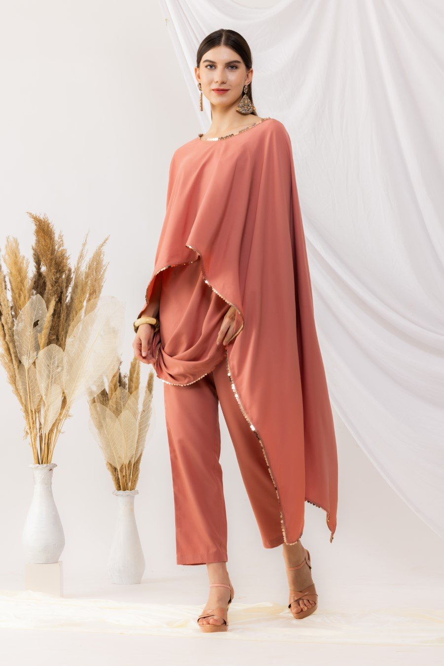 Coral rose cape bohemian style drape top with attached inner. It is pair up with ankle length pant with side pockets,side zip and fixed waist band. Highlighted sequin work. it is made up of american crepe. Size Available From XS To 3XL. Style Tip : Flaunt this look with a minilistic make-up and paired with statement jewellery. Can be paired with high heels and your favourite clutch. Care Instructions :