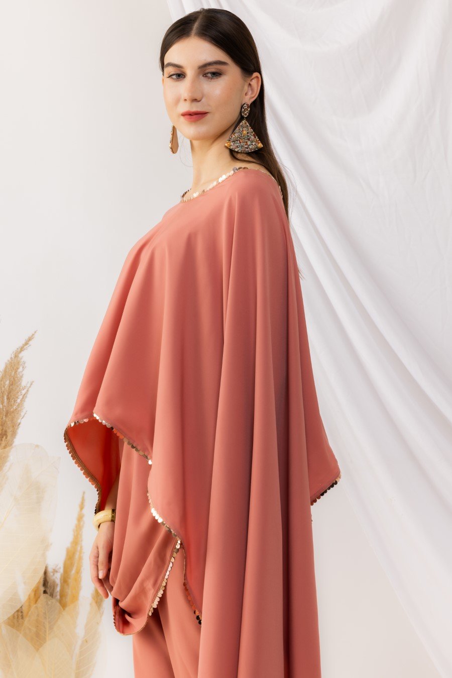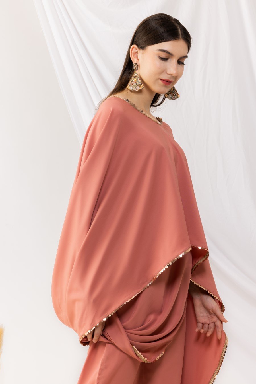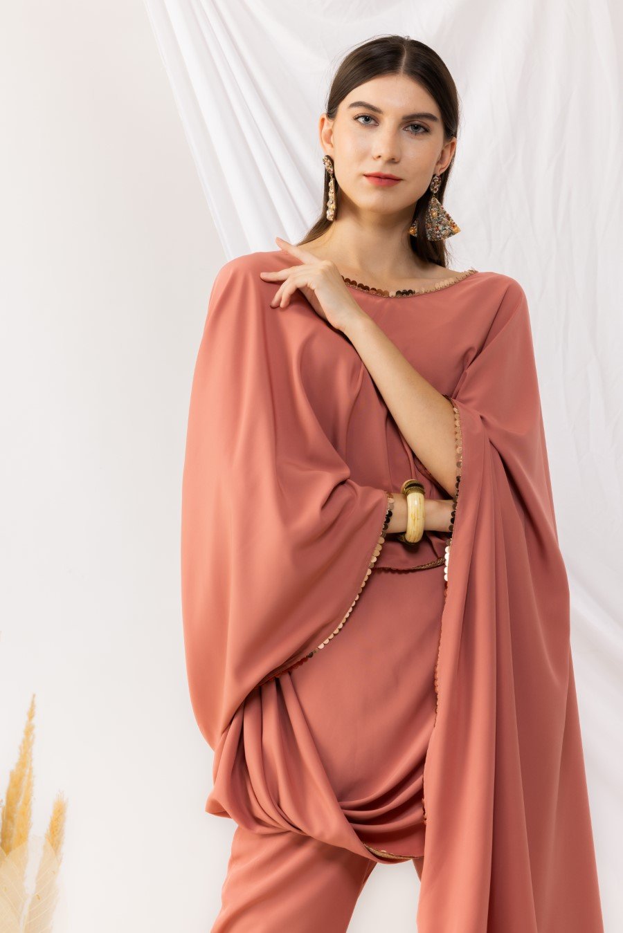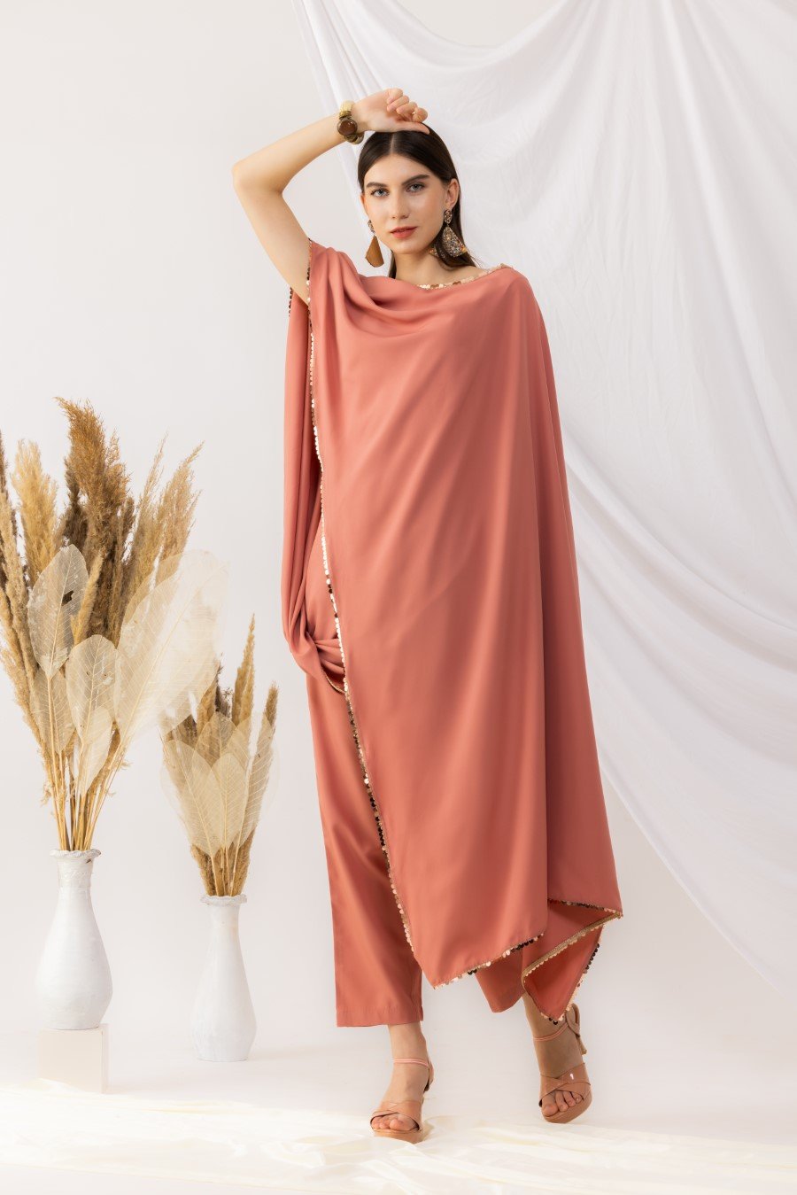 Coral rose cape bohemian style drape top with attached inner. It is pair up with ankle length pant with side pockets,side zip and fixed waist band. Highlighted sequin work. it is made up of american crepe. Size Available From XS To 3XL. Style Tip : Flaunt this look with a minilistic make-up and paired with statement jewellery. Can be paired with high heels and your favourite clutch. Care Instructions :