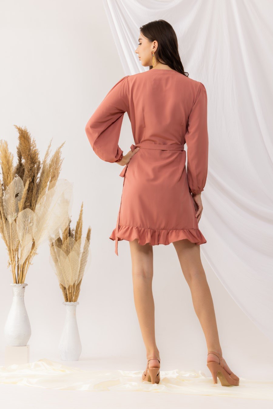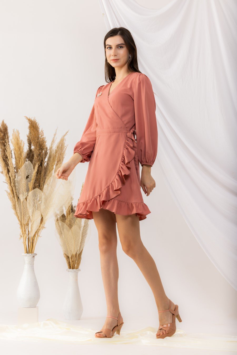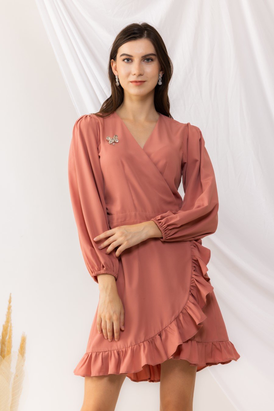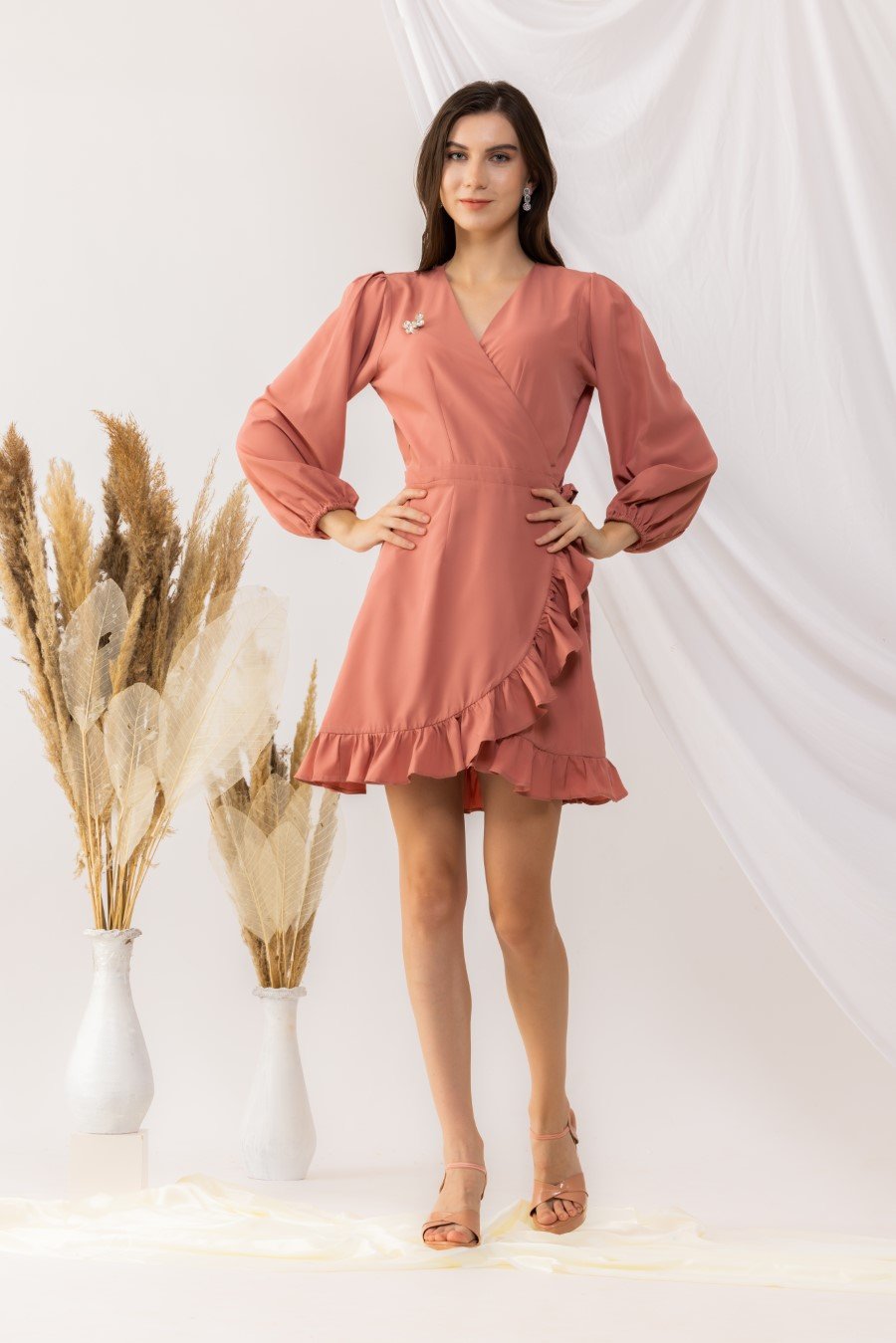 Featuring a wrap short dress in american crepe. The dress has surplice neckline with full sleeves and side gathers. The crystal butterfly brooch adds glamour to the dress. Size Available From XS To 3XL. Style Tip : This smart chick dress worn with a high heel or flats and statement jewellery to give a classic look. Care Instructions :