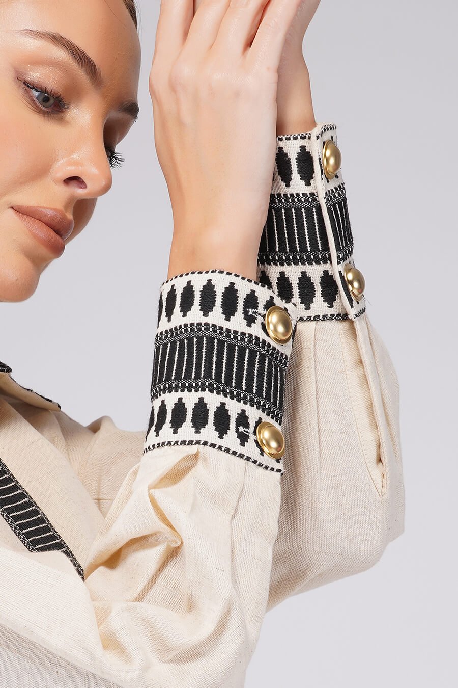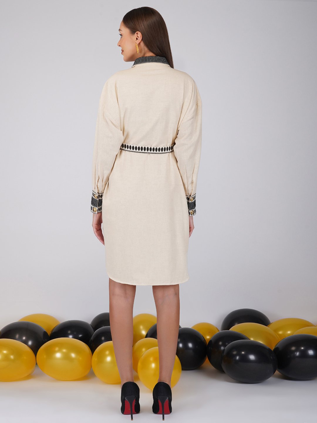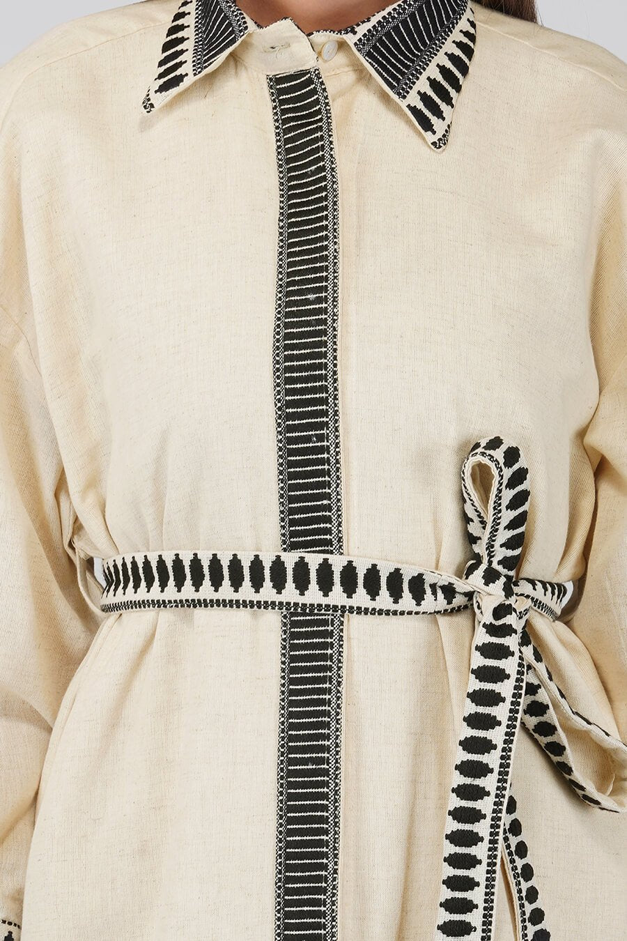 Organic cotton flax shirt style dress with loomed fabric detailing at the cuff, collar and belt. Care Instructions :