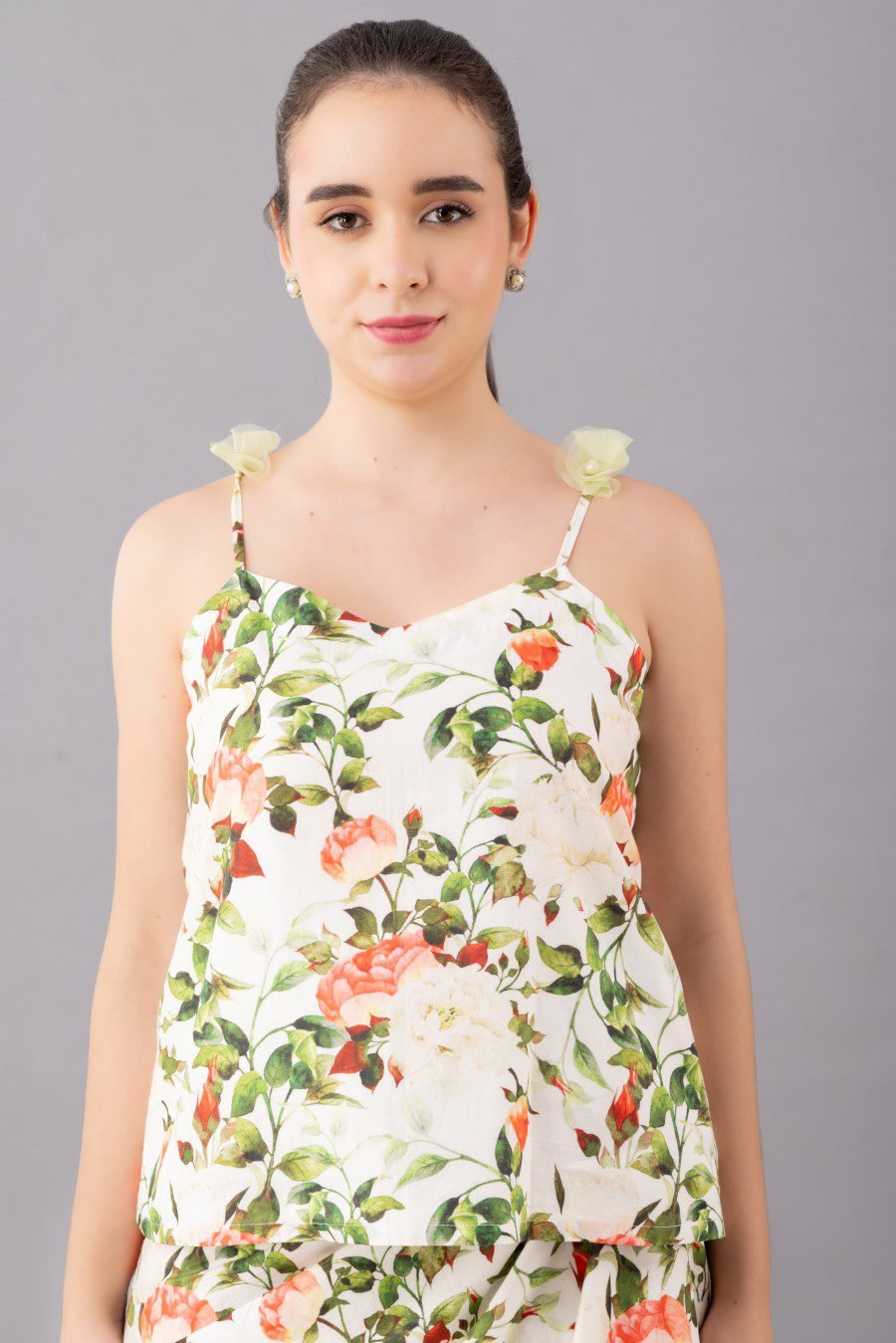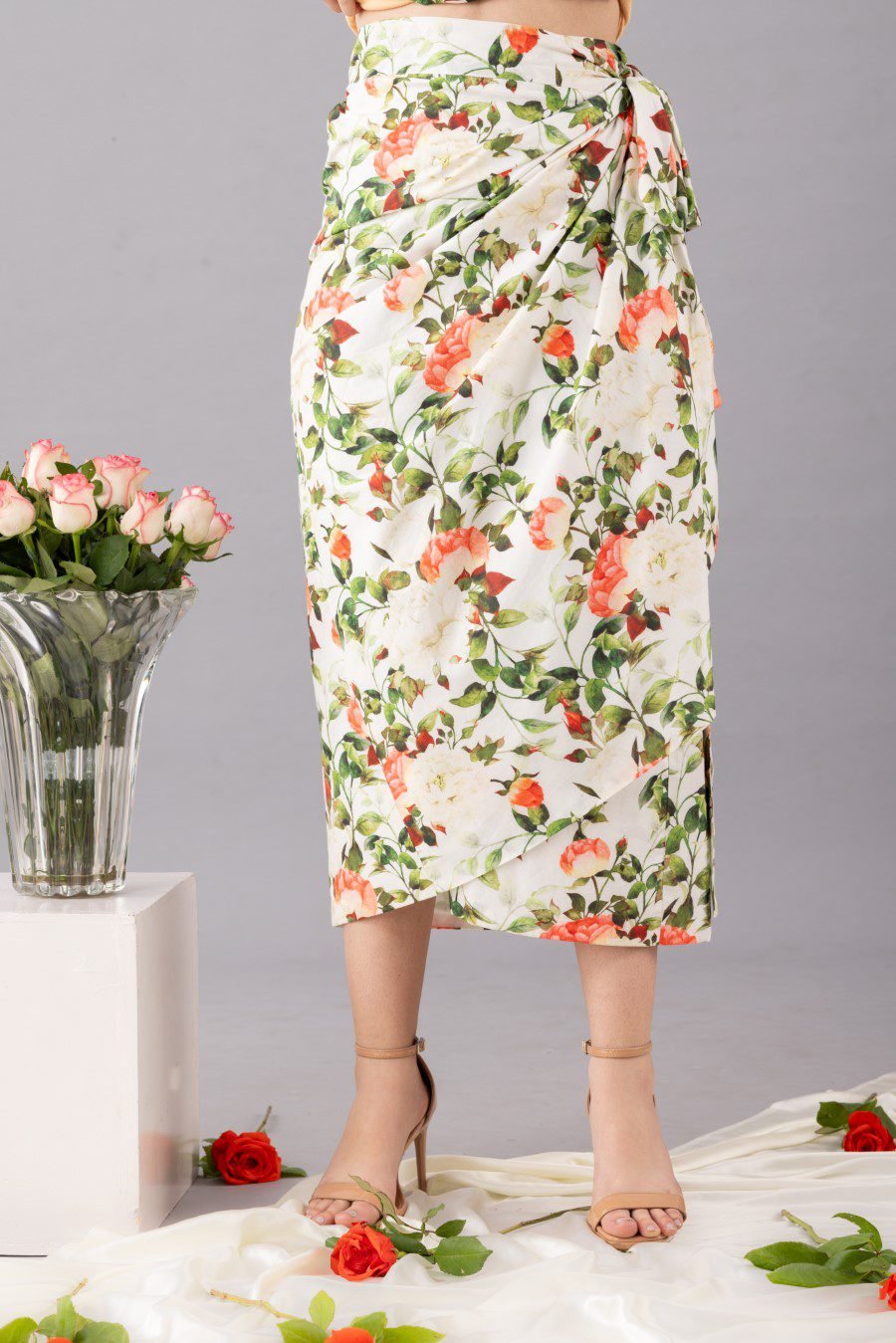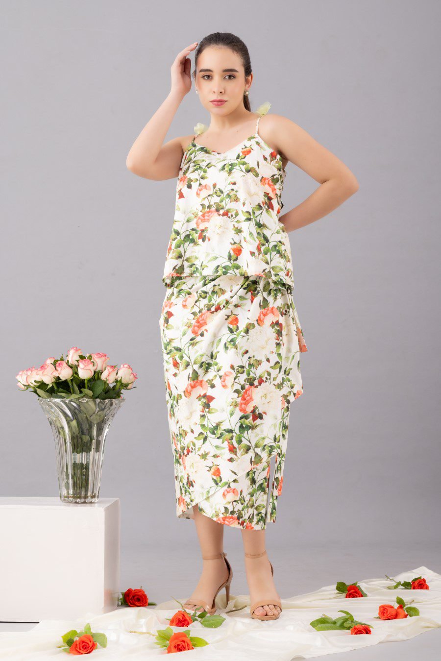 Our Cotton Floral Printed skirt Coord Set, a delightful ensemble designed to enchant with its vibrant floral and effortless style.The delicate spaghetti straps add a touch of femininity, while the highlight is the enhancement of the straps with green organza flowers.Paired with the Spaghetti Top is the Wrap Skirt, made from the same fine printed cotton fabric. Designed to flatter every body type, this free-size wrap skirt offers versatility and ease of wear. Its wrap-around style allows for a customizable fit, ensuring comfort and confidence with every step. Size Available From XS To 3XL. Style Tip : The floral print of the skirt complements that of the top, creating a cohesive and eye-catching ensemble. Whether worn together for a coordinated look or styled separately to suit your mood, this Cotton Floral Printed Coord Set is perfect for both casual outings and special occasions. Care Instructions :