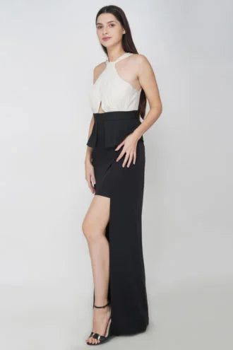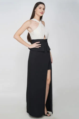 Black and White dress, has a crossover halter neckline, has a high slit with flap detailing on the waist.