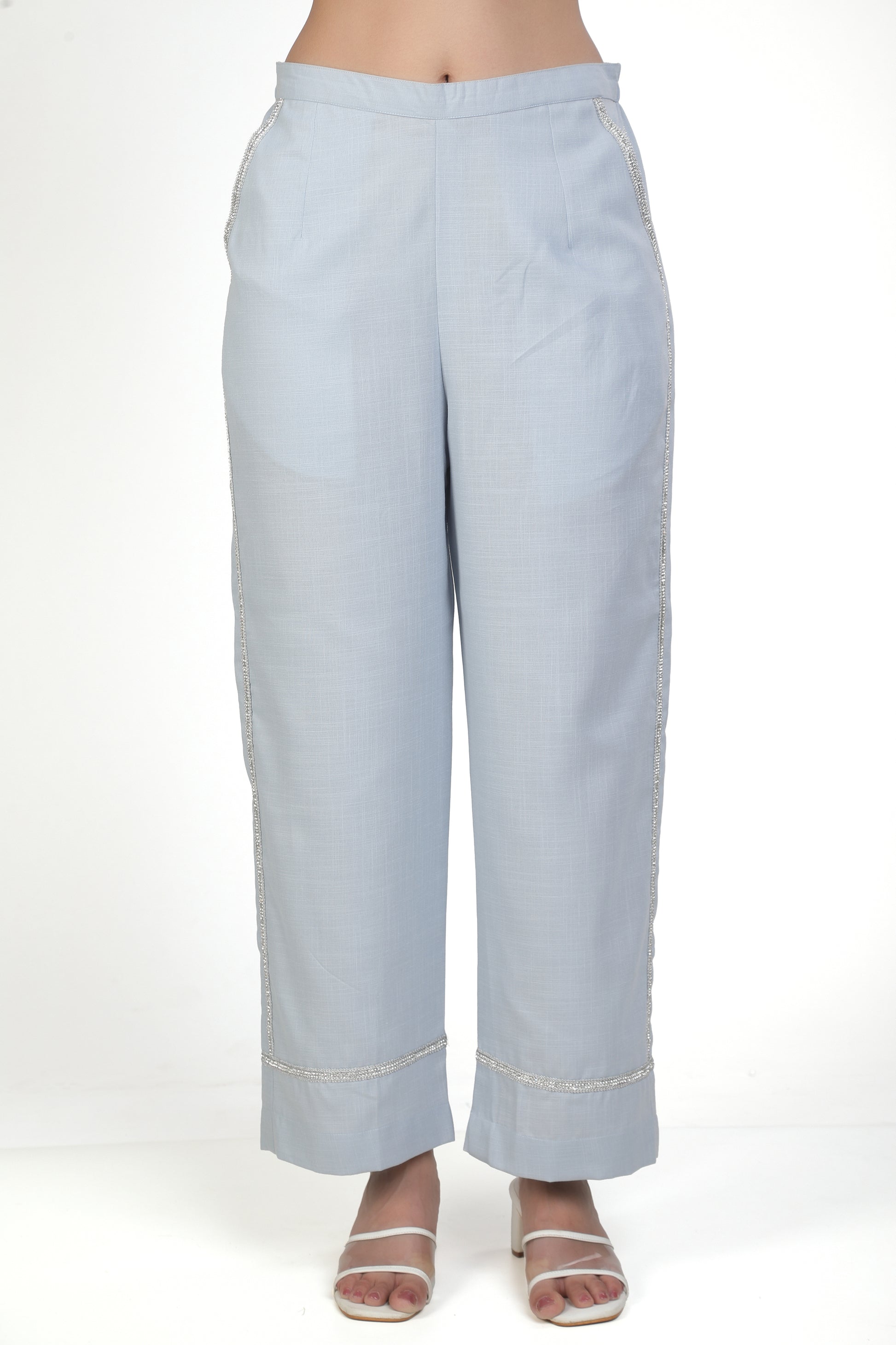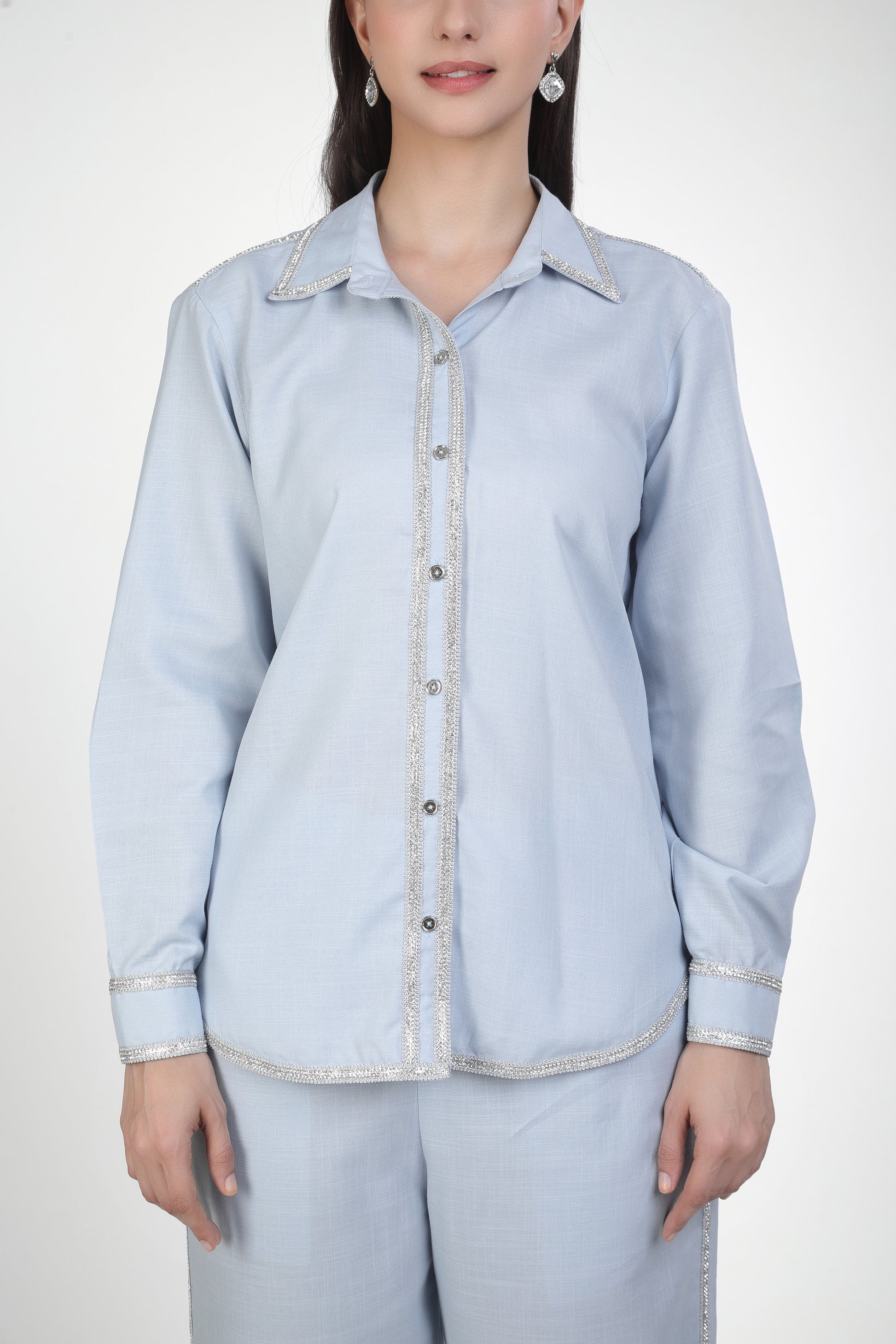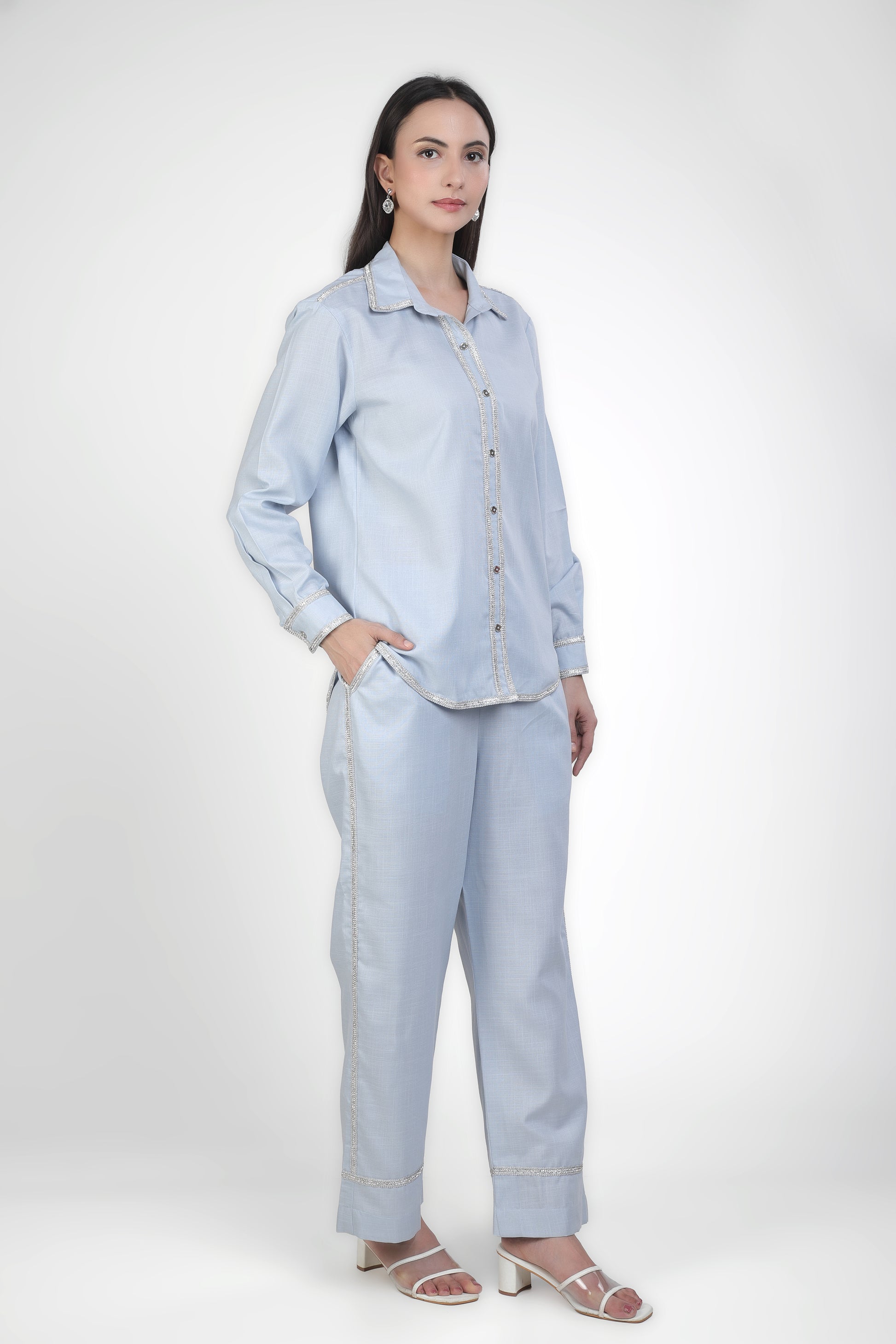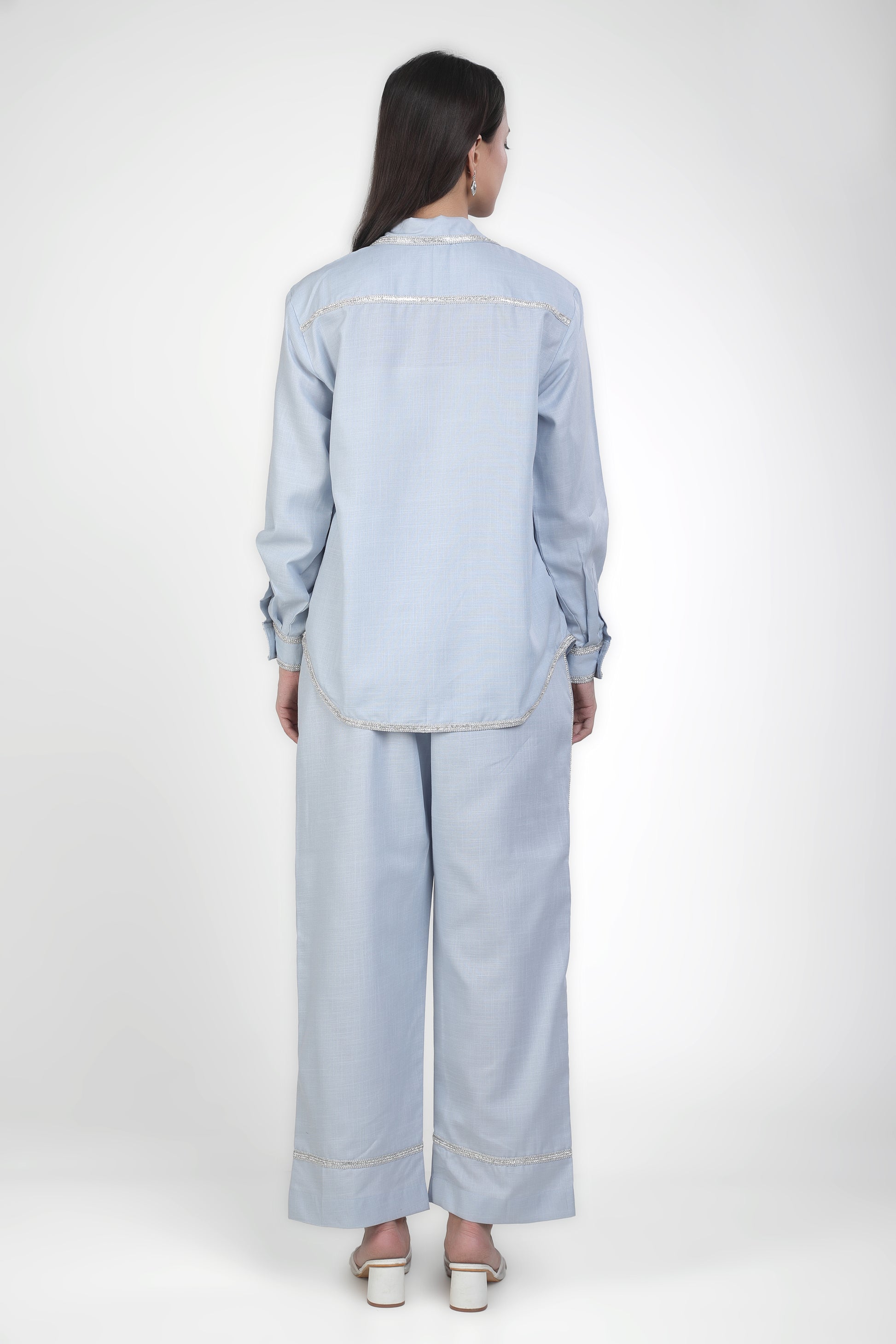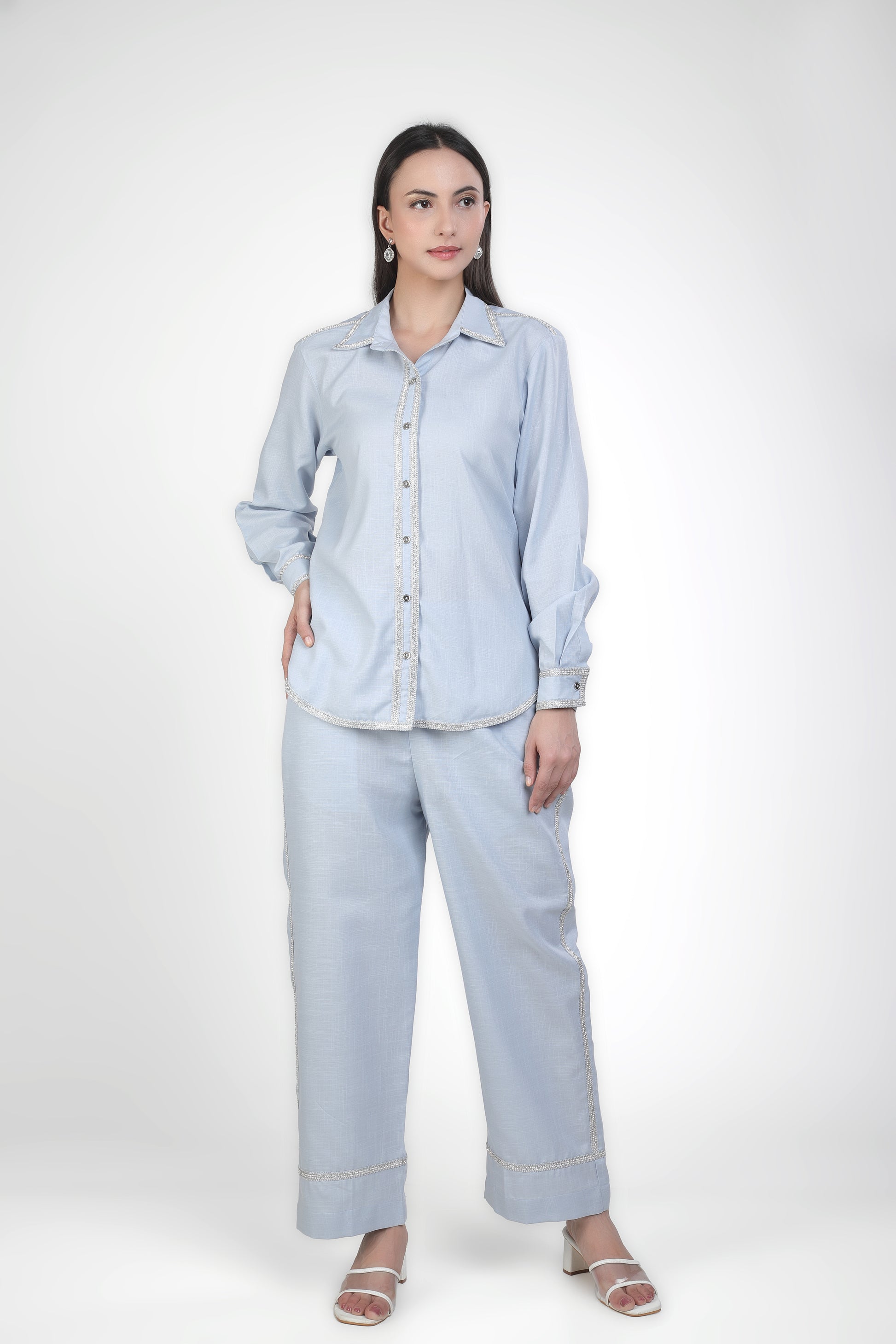 Featuring blue front button shirt and it is paired with trousers based in soft linen blend with subtle embellishments on the cuffs and hems.