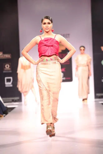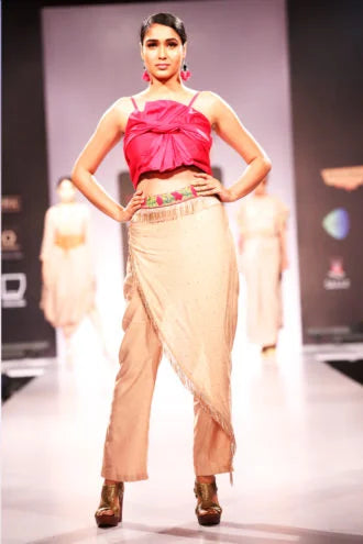 This Crop Top and Palazzo set consists of a fuchsia cotton silk crop top with a crisscross drape, paired up with beige asymmetrical flap over pants. The pant belt is embellished with a French knot hand-embroidered technique by using anchor thread and highlighted with Japanese beads.