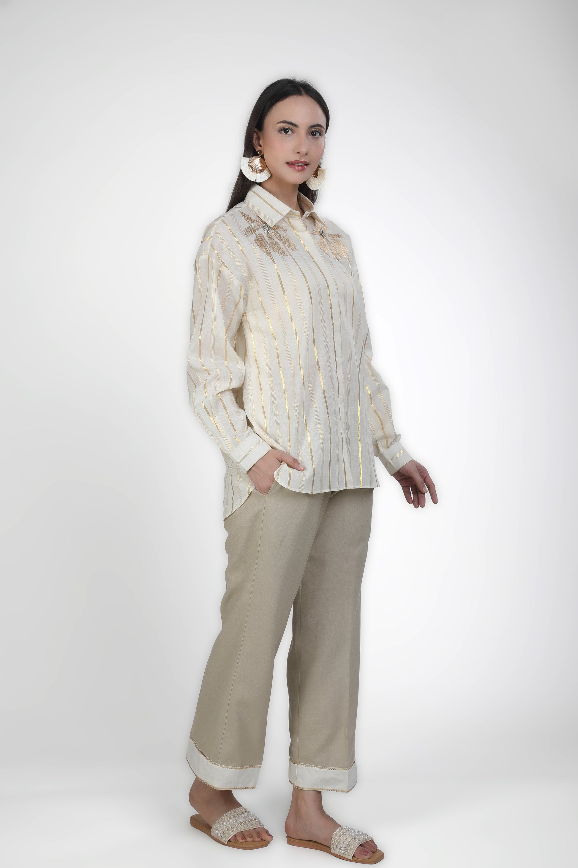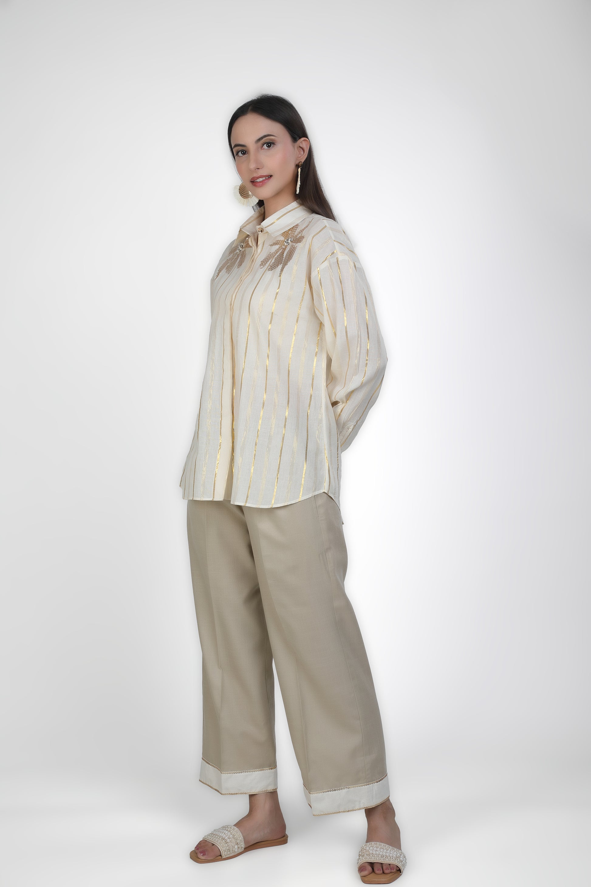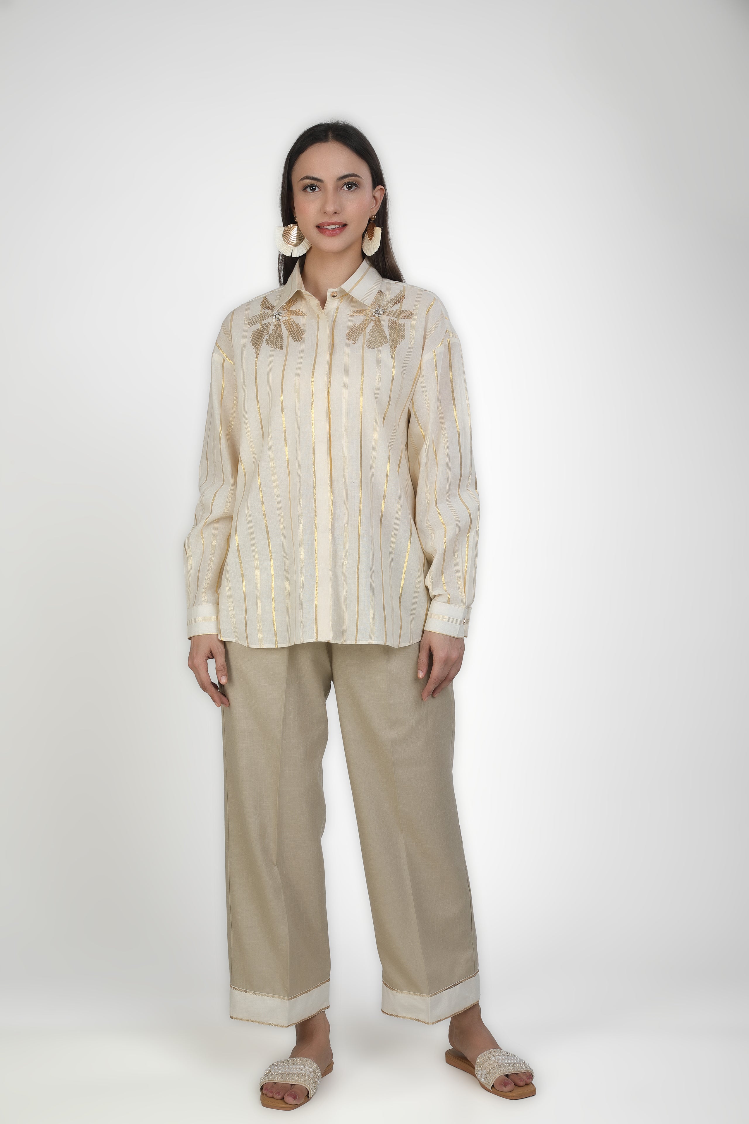Featuring ivory shirt and it is paired with Mouse trousers based in soft linen blend. Adored with embroidery work.