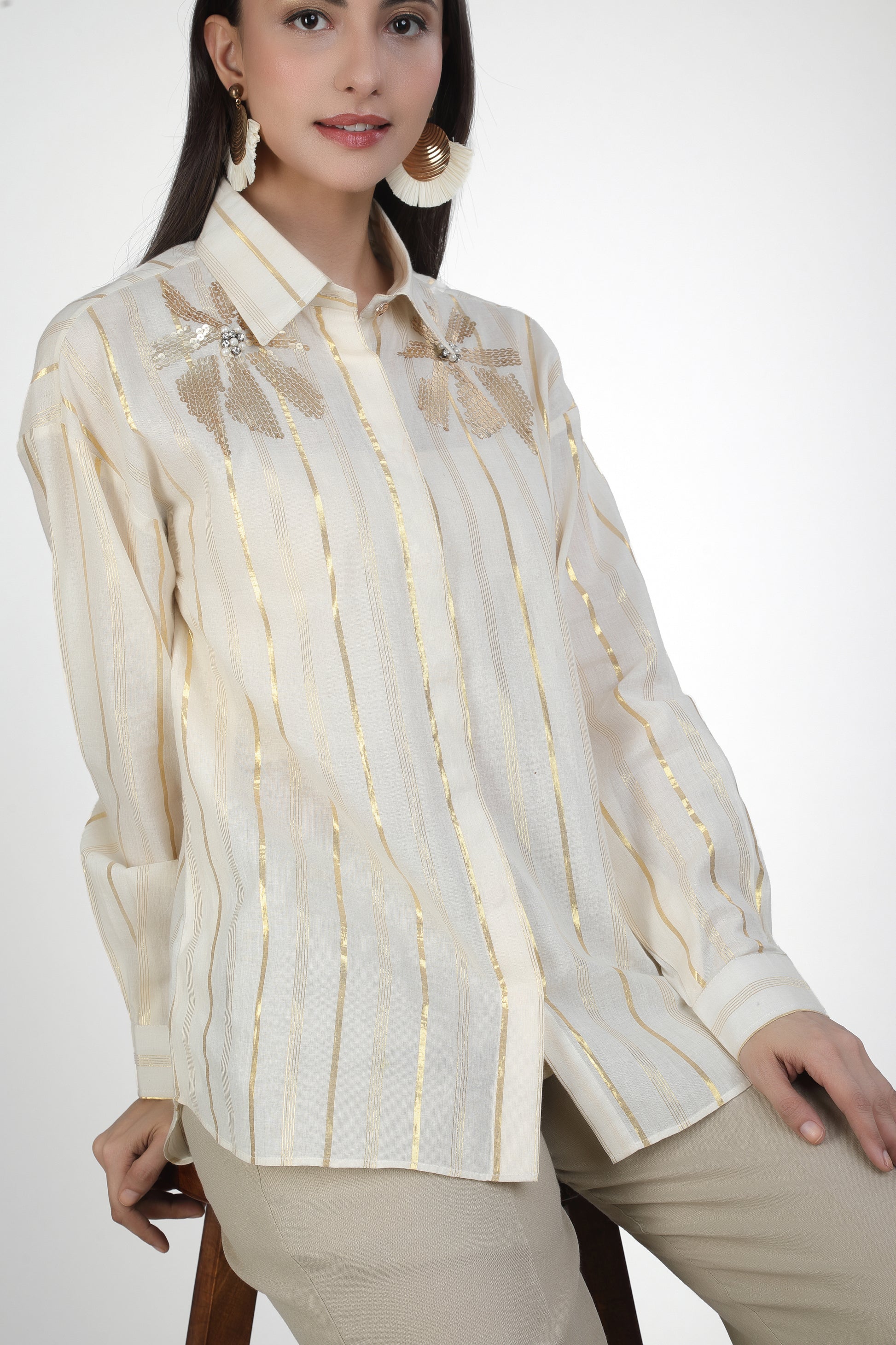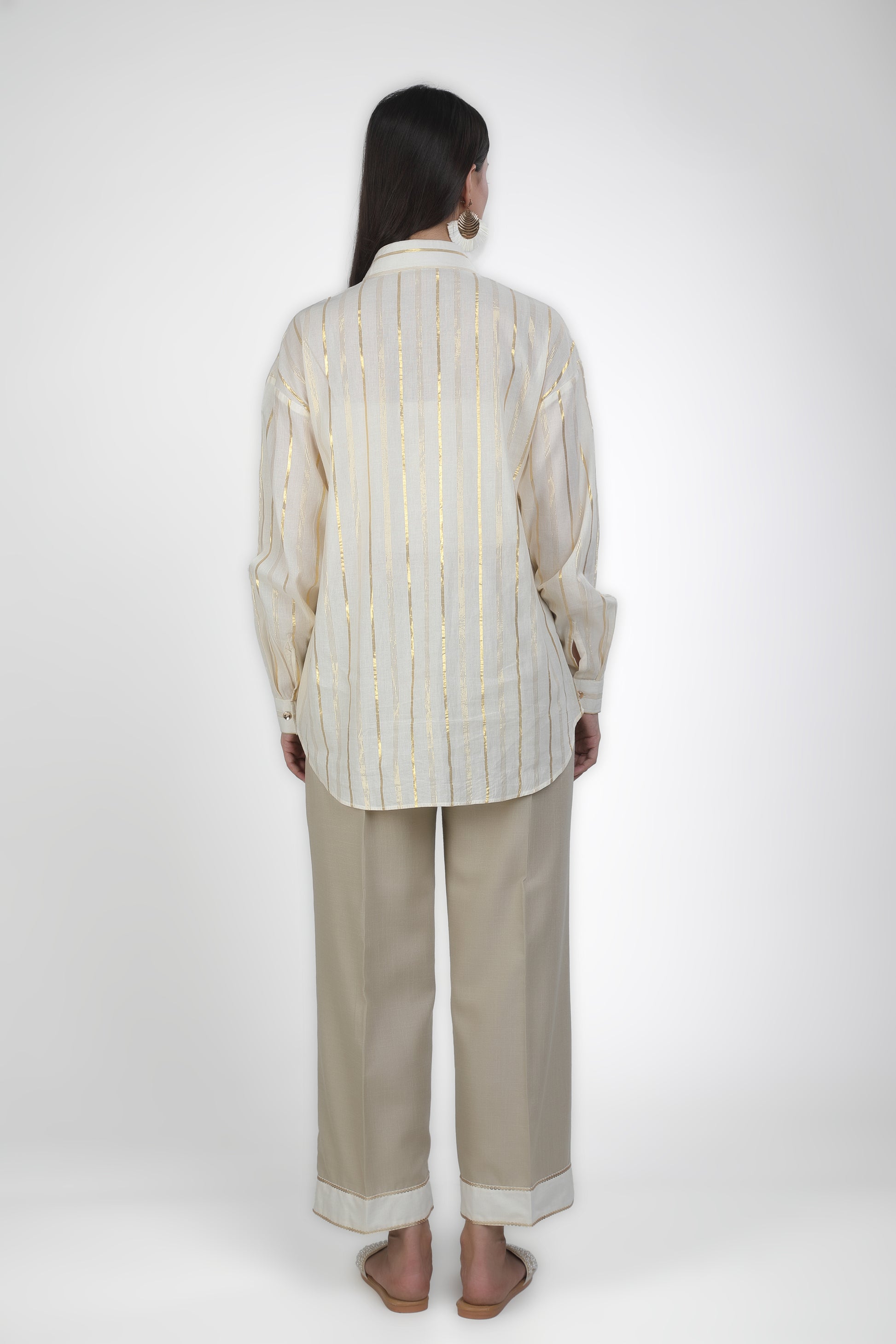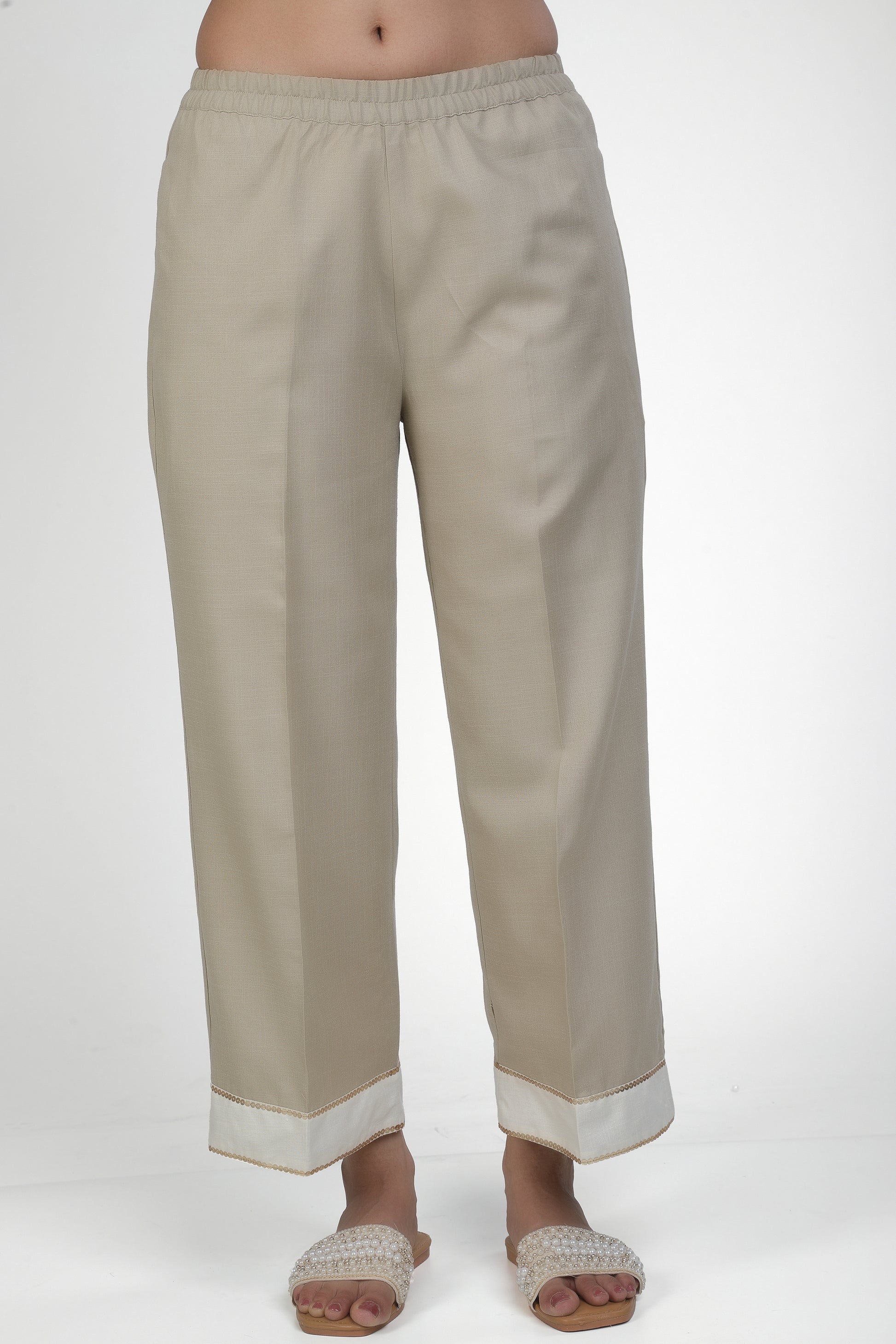 Featuring ivory shirt and it is paired with Mouse trousers based in soft linen blend. Adored with embroidery work.