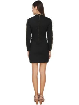 A Full Sleeve black bodycon dress with full sleeves and full collar with back zip opening.The dress is made in cotton lycra for utmost comfort with style statement. The golden metal beads are studded on the dress to create a gracious look for your outfit.