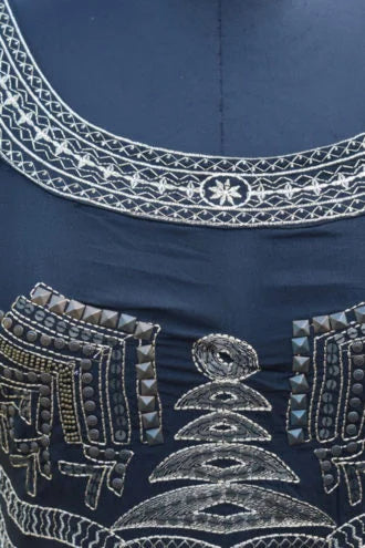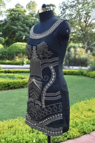 High Class forever favourite Black color Halter neck Dress with beautiful crafted with gold thread embroidery tucked with studs and sequence making it more classy. Knee length, fitted silhoutte in crepe fabric will be very comfortable to wear this fancy dress. STYLE TIP:- Wear it with golden danglers and perfect color of footwear matching the over all look which will enhance your presence in Party.