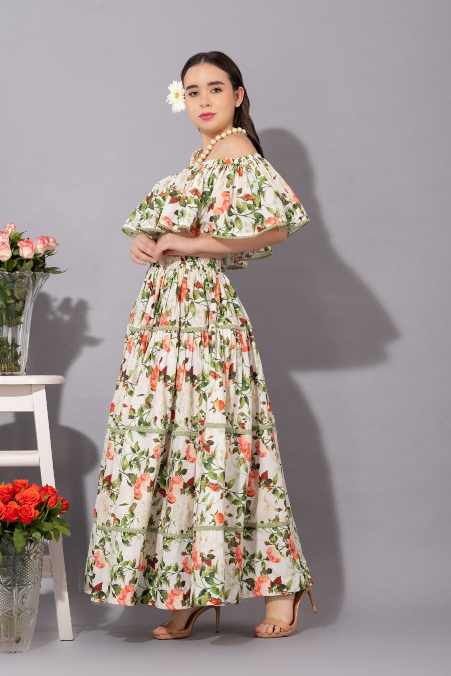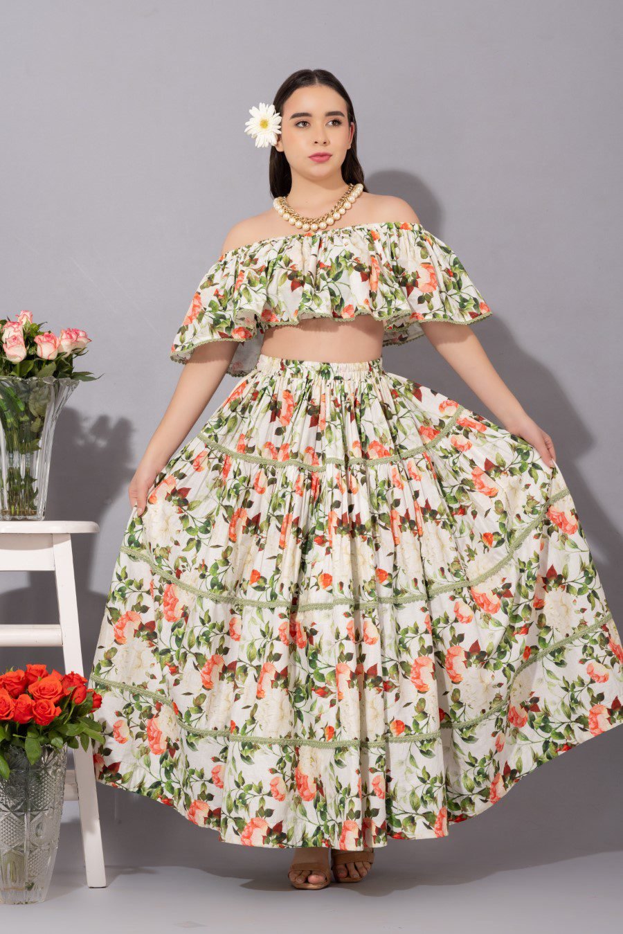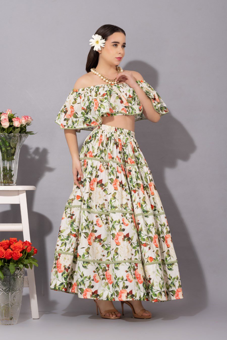 Featuring the epitome of elegance and style: the Off-Shoulder Frill Crop Top paired with our Tired Skirt, crafted meticulously from finely printed cotton fabric. The detailing of this skirt is complemented by beautiful green cotton lace. The tiered skirt construction adds movement and flair, while the elasticized waistband ensures a customized fit that flatters your figure. Size Available From XS To 3XL. Style Tip : Whether you're strolling through city streets, lounging by the beach, or attending a glamorous soirée, this ensemble is your passport to effortless sophistication. Pair it with your favorite accessories and heels for a night out, or opt for sandals and a sunhat for a chic daytime look. Care Instructions :