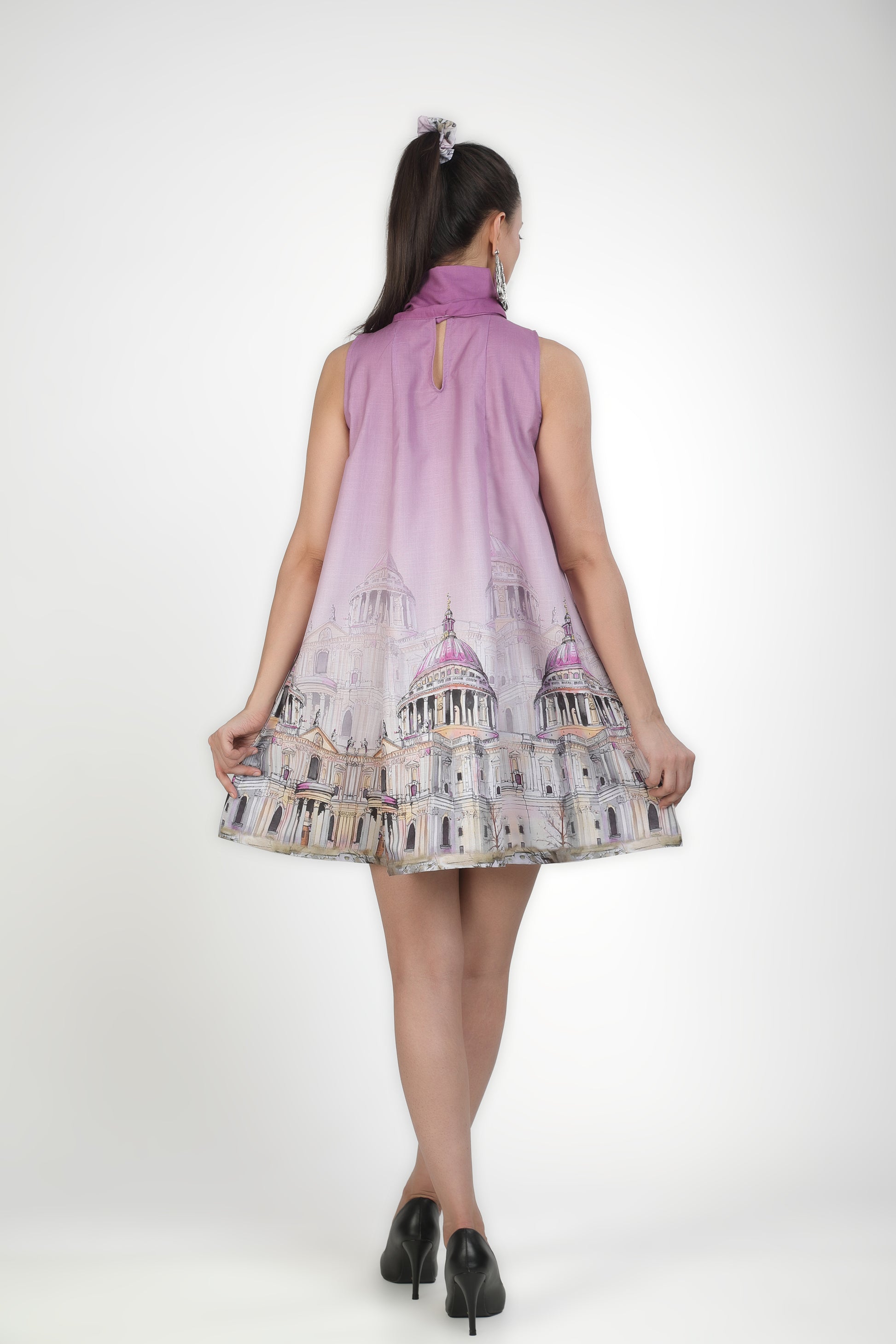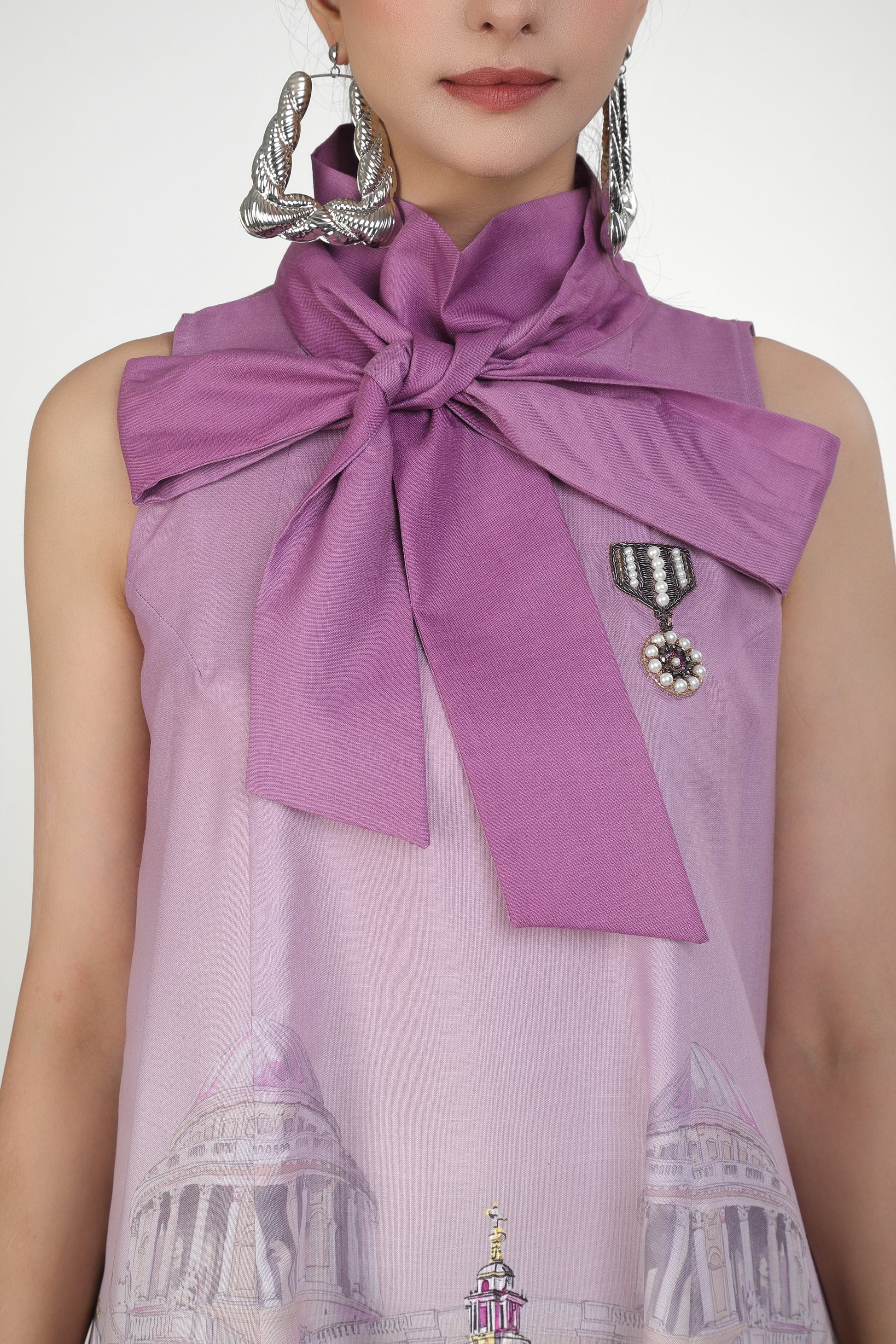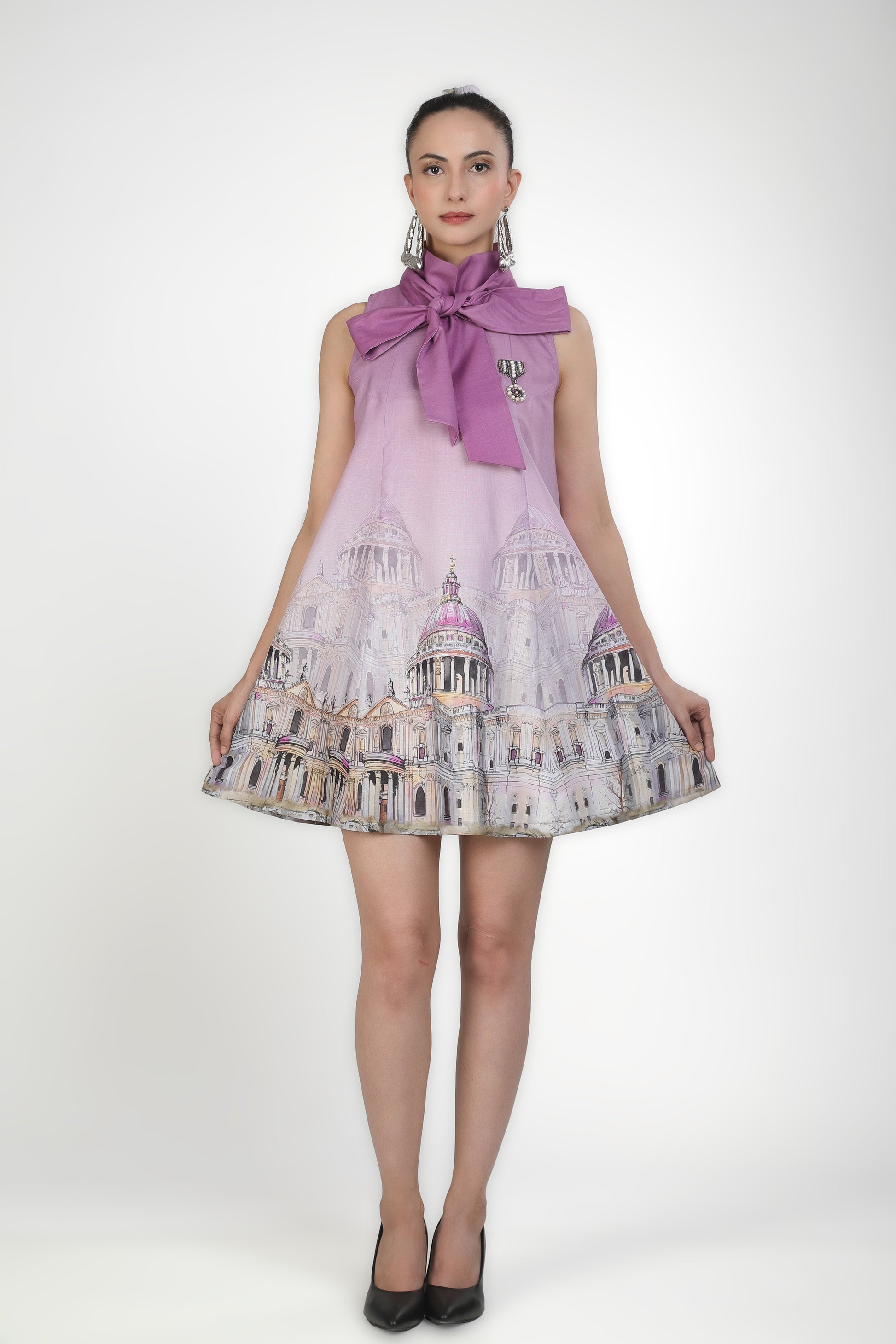 Featuring lilac bow style mini dress with architectural print in soft linen base.