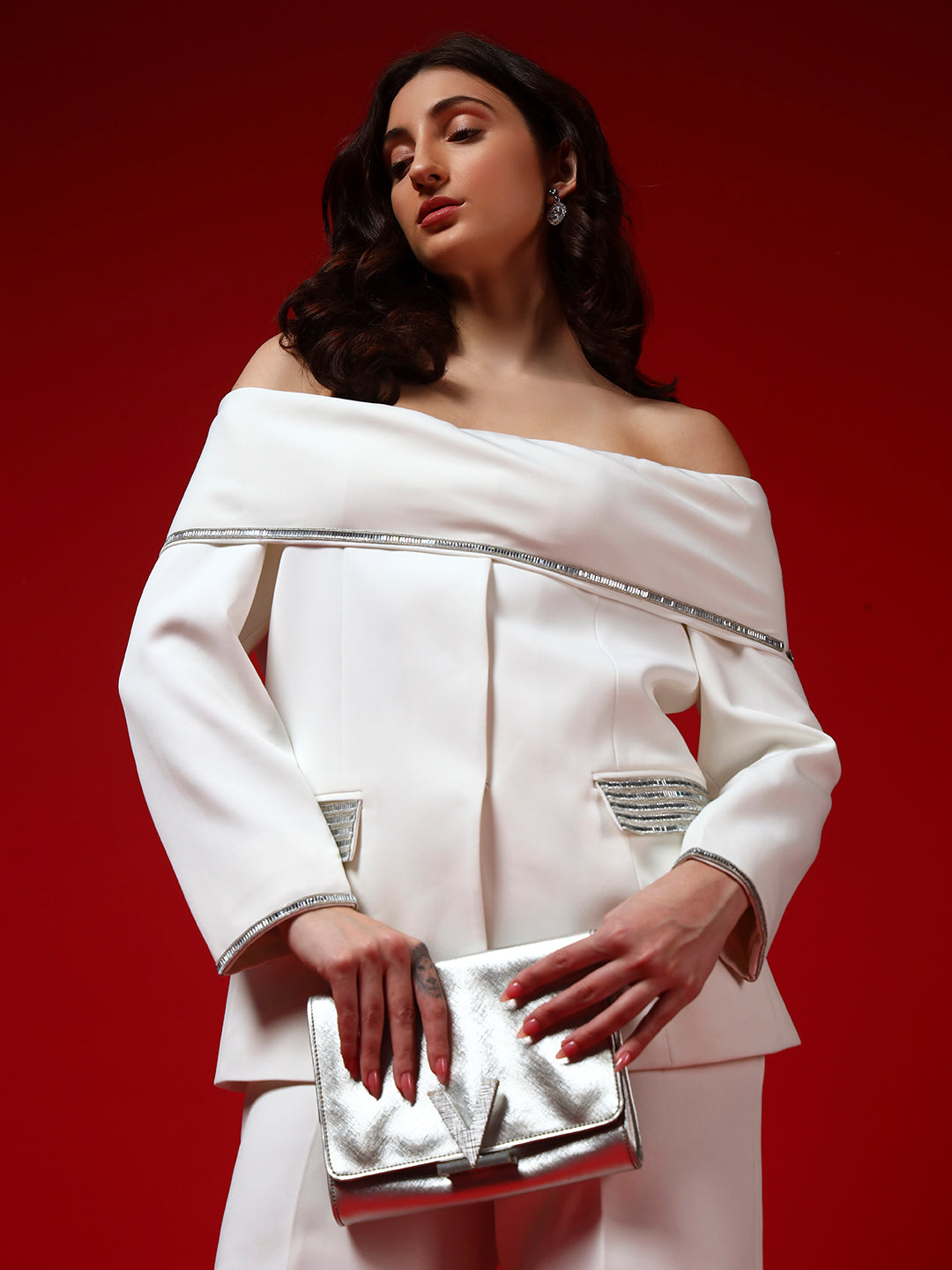 Ivory Off-Shoulder Banana Crepe Blazer Co-Ord Set with Silver Trim(Set of 2)