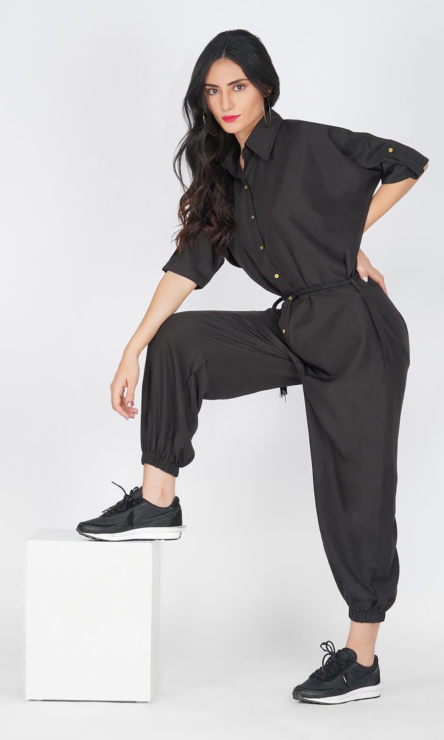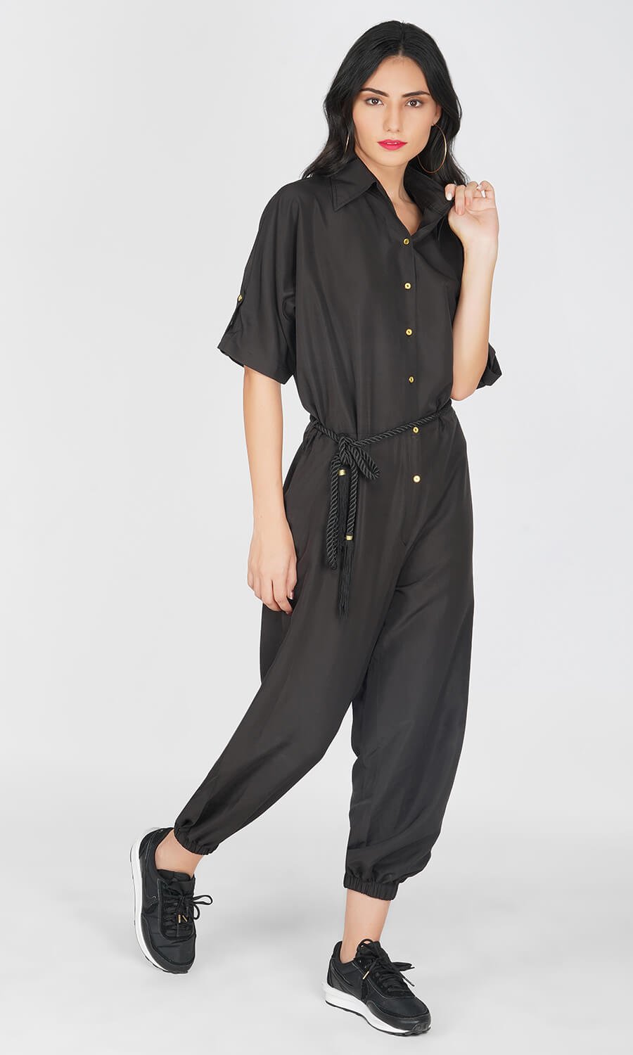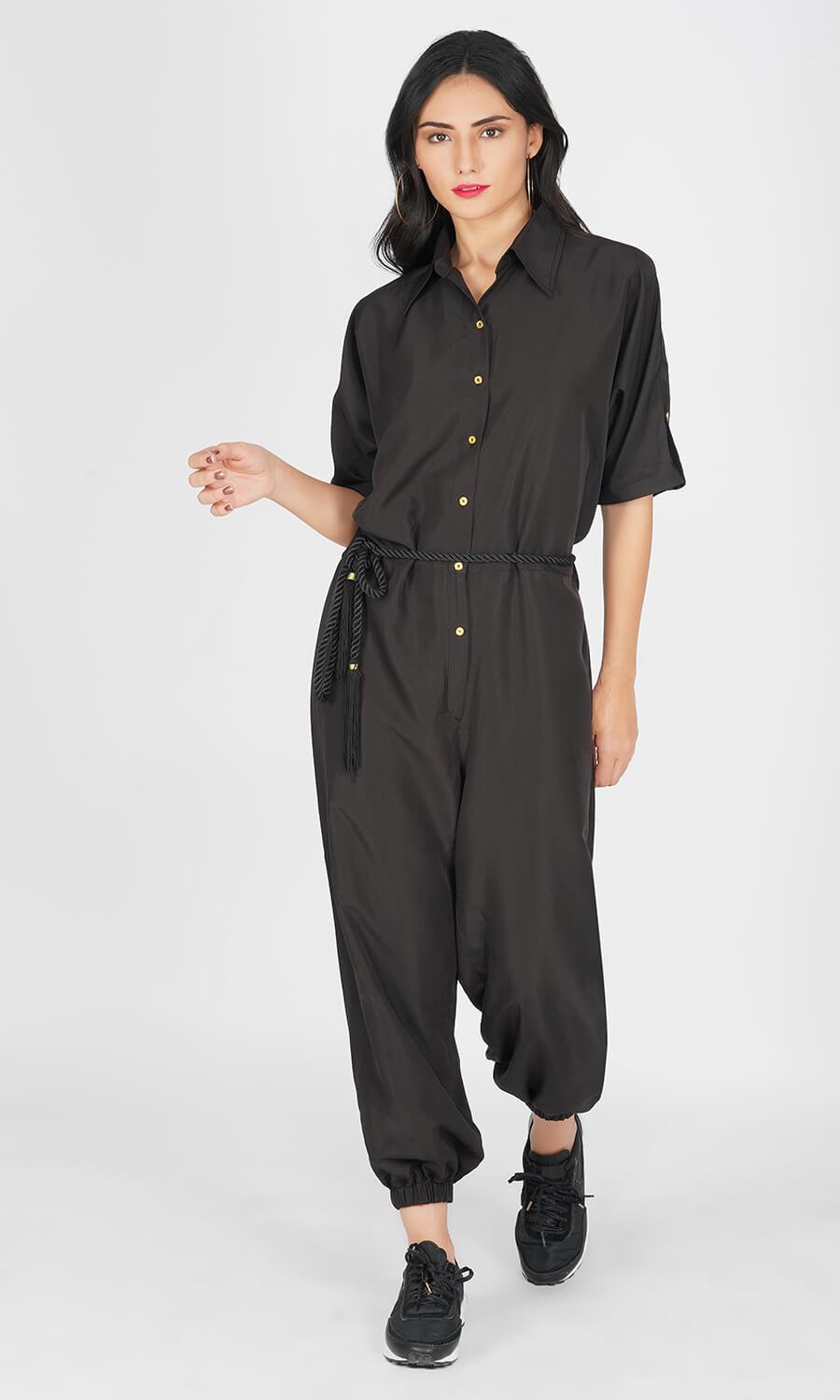 Black solid basic jumpsuit, has a v neck, long button placket, half sleeves, Comes with a stylish belt. Return Policy : This Dress is made on order, so we do not accept returns. Delivery Time : 7-12 Working Days