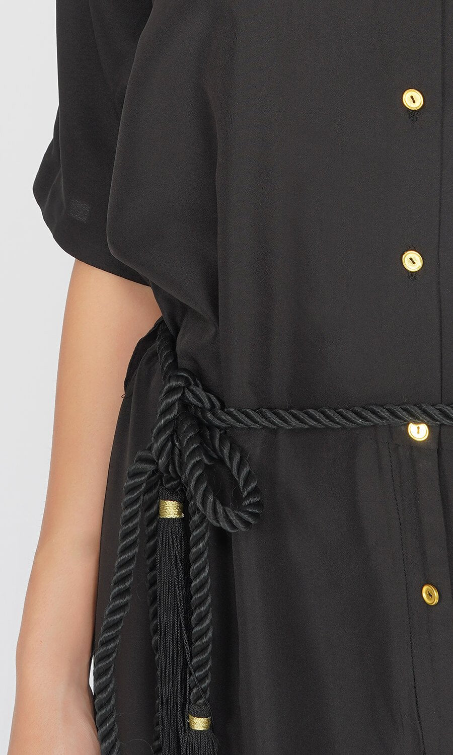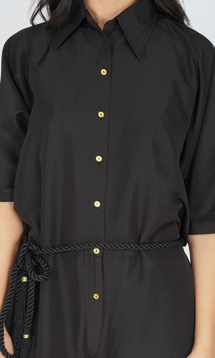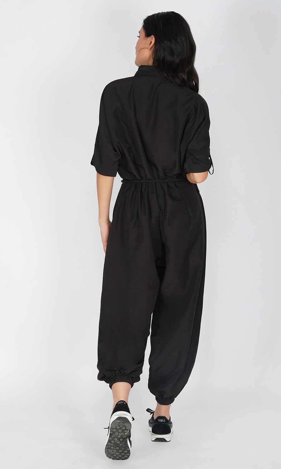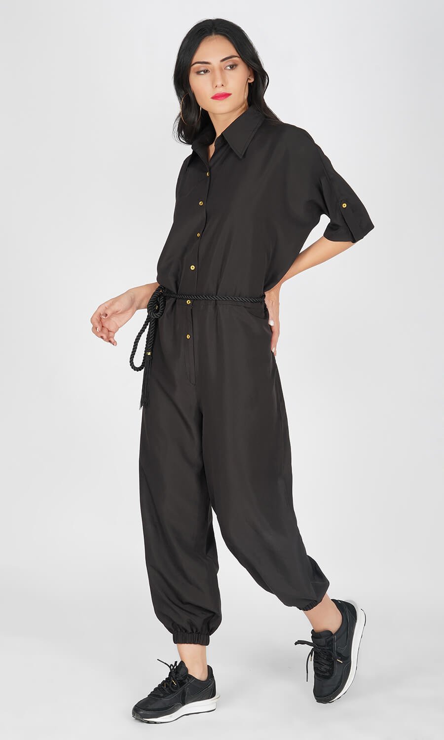 Black solid basic jumpsuit, has a v neck, long button placket, half sleeves, Comes with a stylish belt. Return Policy : This Dress is made on order, so we do not accept returns. Delivery Time : 7-12 Working Days