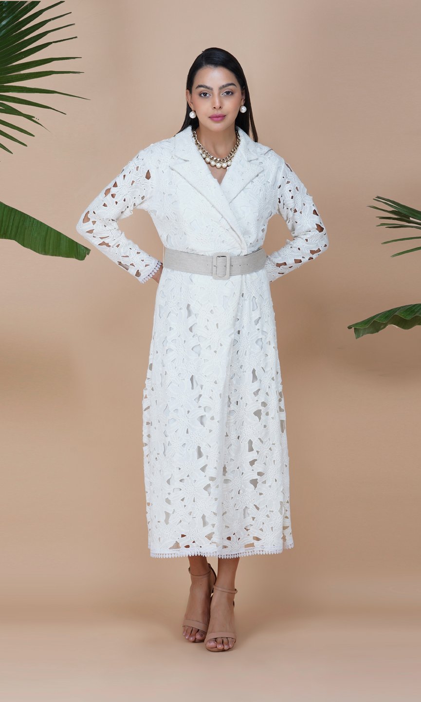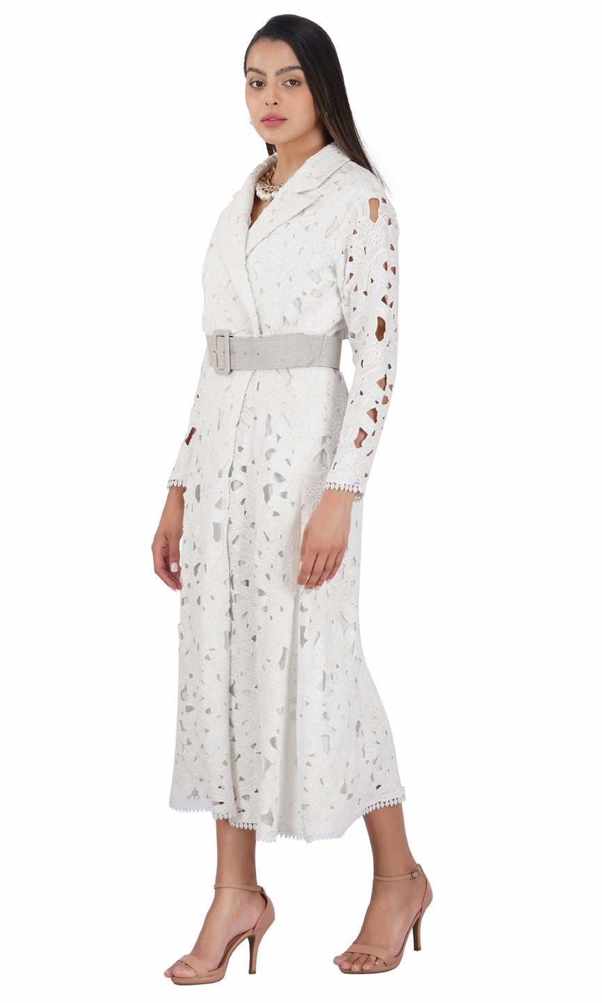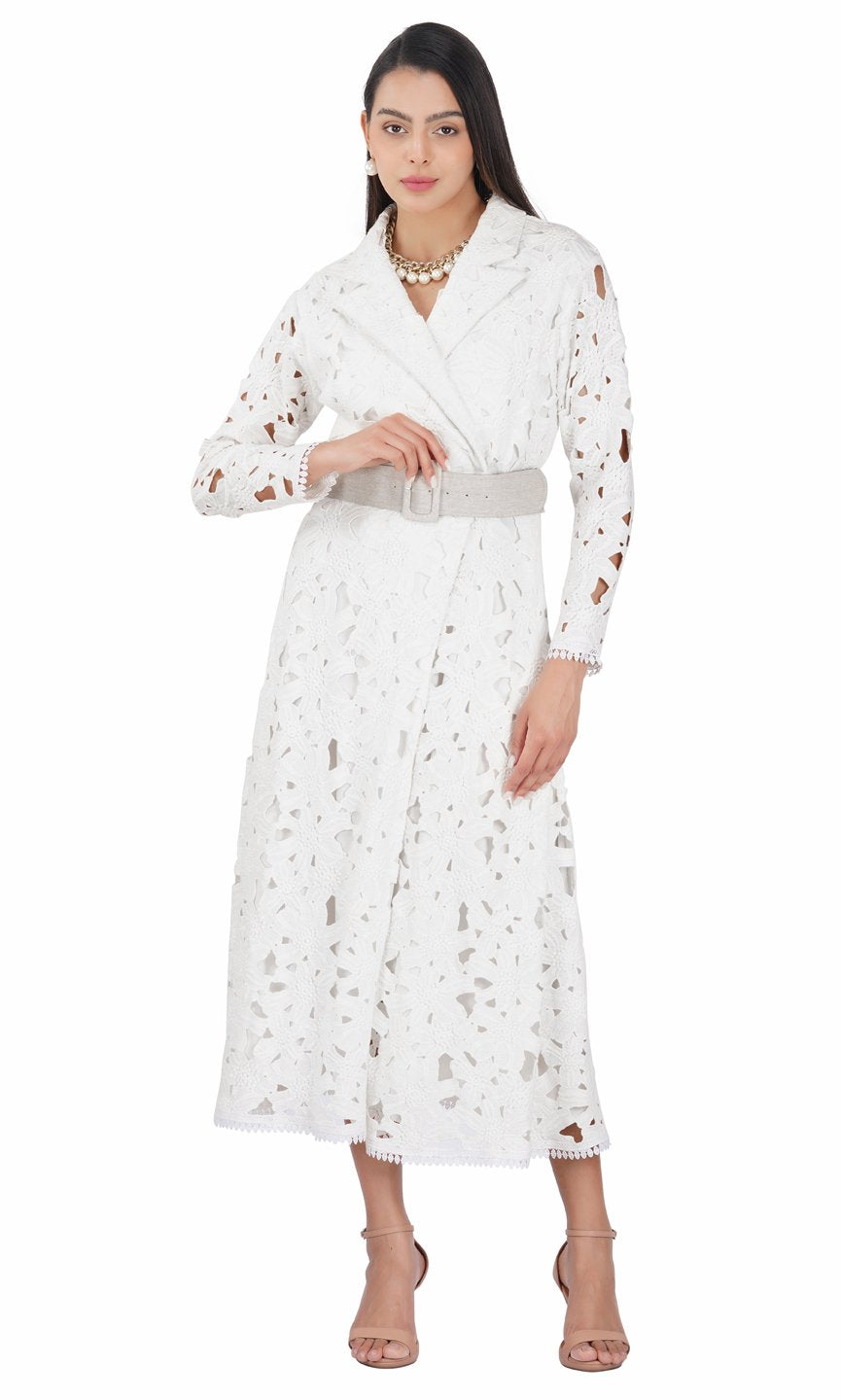 Featuring a white long trench dress in floral cotton lace fabric and styled with classy notched lapel collar. You can pair up with the belt to hilight your waist line. This outfit is perfect for lunch party or high tea. Care Instructions :