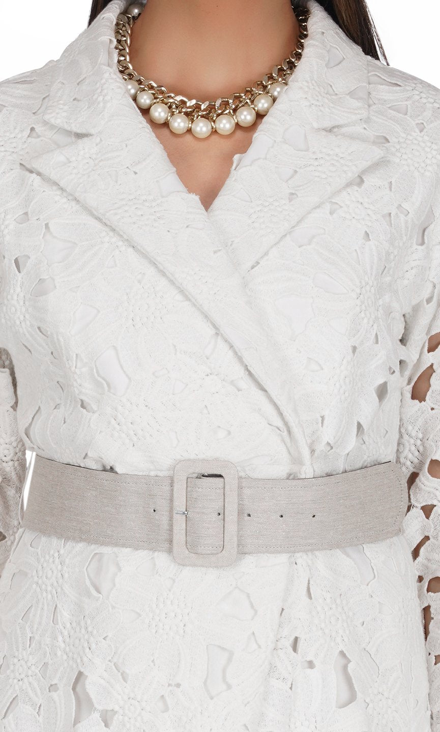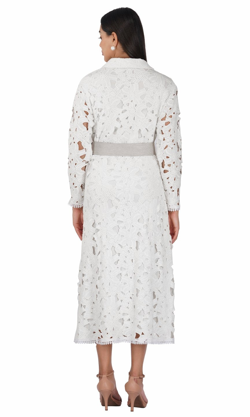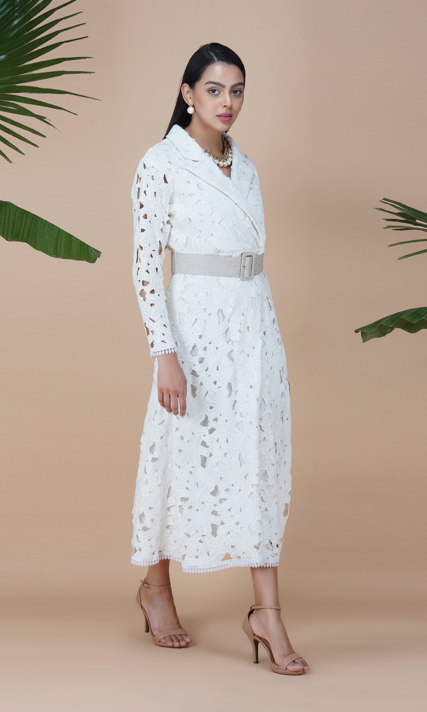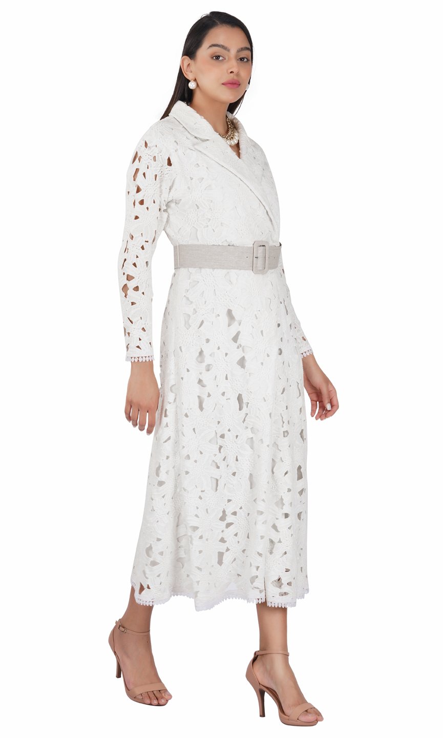 Featuring a white long trench dress in floral cotton lace fabric and styled with classy notched lapel collar. You can pair up with the belt to hilight your waist line. This outfit is perfect for lunch party or high tea. Care Instructions :