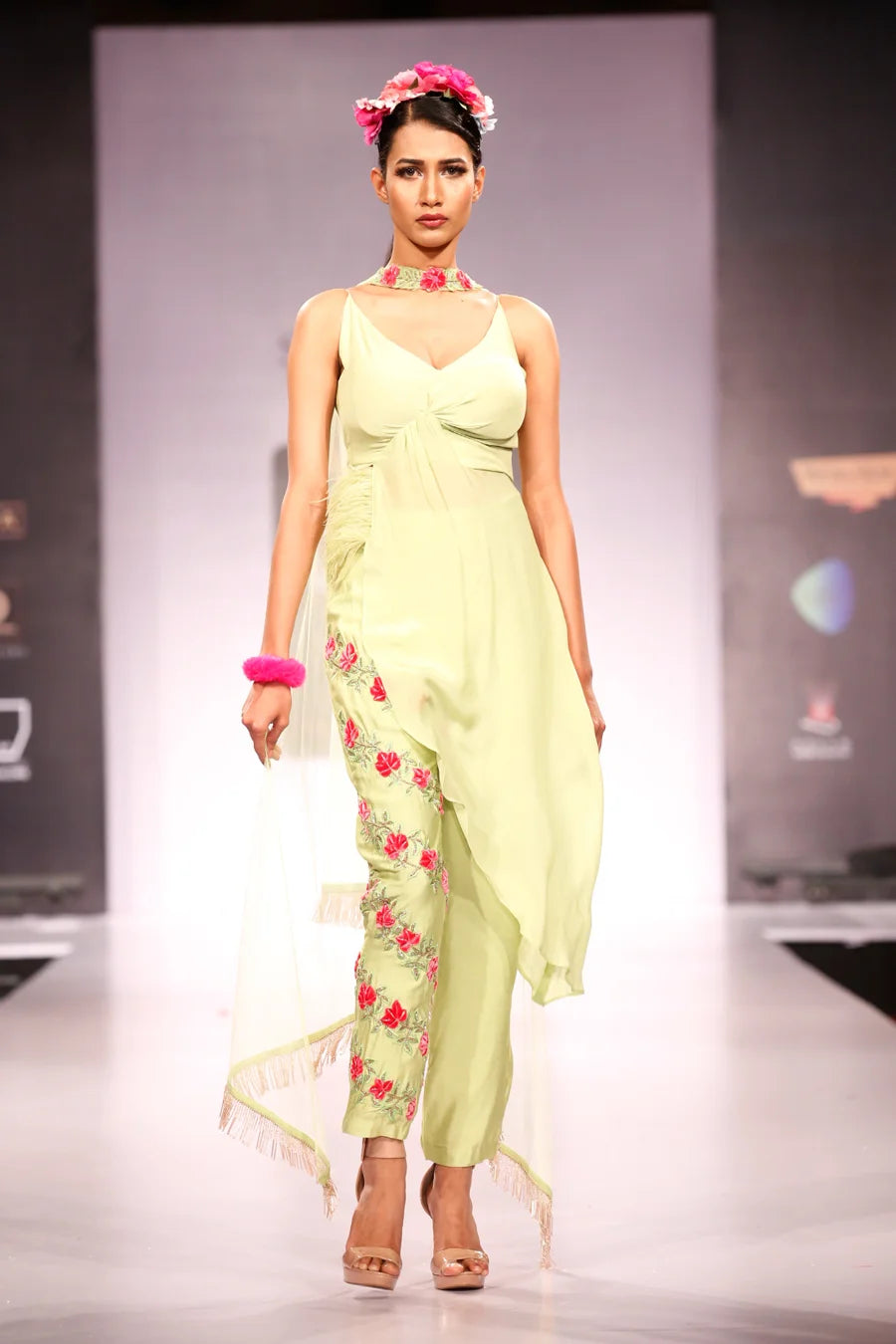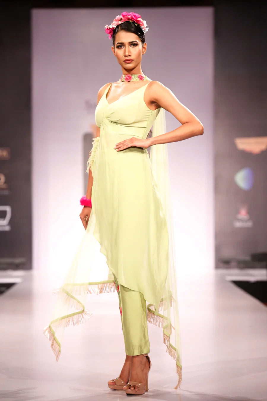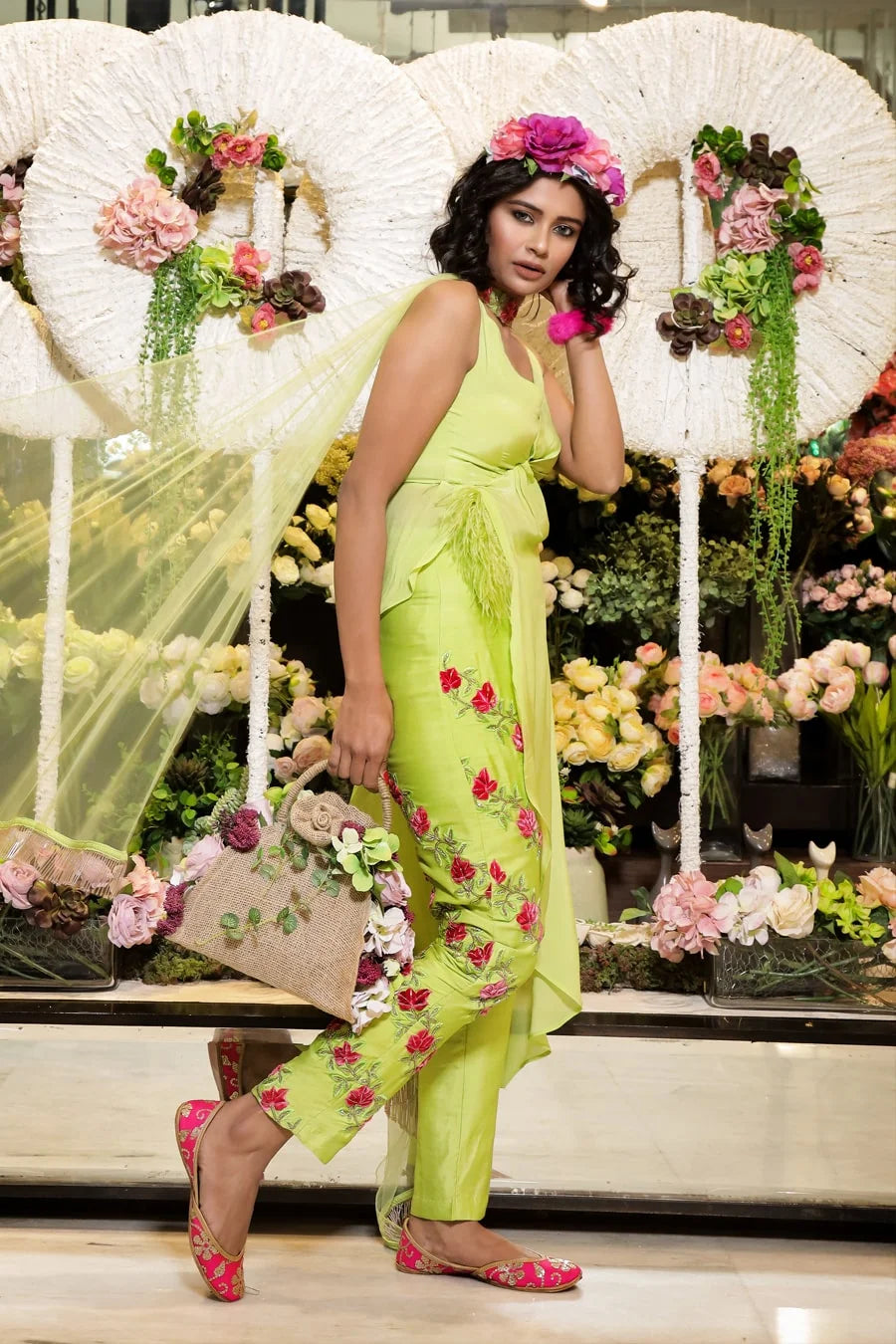 Lime Green Suit - The asymmetrical green spaghetti crepe top paired up with the cotton silk trouser. The trouser is embellished with the 3d machine embroidery and highlighted with beads. The net dupatta with a hanging tassel is easy to carry.