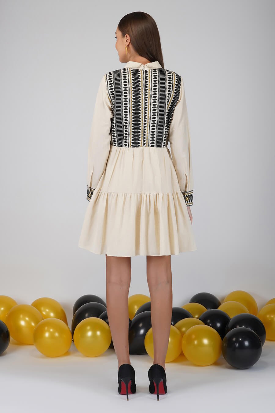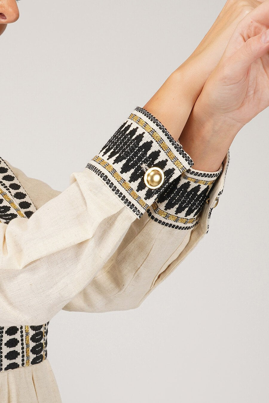 This yoke dress is very chic, the yoke is made with woven loomed fabric with a a-line silhoutte made in flax cotton. You can style this dress with metal belt. The belt is used only for styling purpose. It is not for sale. Care Instructions :