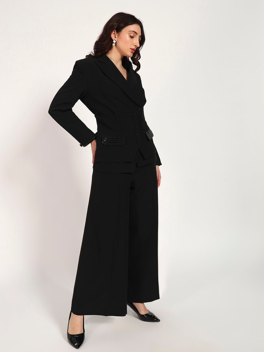 Make a bold power statement with this luxe 3-piece blazer set crafted in premium banana crepe. Featuring a tailored blazer, wide-leg trousers, and a structured corset belt with functional pockets, this set is elevated with black stone embellishments on the pockets and sleeves for refined glamour. Designed to flatter, define, and command attention—perfect for modern workwear and elevated evening dressing.