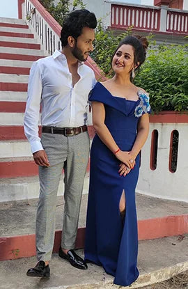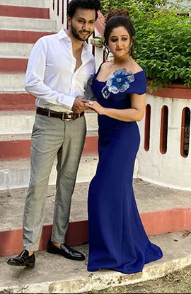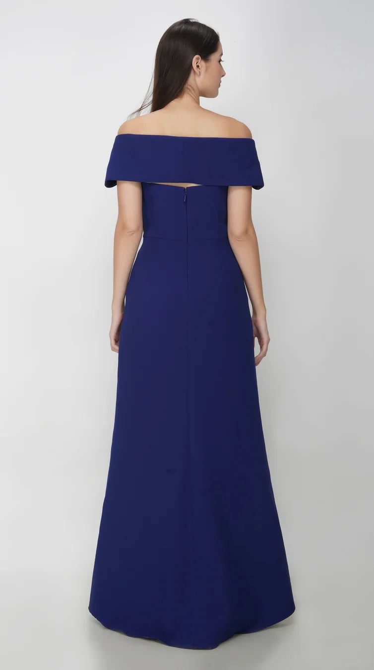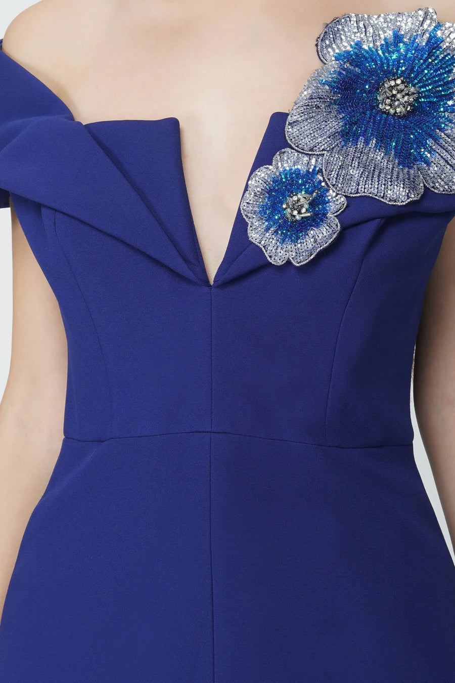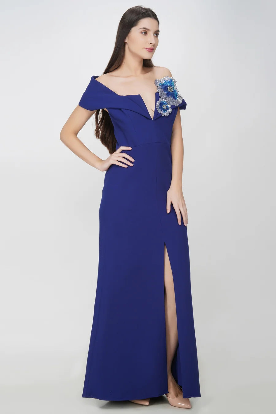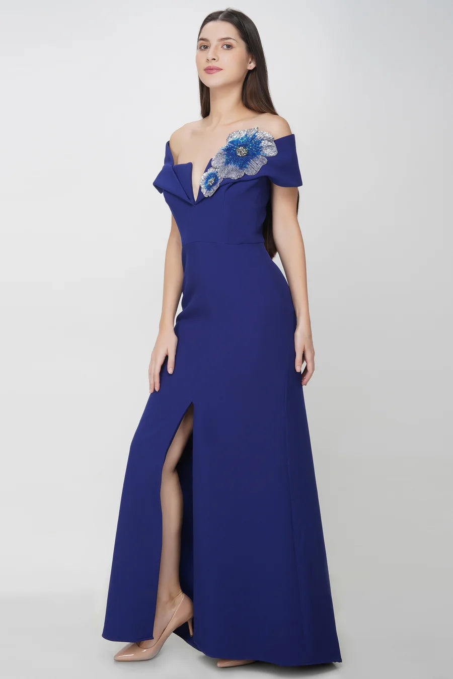 Banana crepe off shoulder full-length dress has a deep v-neck alongside embellished flowers detailing, has a slit in the middle.