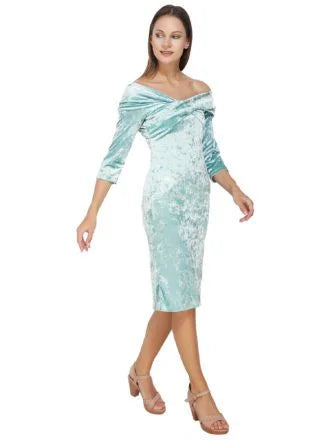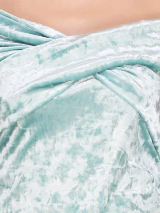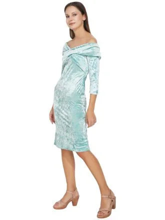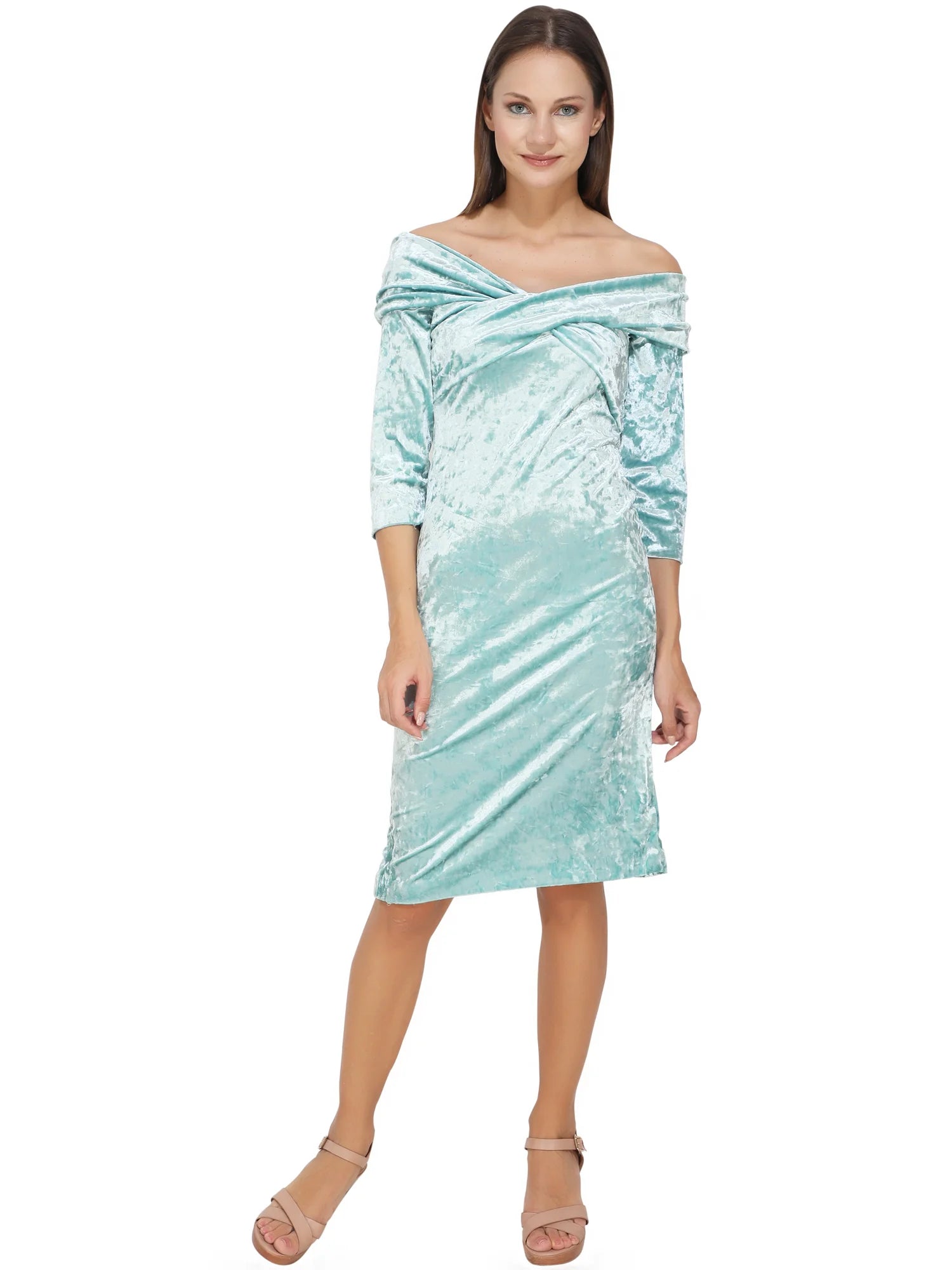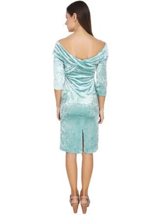 Off Shoulder Fitted Short Dress With Side Zip.The lovely pastel shade Aqua blue in with a lovely, stylish and soft fabric velvet lycra.This is a off shoulder dress with a criss cross design. A fitted bodycon dress fit for all your important occasions.