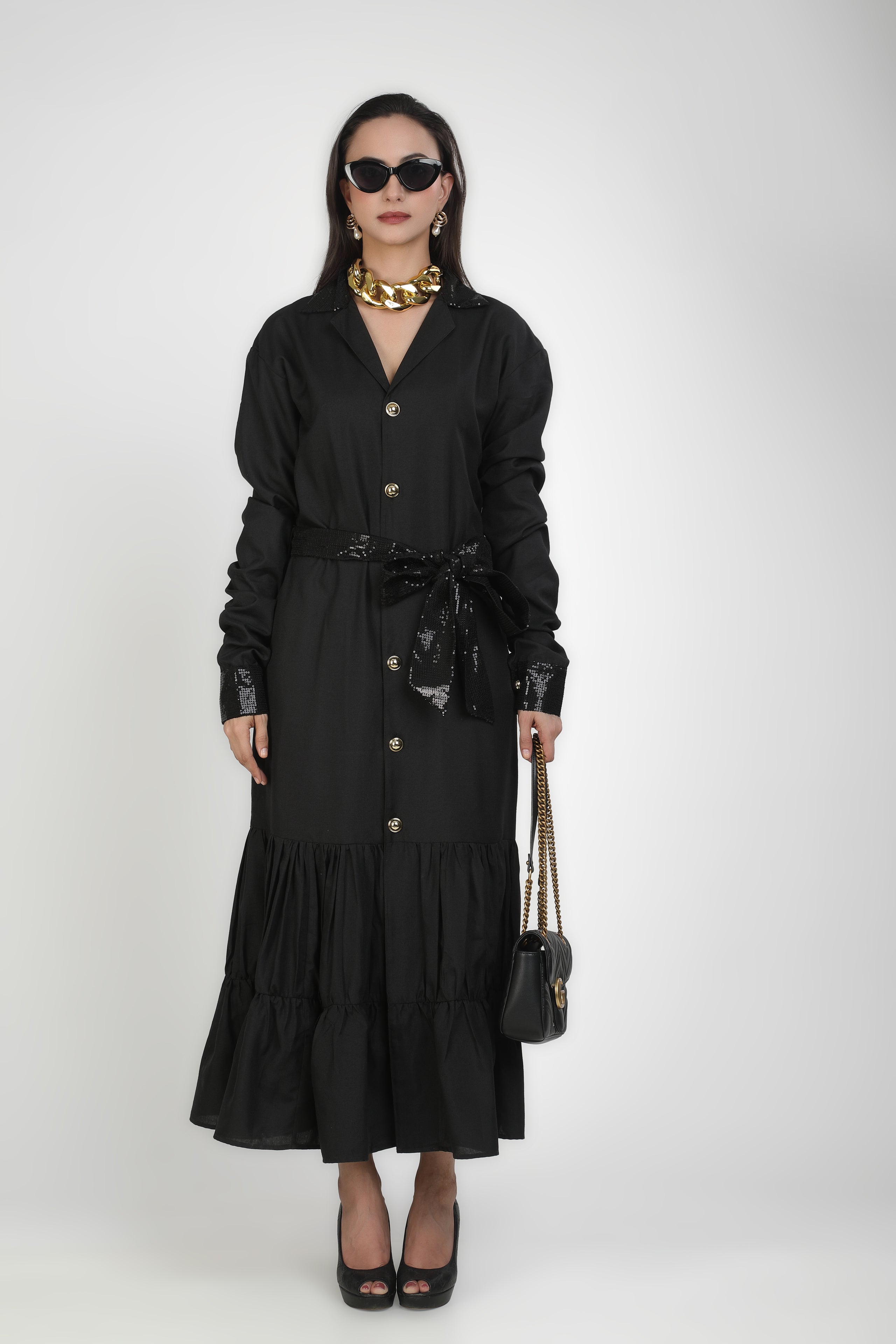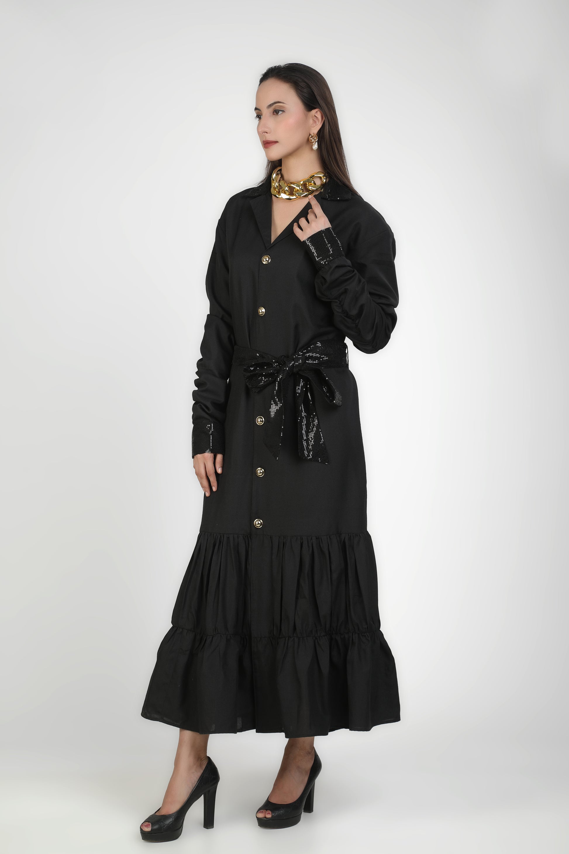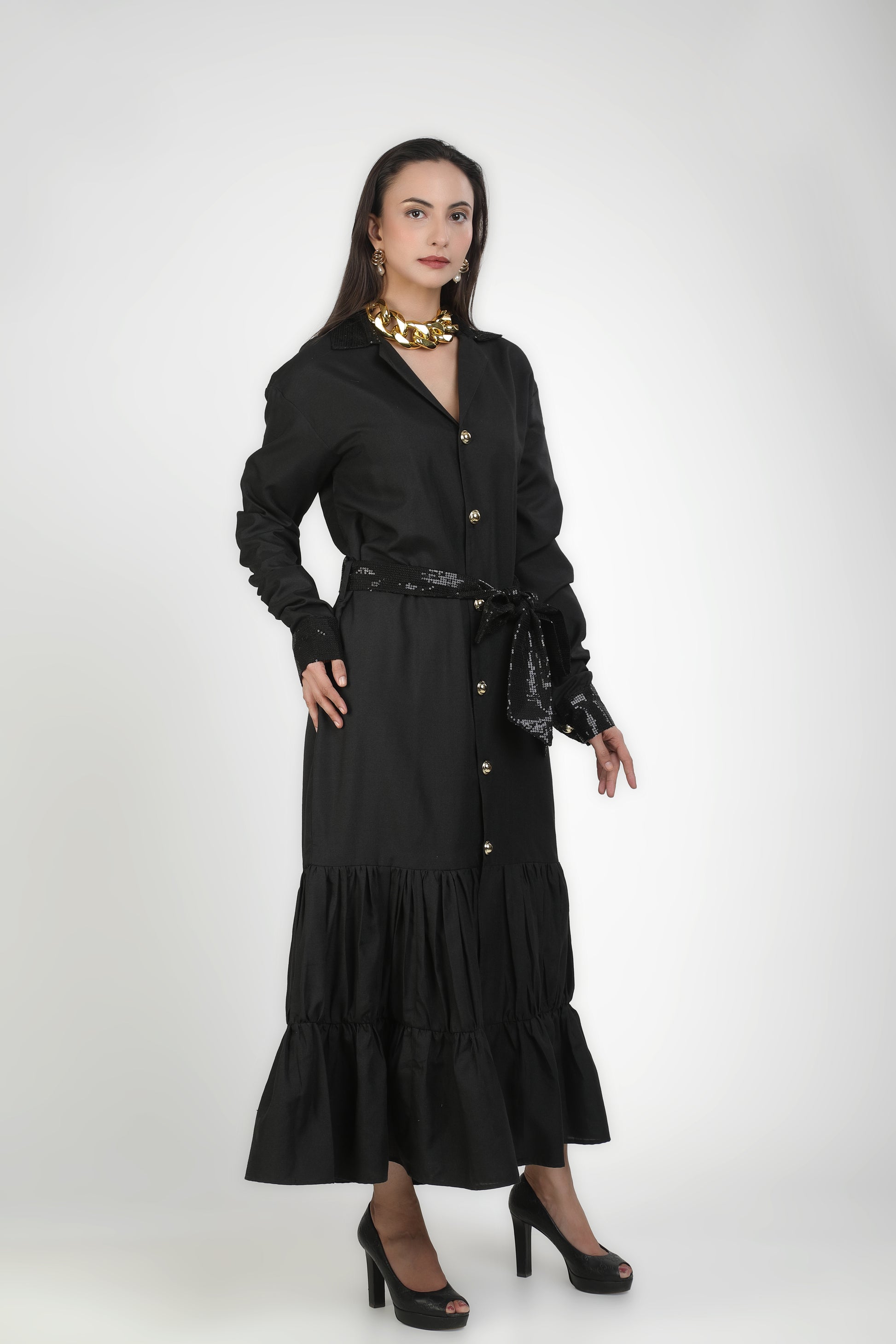 Onyx Collared Buttoned Tiered Maxi Dress
