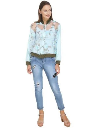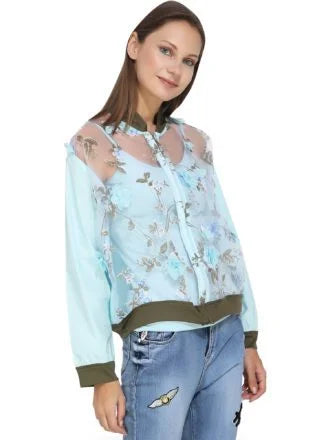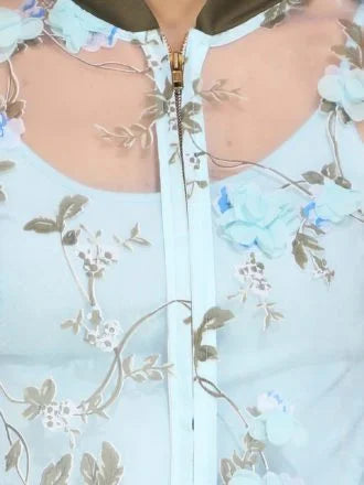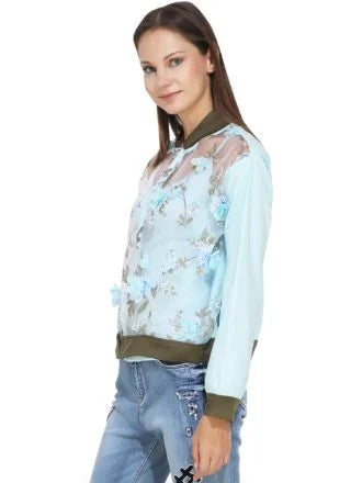 The powder blue organza with thread work boomer jacket which has a very stylish look.The boomer jacket has a fron zip opening giving a sheer look with the use of organza fabric.The jacket has a highlighted collar cuffs and the hemline. The jacket can be styled very well with everything.