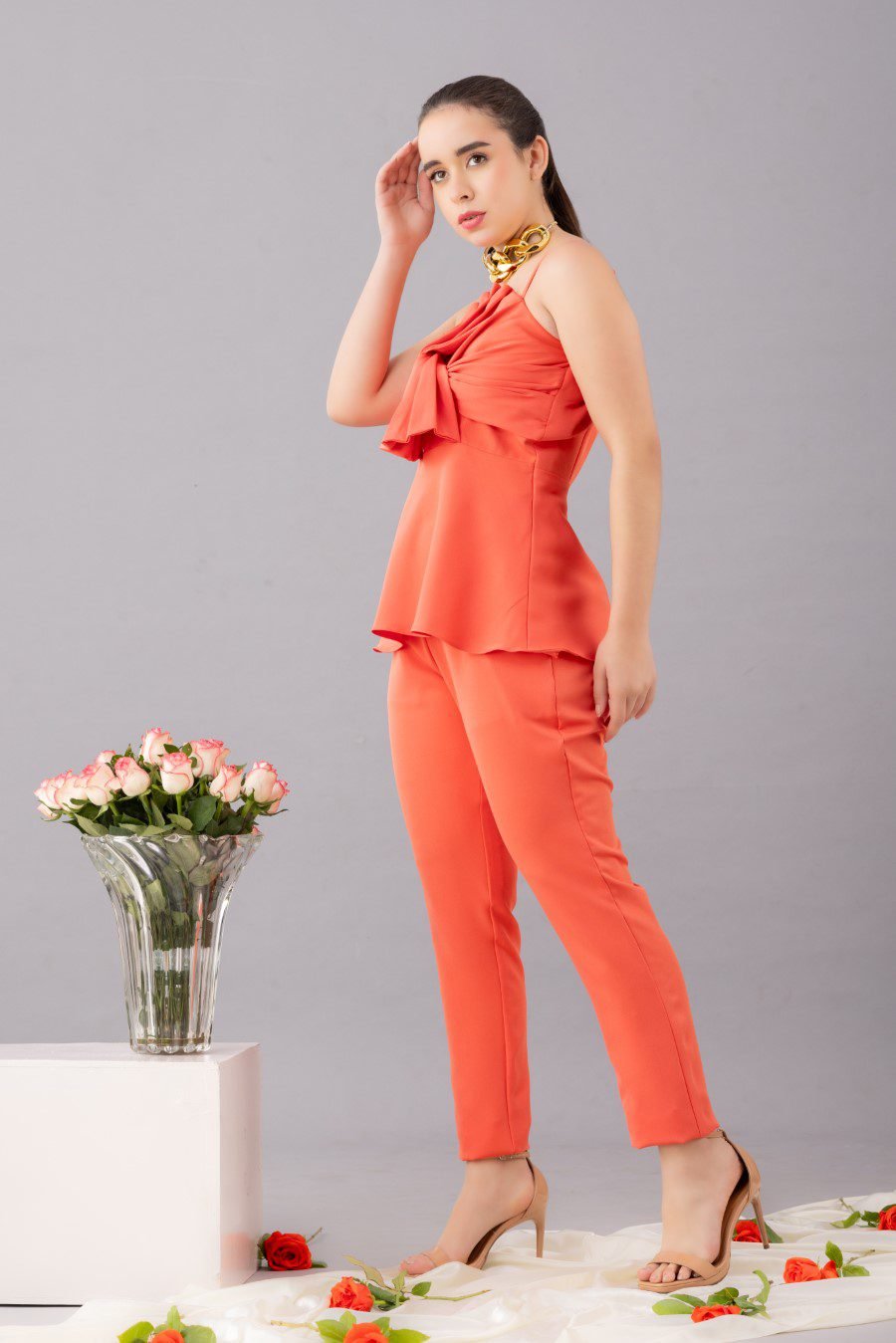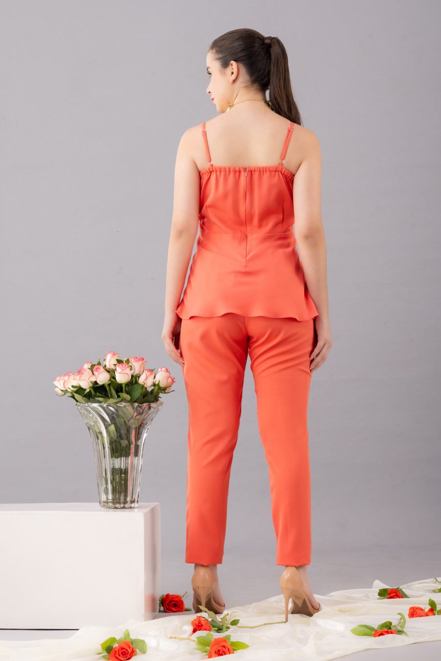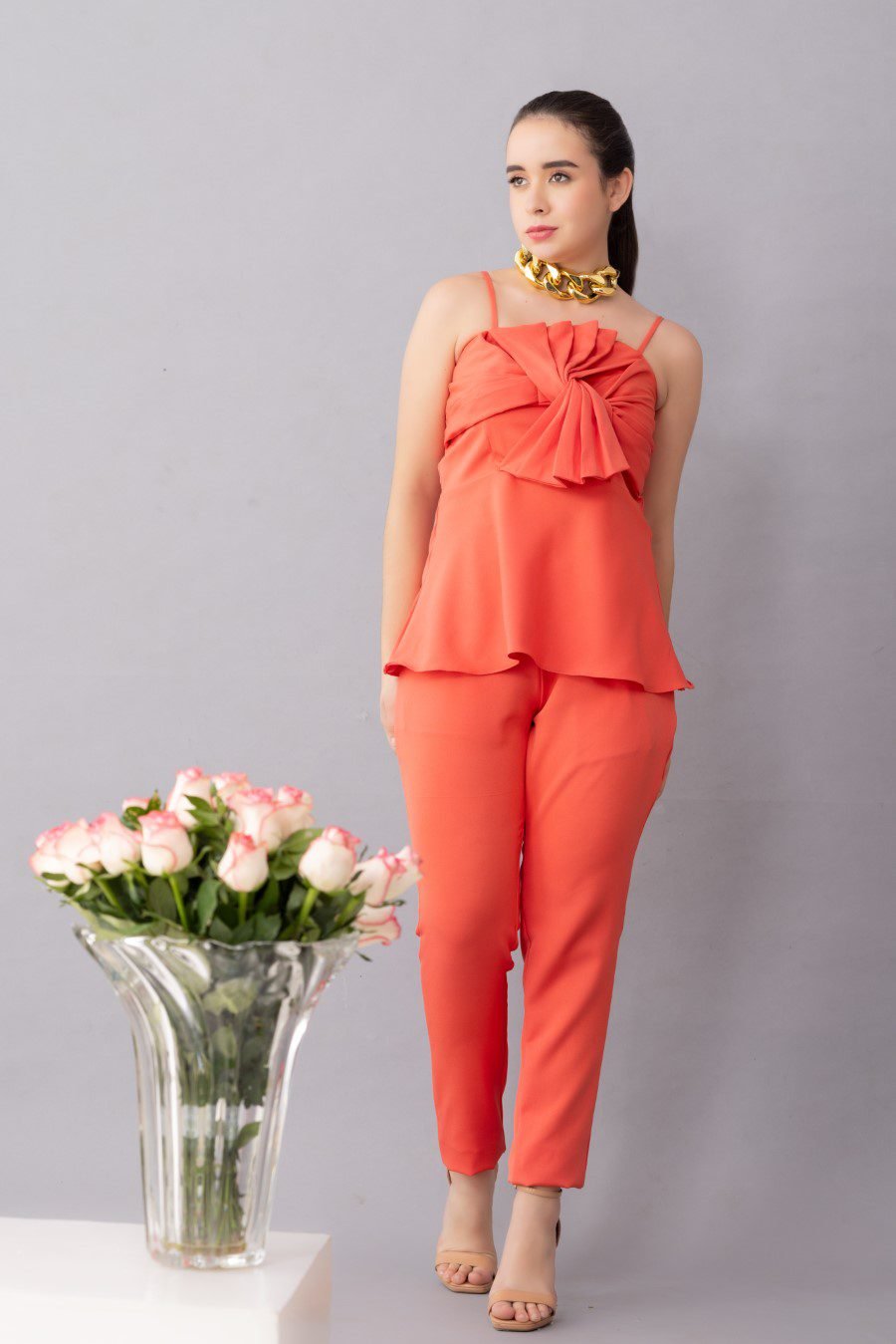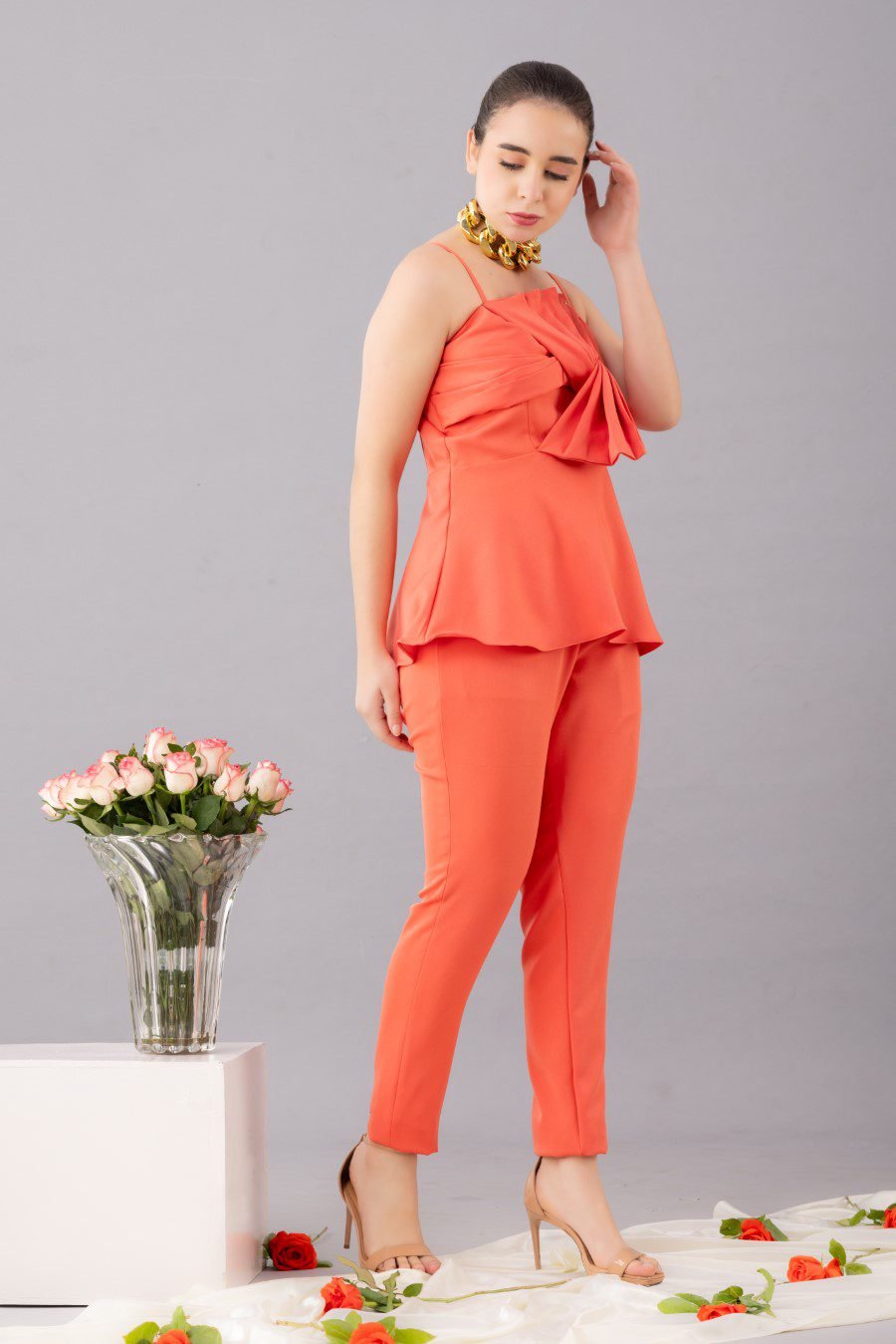 Introducing our Peach Coral Peplum Co-ord Set, a delightful ensemble crafted from luxurious Banana Crepe fabric, designed to exude elegance and charm.At the heart of this ensemble lies the Peplum Top, adorned with a unique twist: a twisted drape detail at the yoke.The back zip ensures ease of wear, while adjustable straps offer a customized fit for maximum comfort.Complementing the Peplum Top is the Coordinating Pencil Trouser, designed for a sleek and sophisticated look. Crafted from the same Banana Crepe fabric, these trousers feature an front belt with elasticized back waistband and pockets for added comfort and flexibility, while a side zip ensures a seamless fit. Size Available From XS To 3XL. Style Tip : The Peach Coral Peplum Coord Set offers a harmonious blend of style and versatility, perfect for a variety of occasions. Whether worn together for a polished and coordinated look or styled separately for added versatility, this ensemble is sure to make a statement wherever you go. Care Instructions :