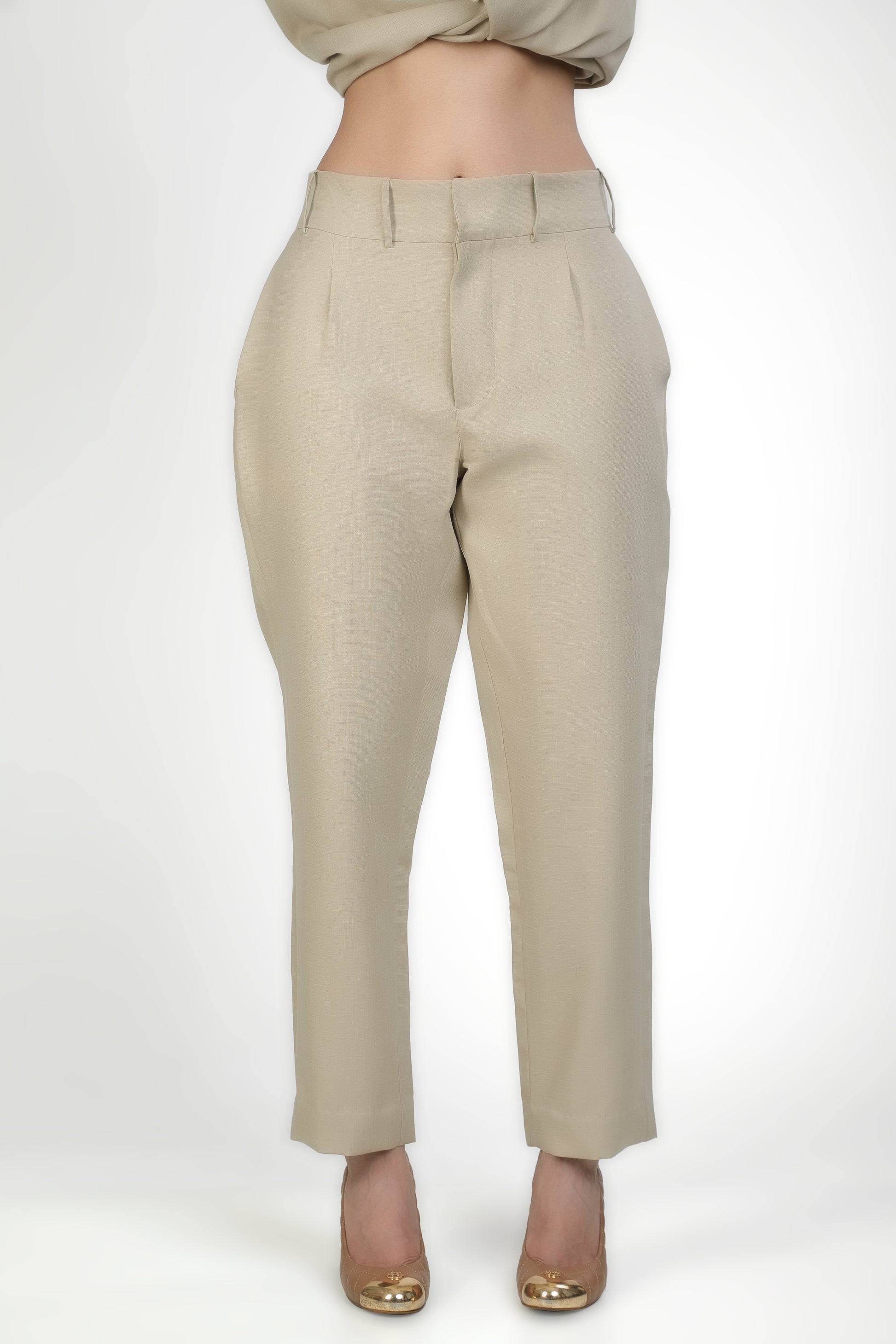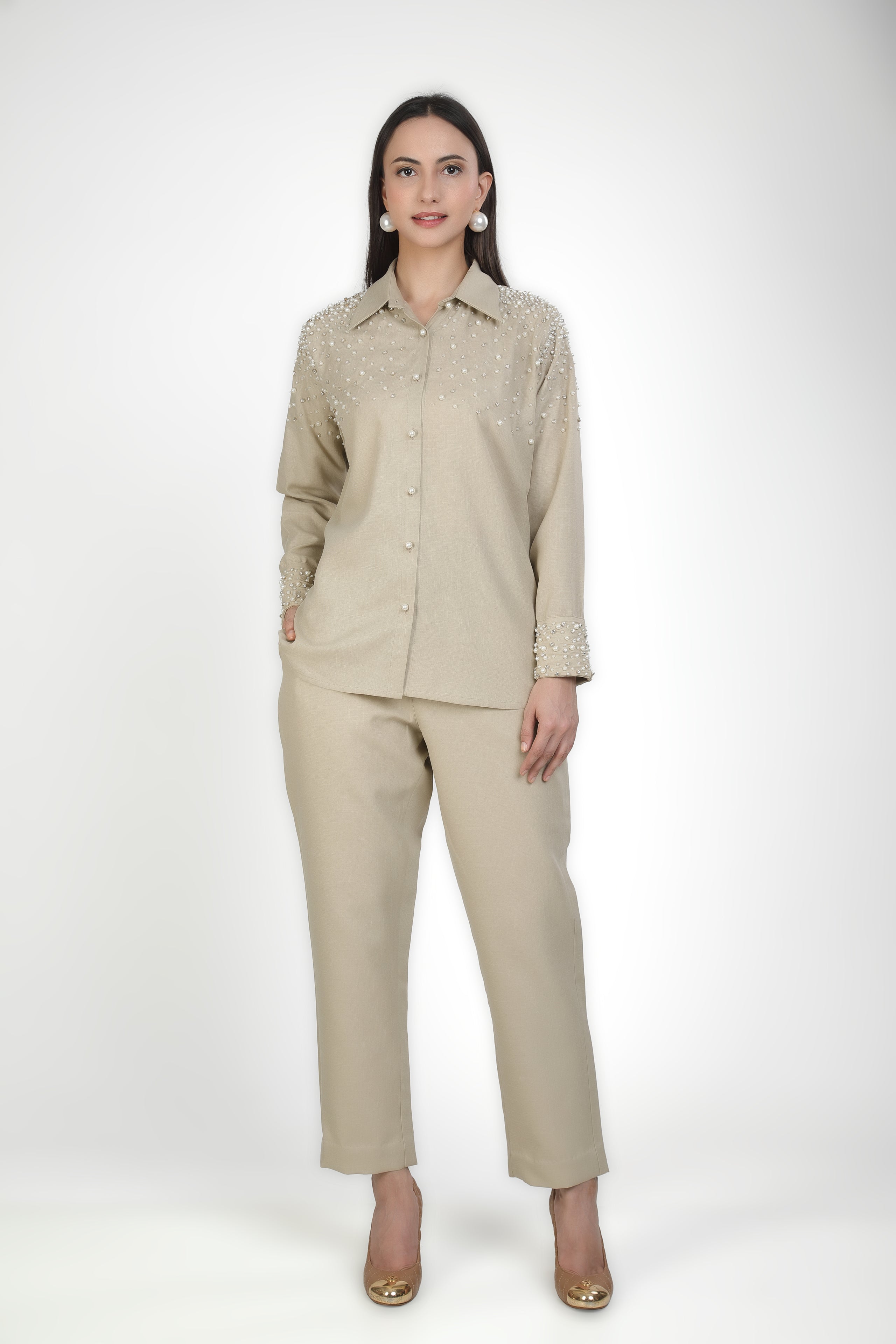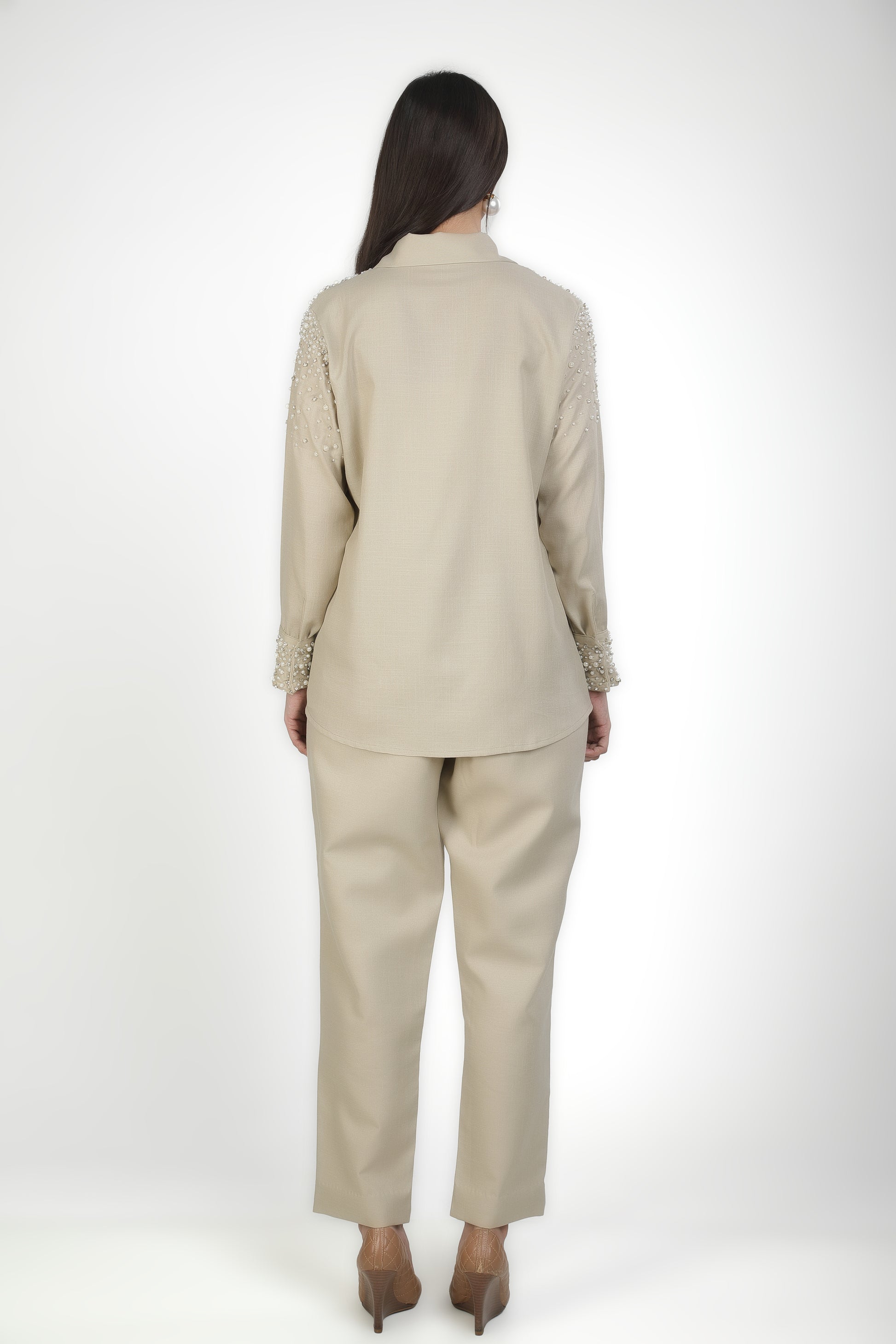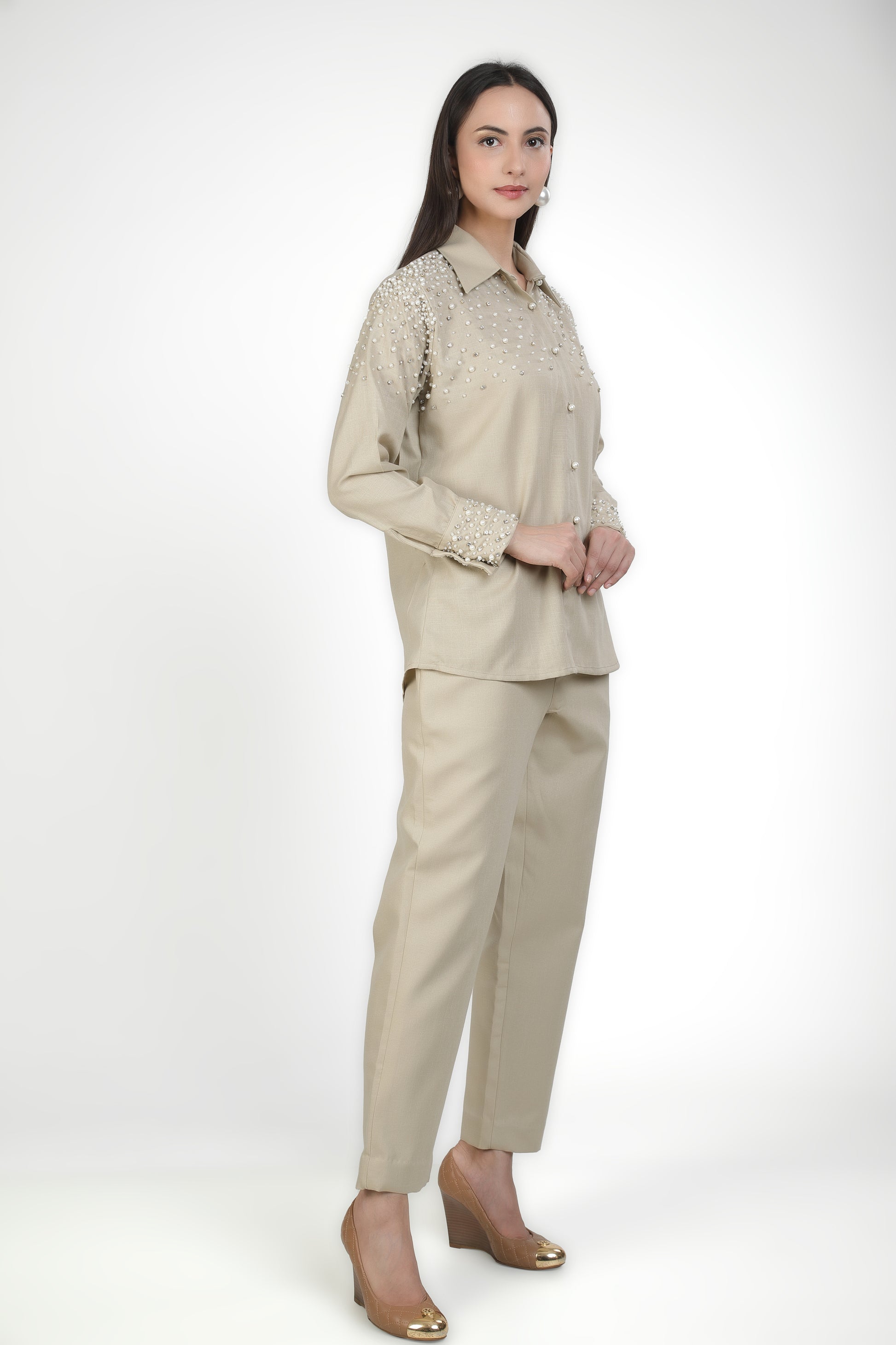Featuring light beige shirt adorned with an artful scatter of pearls and crystal embellishments along the shoulders with trousers based in linen blend.