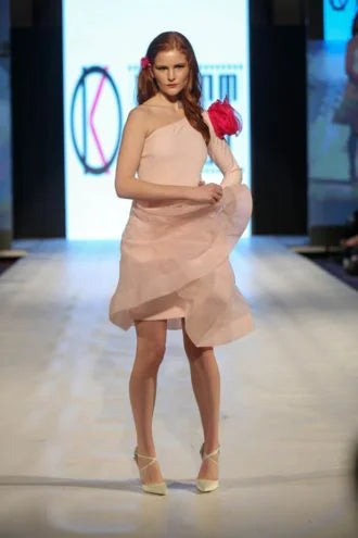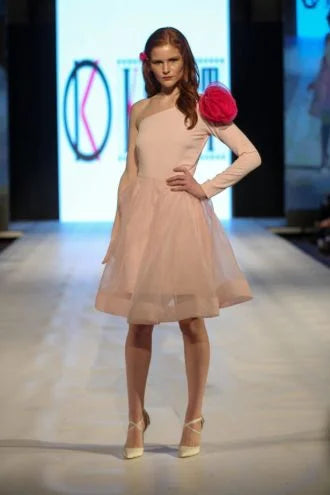 Pink Florid Statement - Exclusive Runway One-Sided shoulder brunch wear the dress in the delicate powdered pink shade, embellished with hot pink handmade flowers.