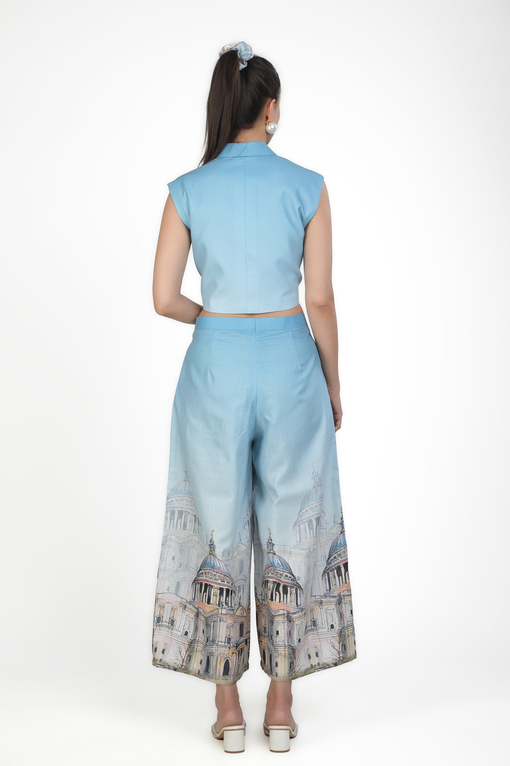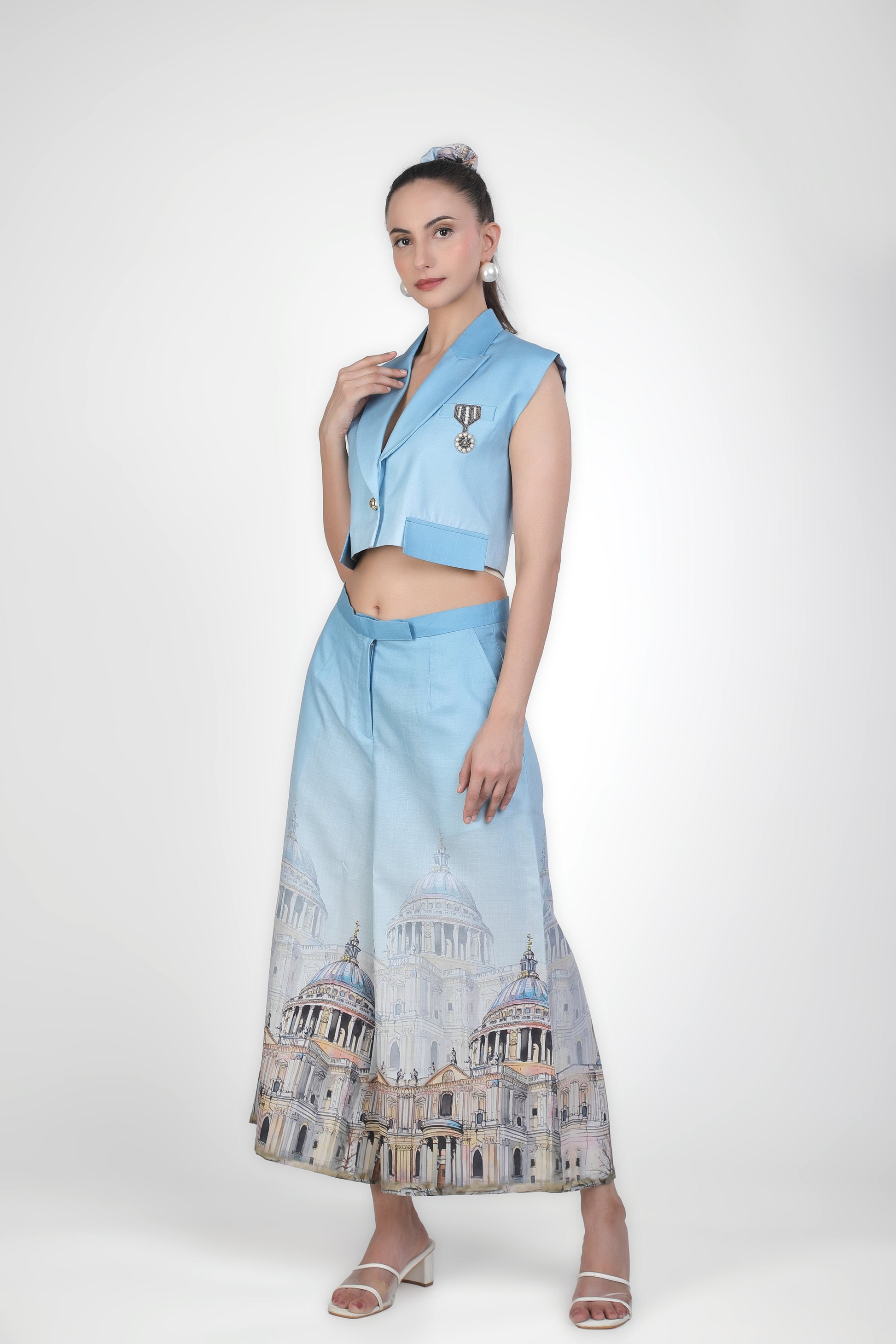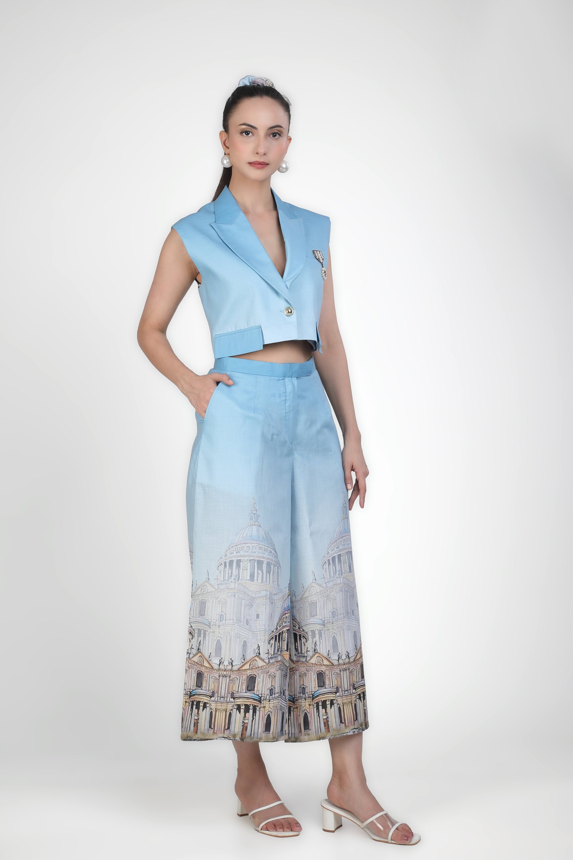 Featuring an elegant sleeveless pastel blue blazer crop with single button and unique embellishment.