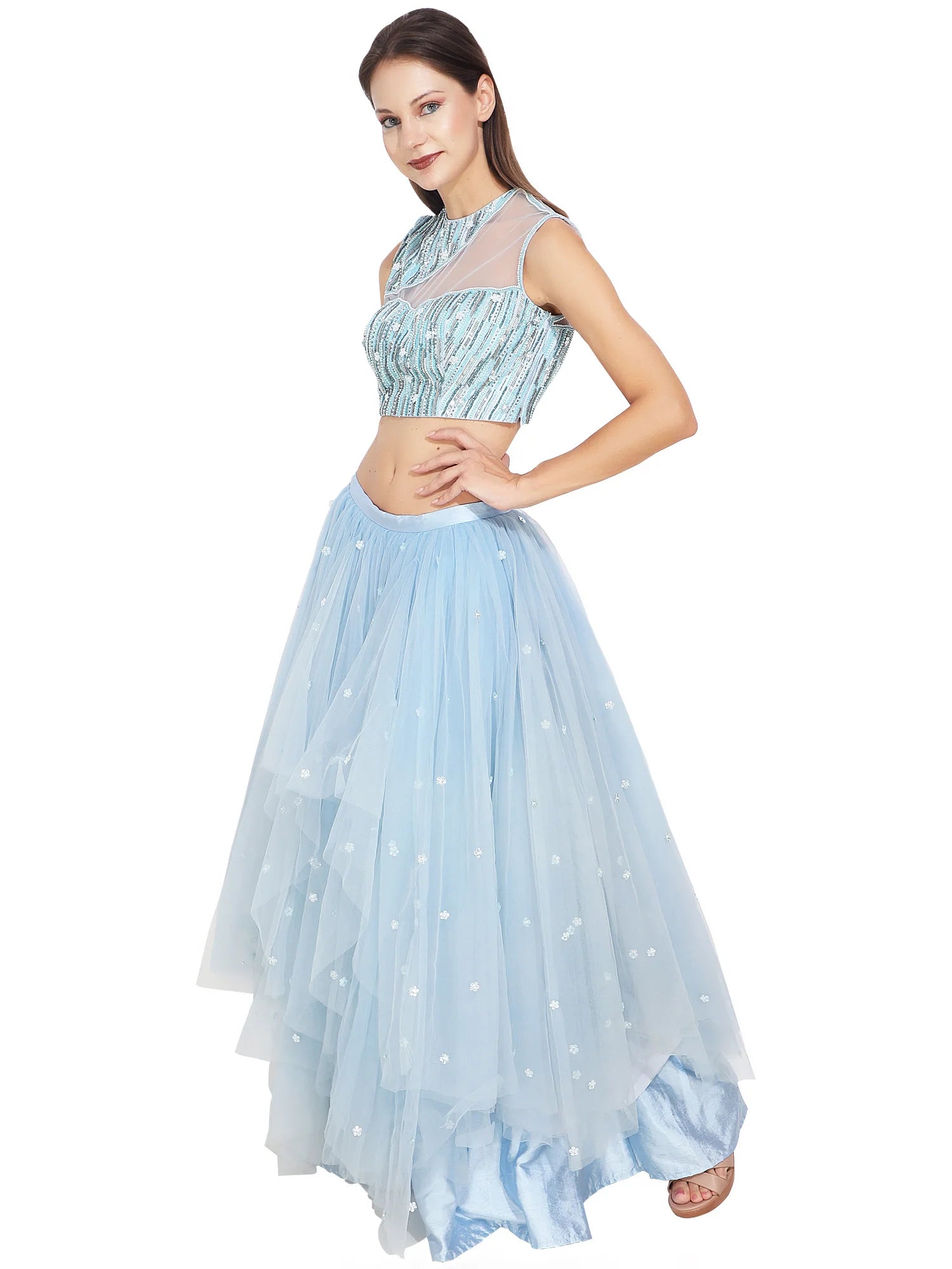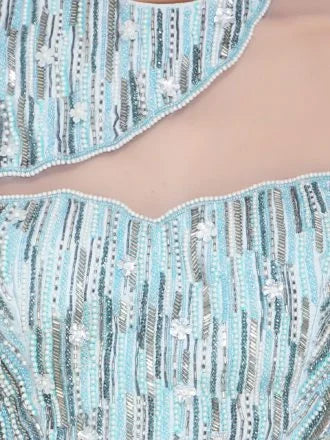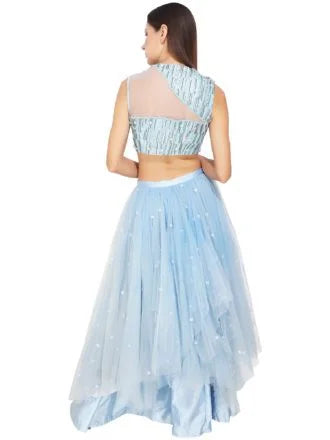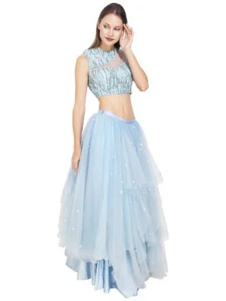 Sleeveless Net And Sequin Choli With Cut Out Lehenga - Powder blue color sequin silk and net fashion fabrics. An attire that is perfect for day as well as night weddings/occasions. A designer choli with sequin work on silk and a net sheer cut out for enhancement paired up with net cut out voluminous lehenga. Delicate sequin work done on the choli with silver sequins and small sequin flower on net lehenga.
