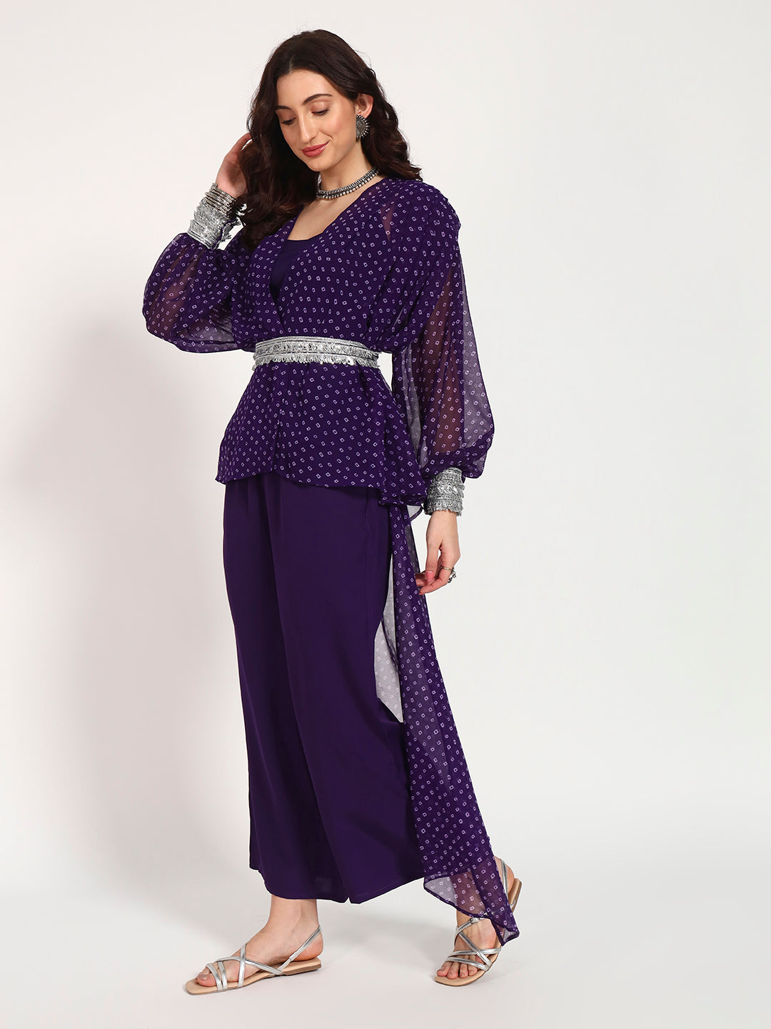 Add a touch of modern elegance to your festive wardrobe with this Purple Bandhani Georgette High-Low Top. Crafted in lightweight georgette, the top features a graceful high-low hemline that creates a fluid, flattering silhouette. The full sleeves are elevated with intricate silver lace–embellished cuffs, adding a hint of shimmer and sophistication. A silver lace–detailed tie-up belt cinches the waist beautifully, enhancing the overall drape and fit. Layered over a comfortable spaghetti-strap crepe slip, this ensemble balances style and ease effortlessly. Perfect for festive occasions, evening gatherings, or contemporary ethnic styling, this piece pairs seamlessly with palazzos, skirts, or tailored pants for a refined statement look.