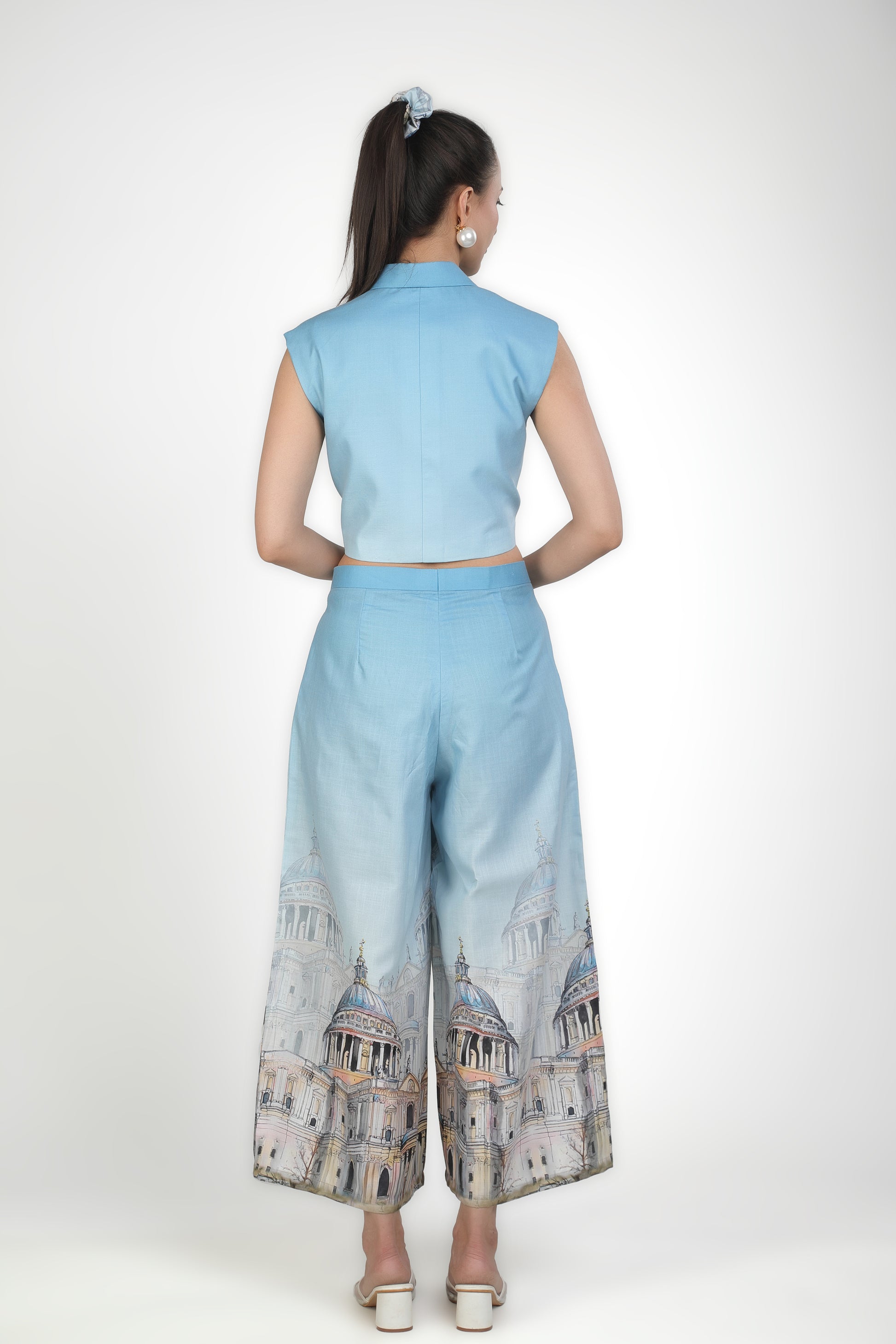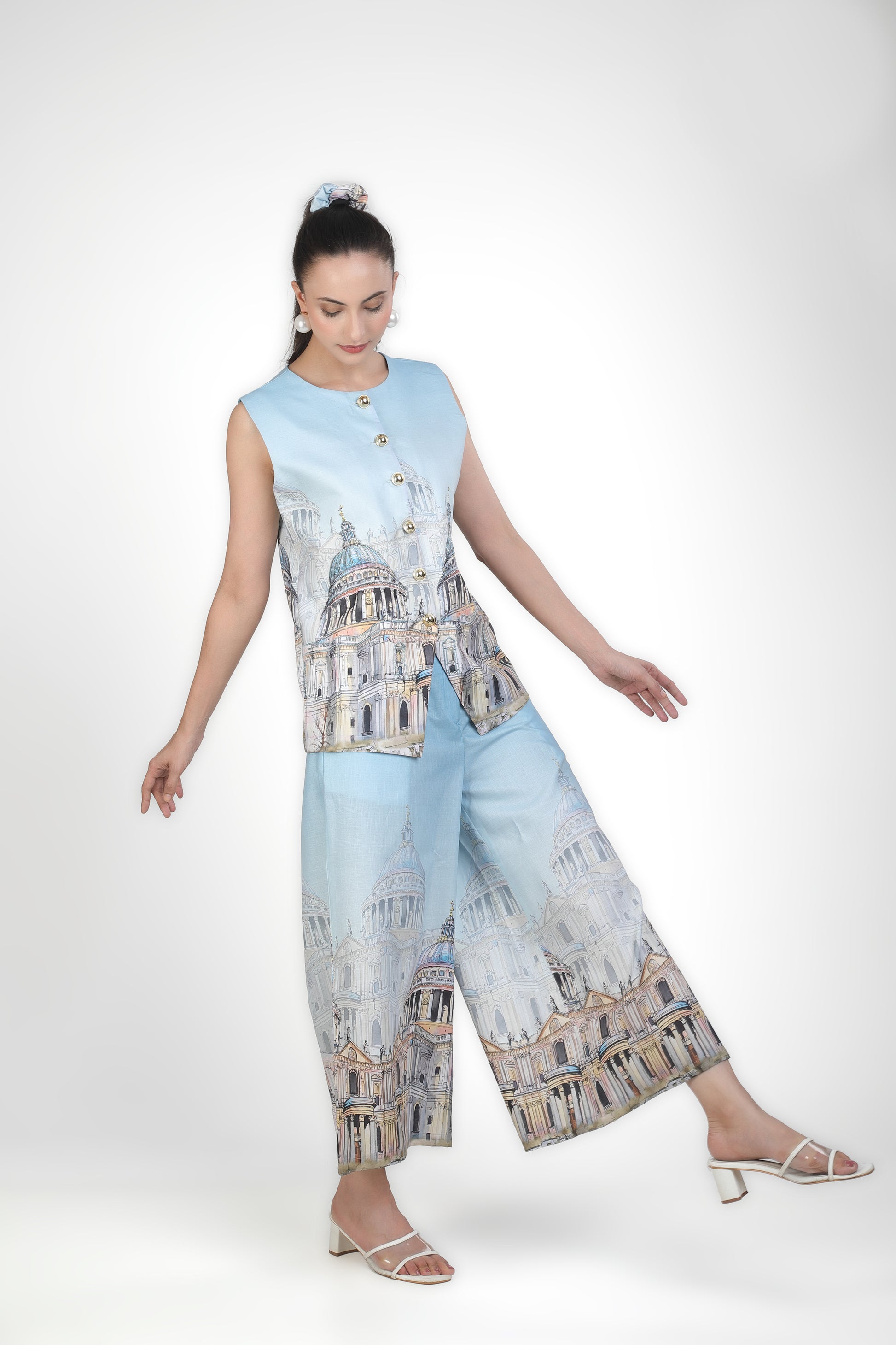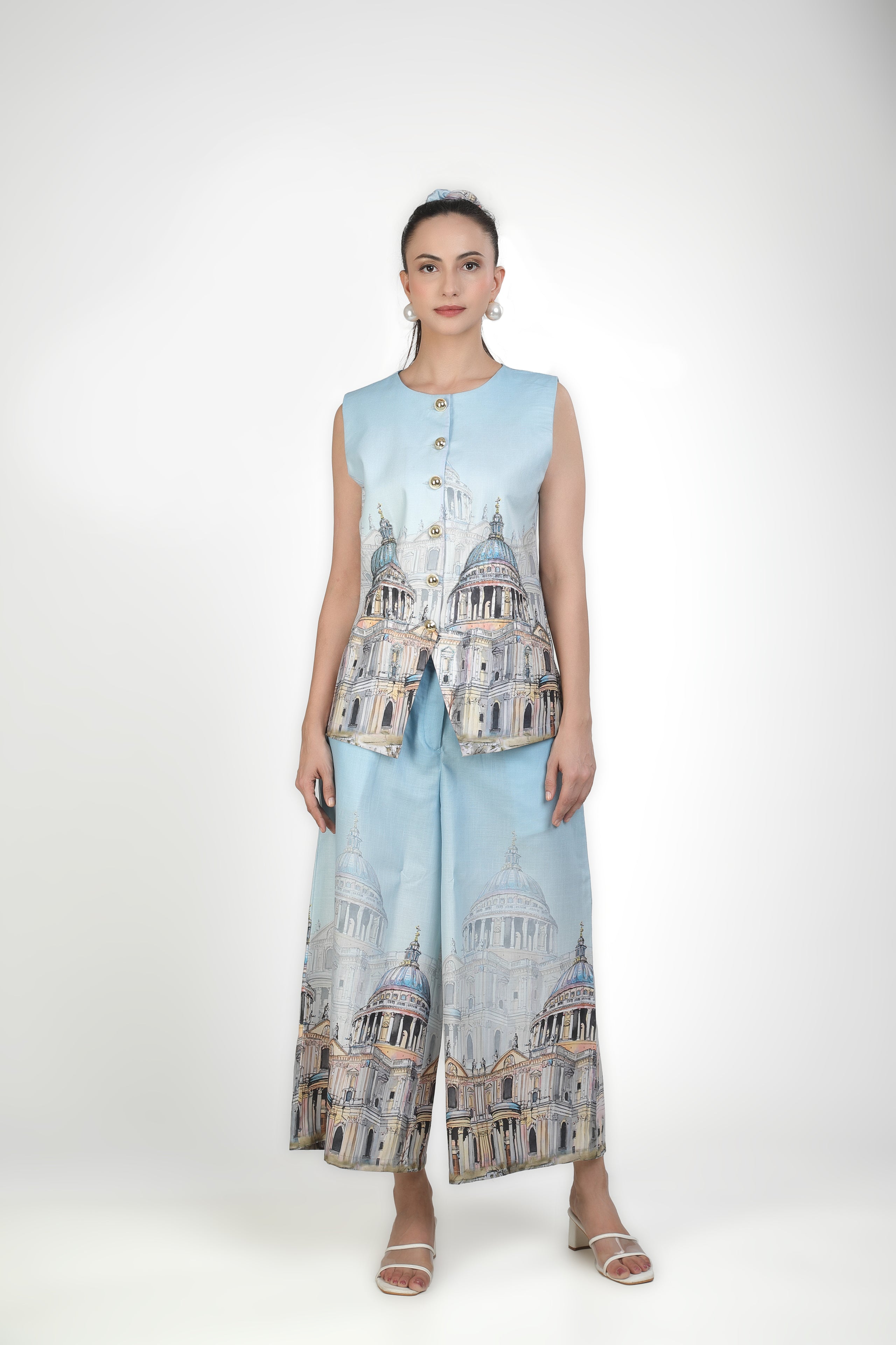 Featuring light blue architecture print based in soft linen.