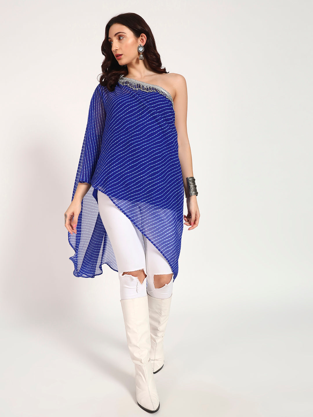 Make a bold style statement with this royal blue Lehariya asymmetrical off-shoulder top. Crafted in lightweight sheer fabric, it features a fluid drape with a modern high-low hemline that adds effortless movement. The off-shoulder neckline is accentuated with delicate silver embellishment detailing, while the inner slip ensures comfort and coverage. Perfect for festive gatherings, parties, or contemporary fusion styling.