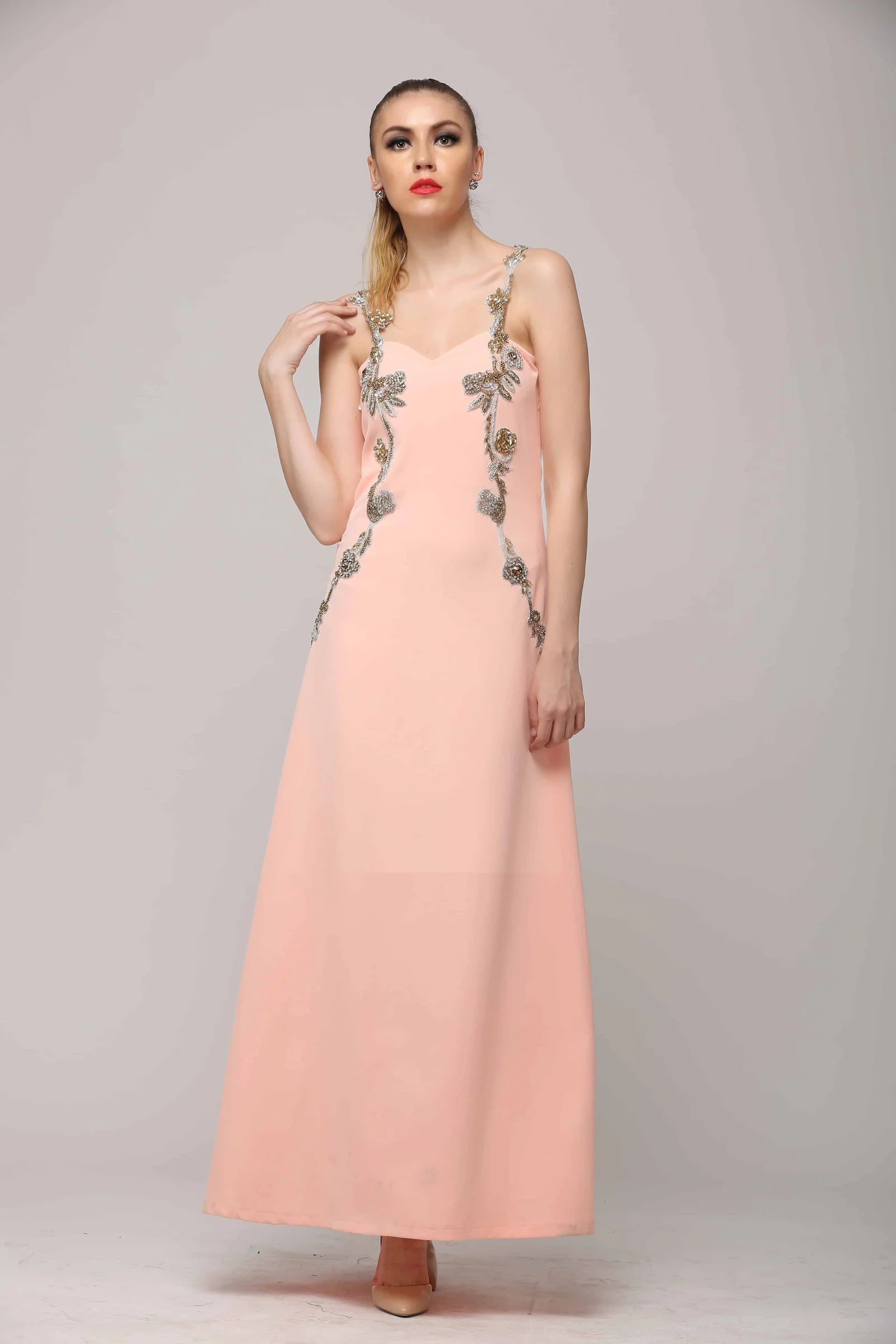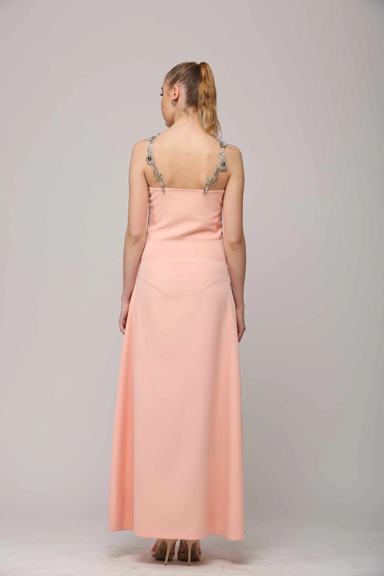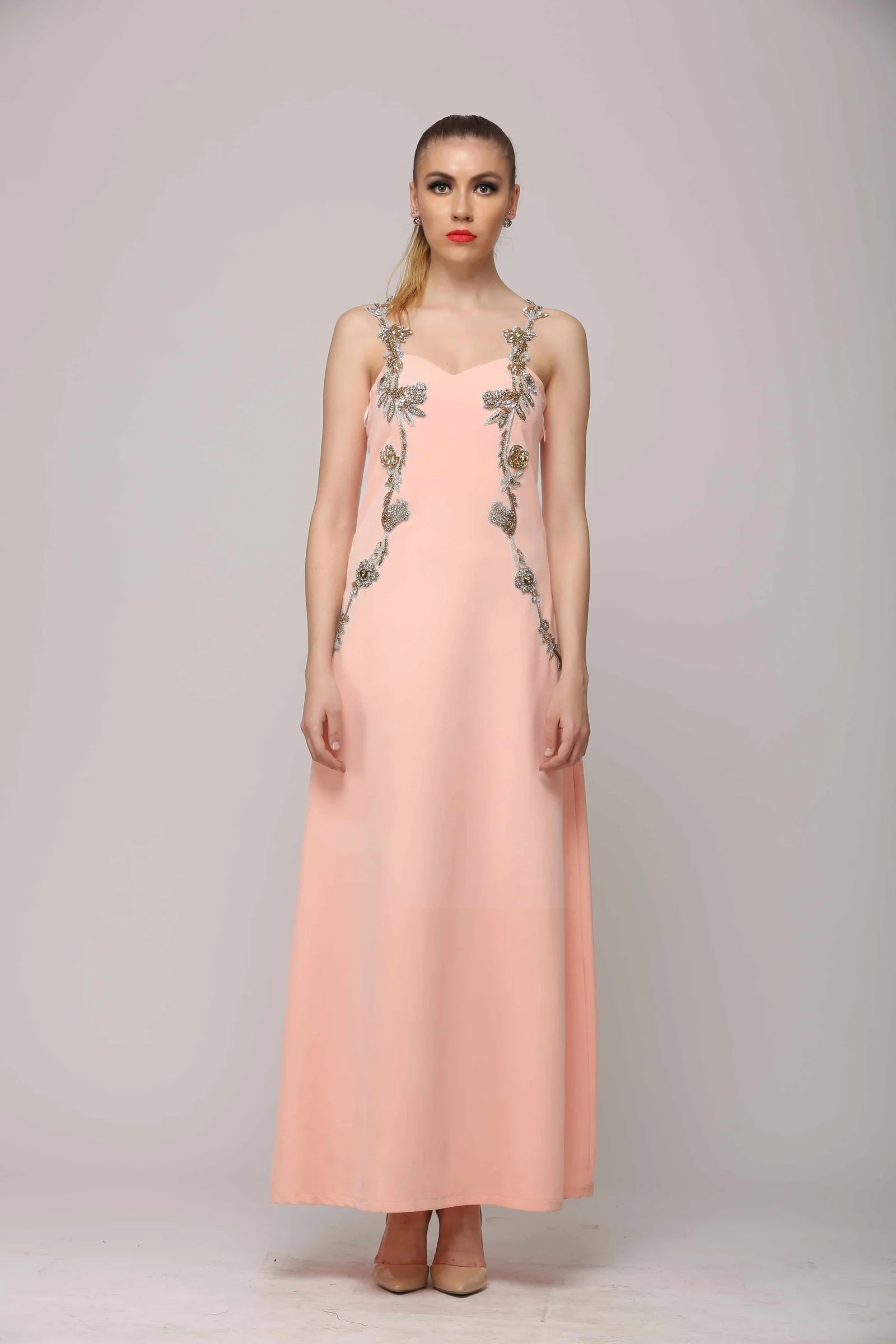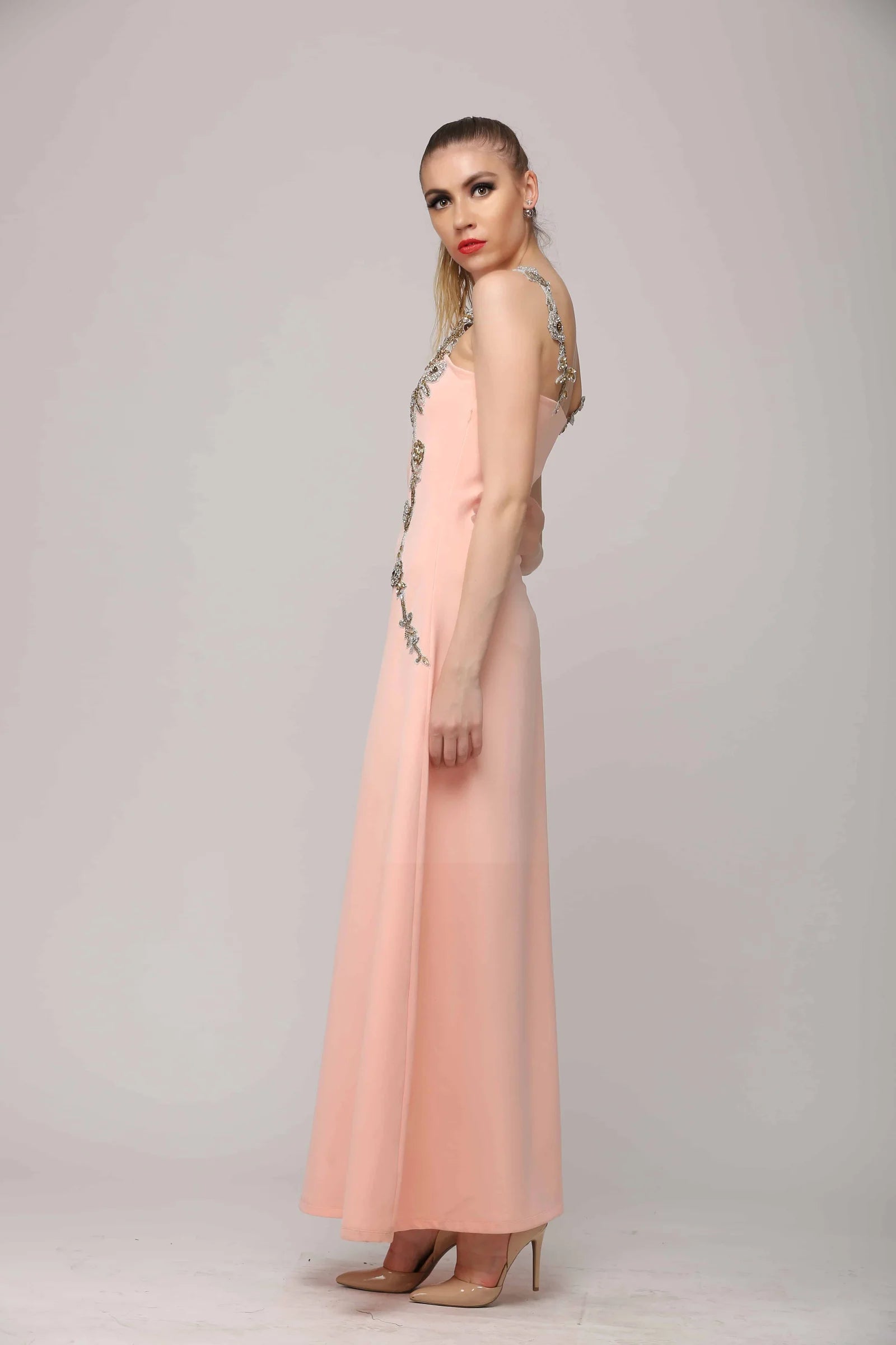 Glamorous Peach Gown - Imported Blended Barbie Crepe Gown Embellished with Crystal and Beads Embroidery.