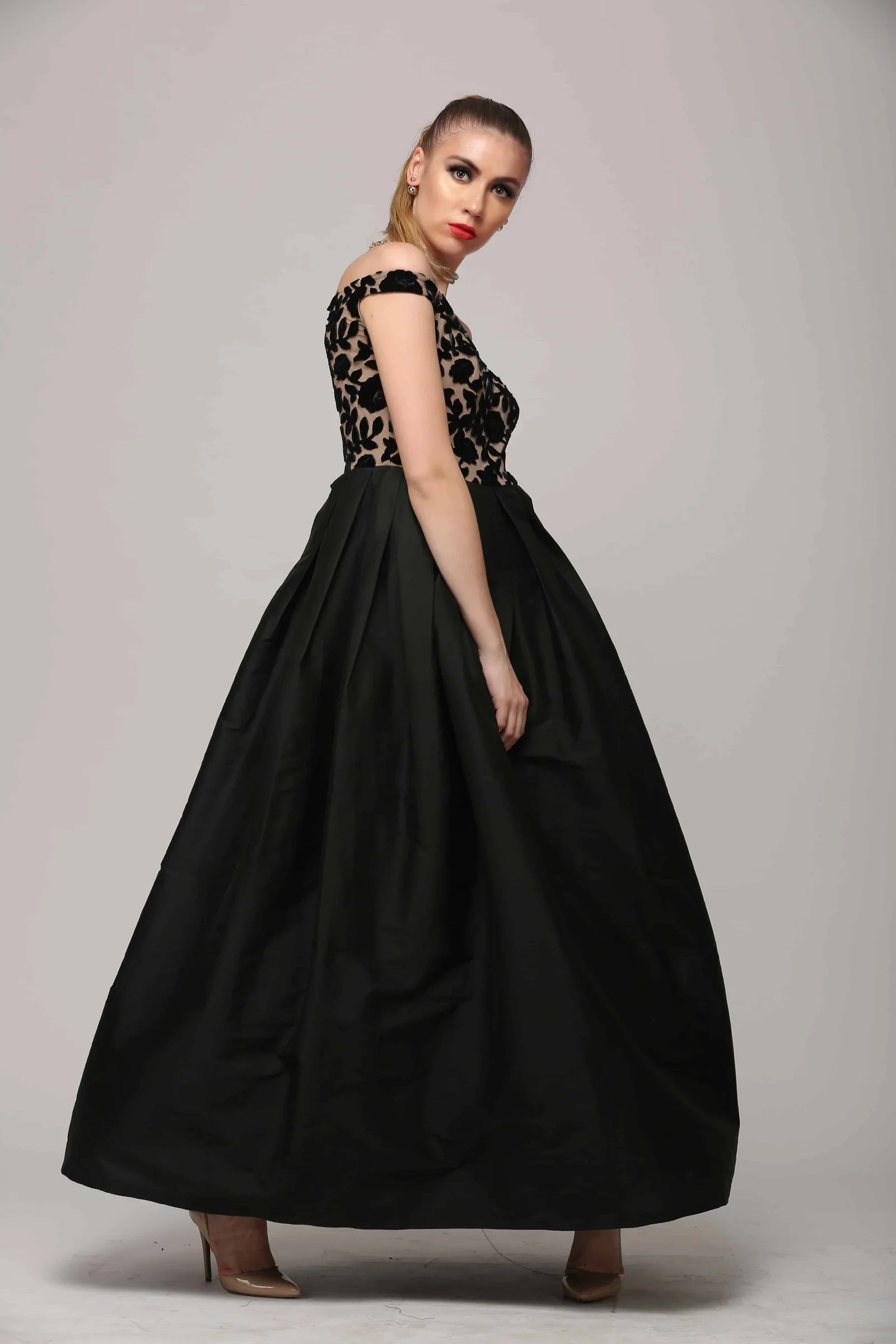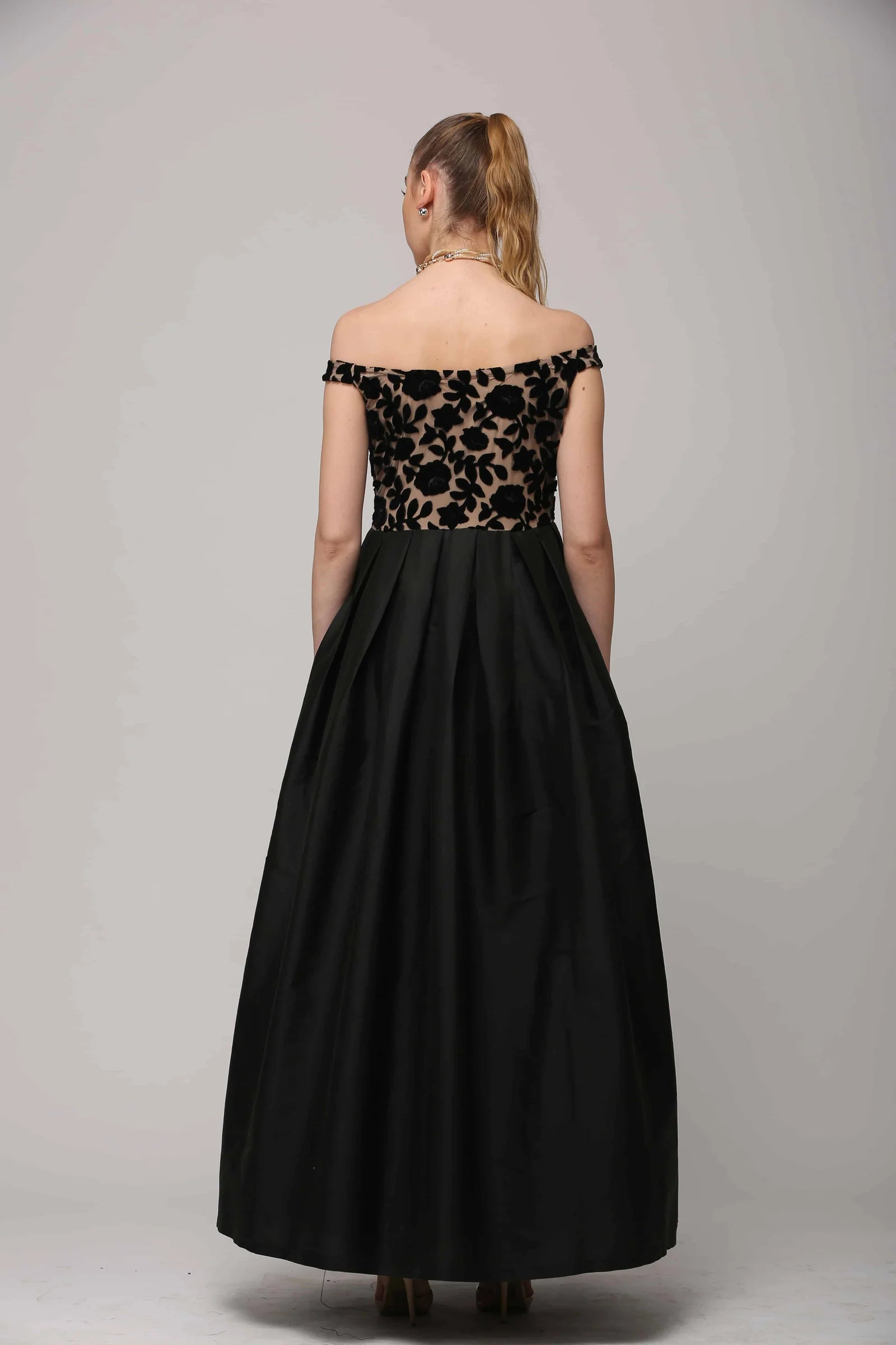 Sizzling Black Gown - Black Silk Gown in Box Pleats, Bodice Defines Black Velvet Applique Work.